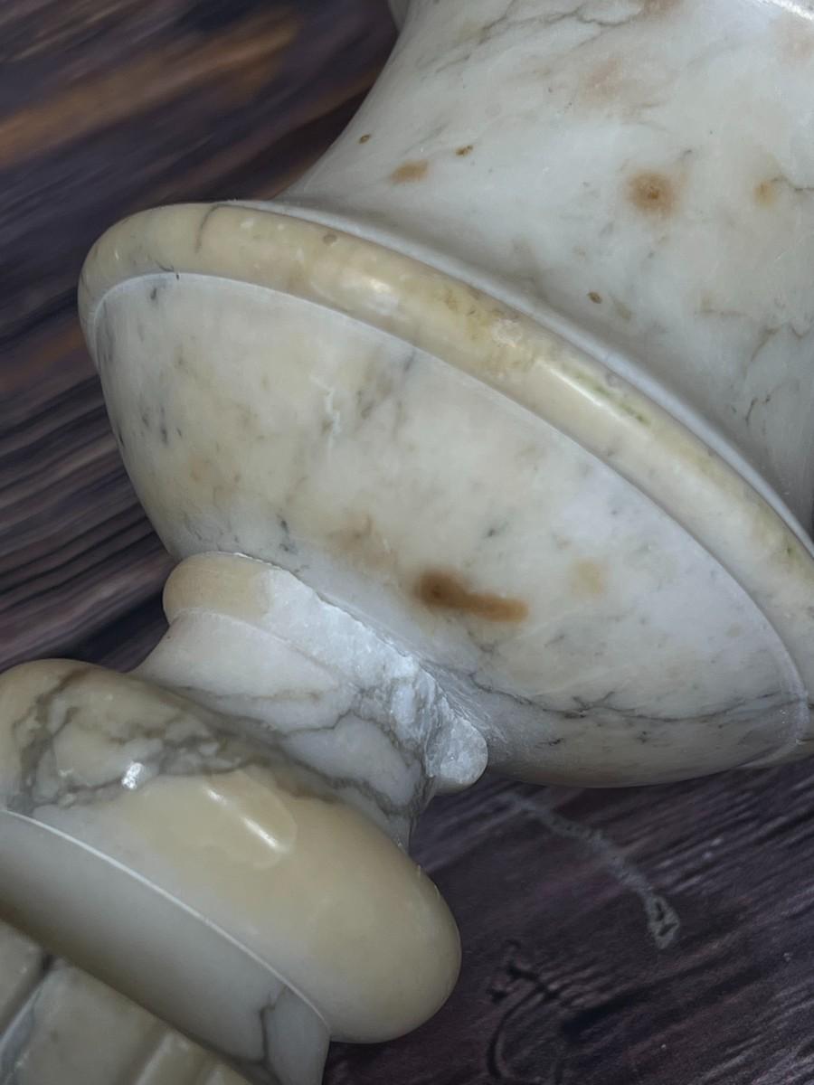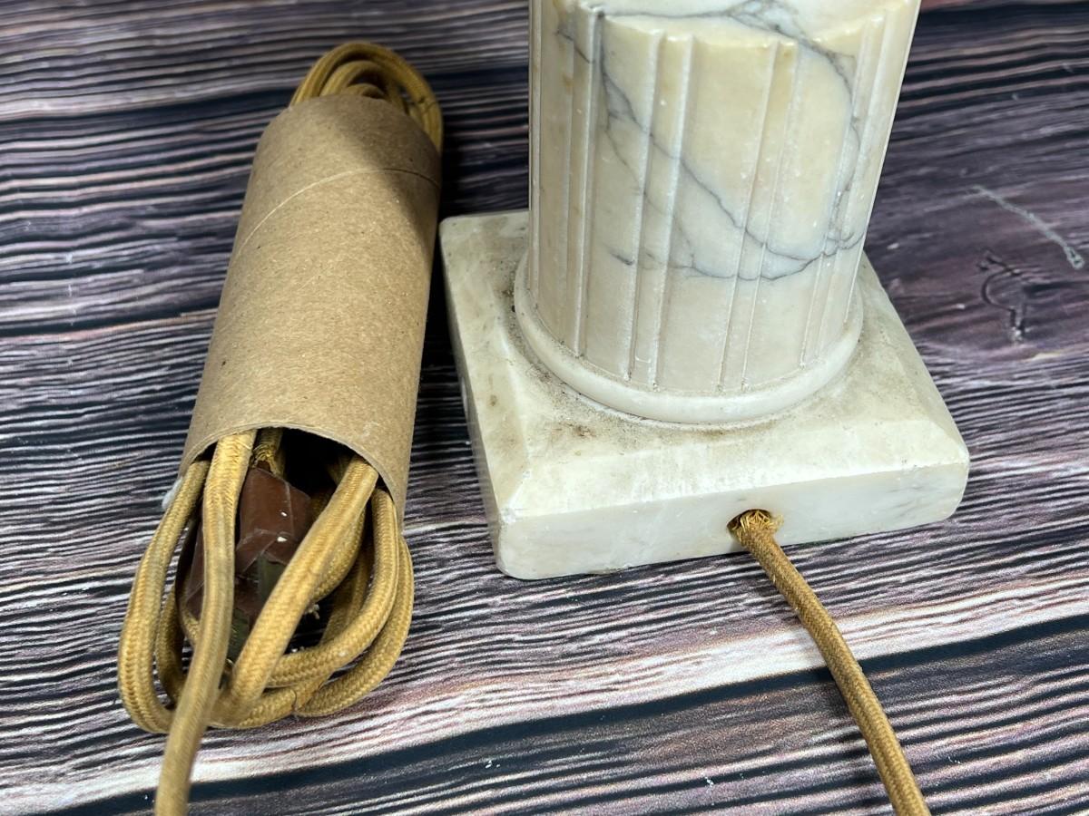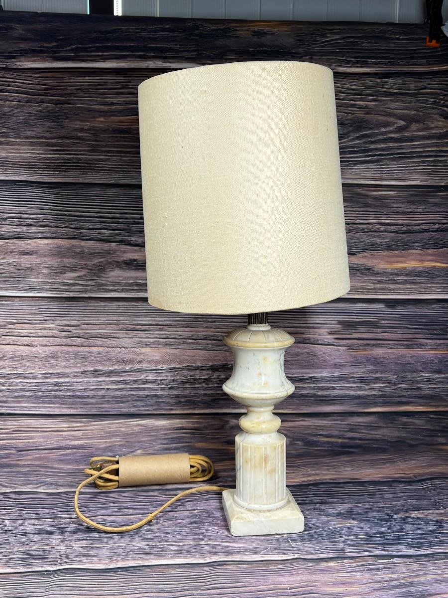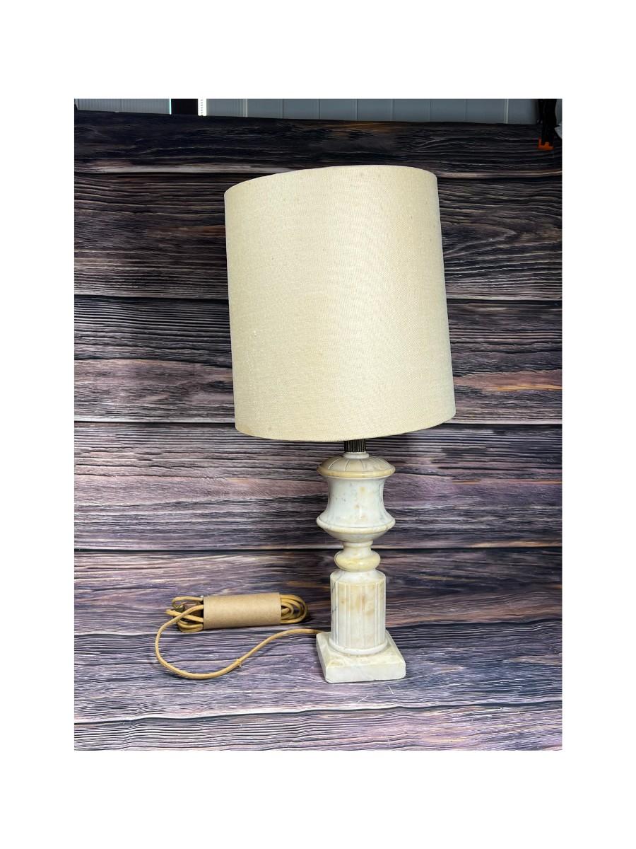 Modern Home Faux Marble Side Table Lamp, the lamp shade is bent and leans to one side and there is a small crack. Does not come with a lightbulb and has not been tested, the base needs to be tightened and is a bit loose. Check pictures for more details and for sizing.
