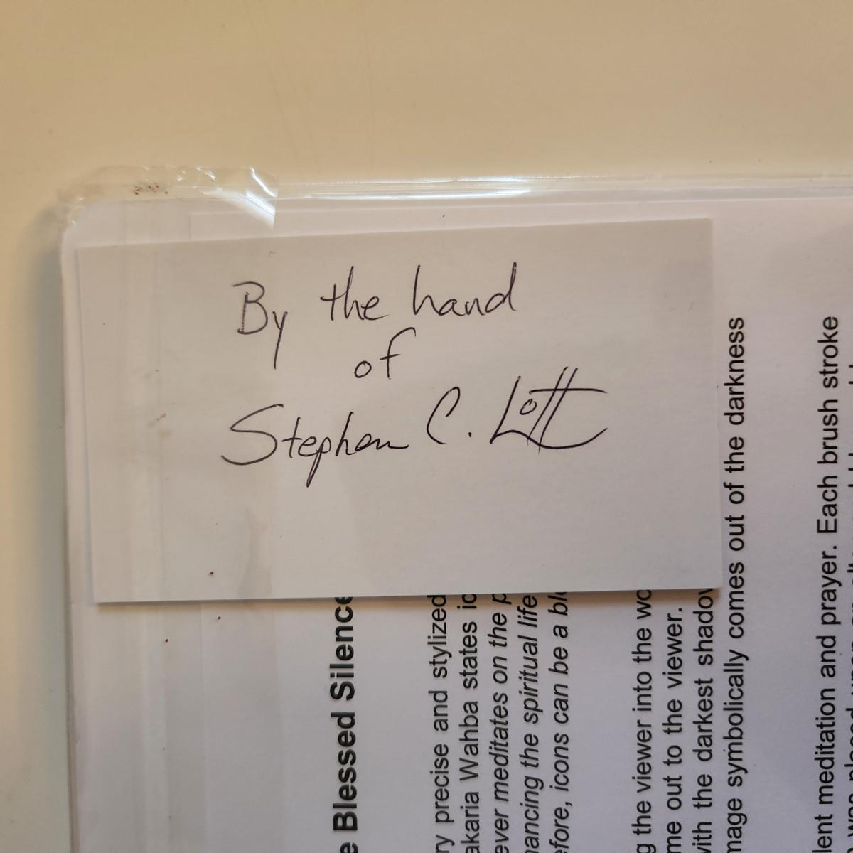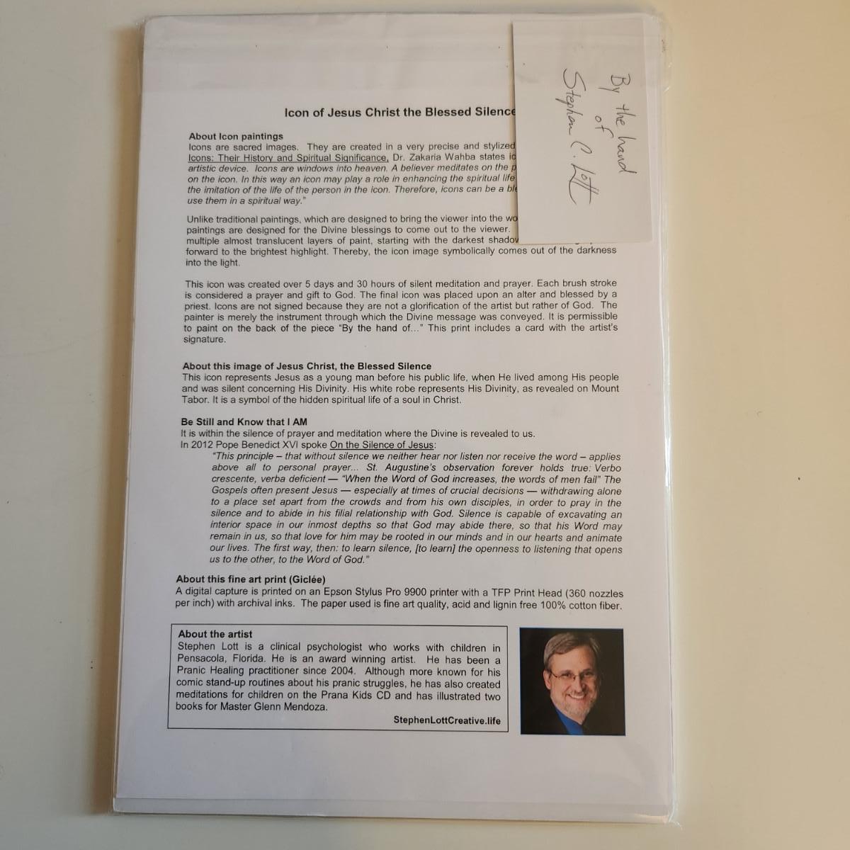 This auction lot is for a Modern Icon print. This print is of the Blessed Silence. Included with this print is a strong mounting board and a complete explanation of the icon. Also included is a signed business card by the artist.