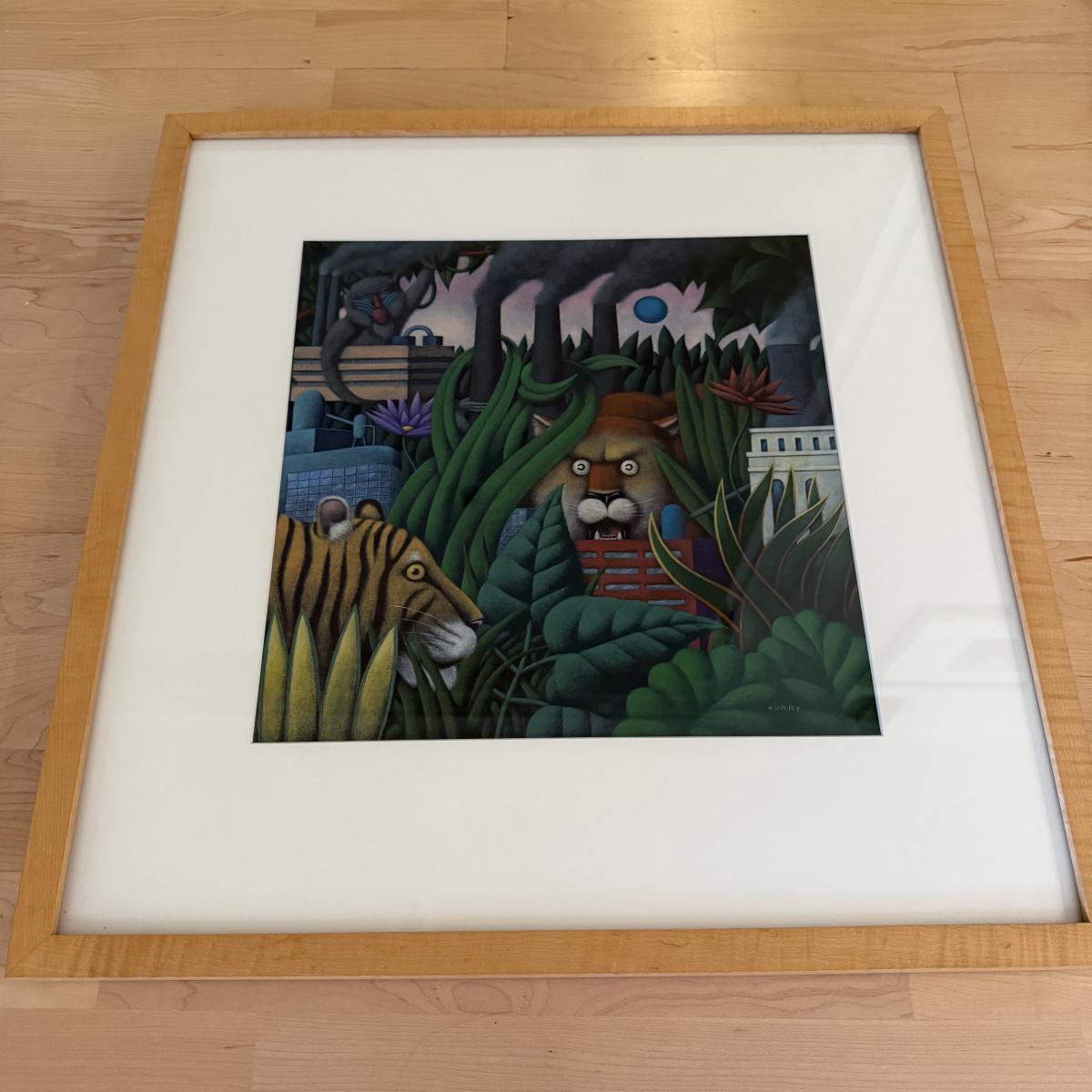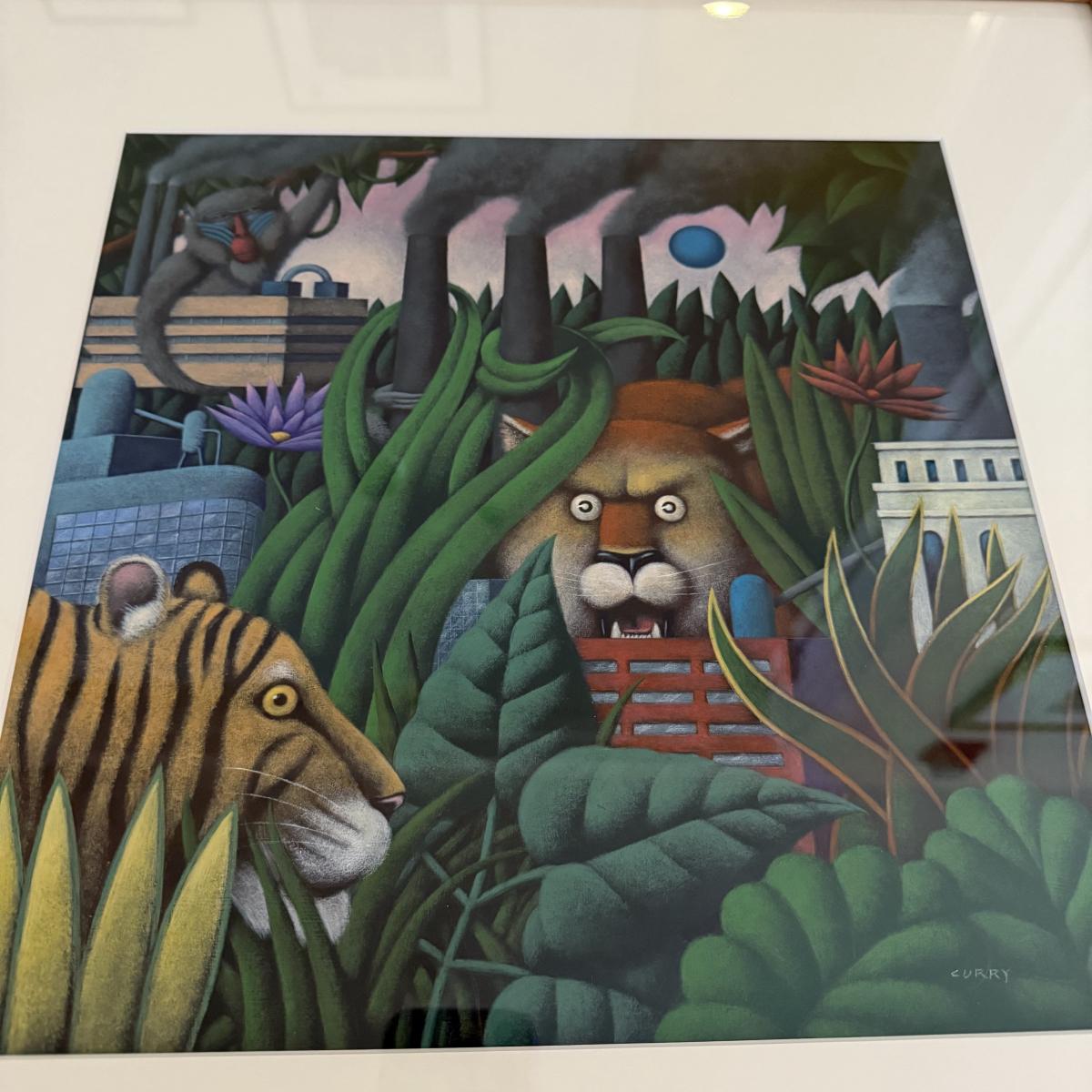 This lot contains a vibrant and thought-provoking print in a light wooden frame. It is done in the style of Orville Bulman. The artwork features big cats and other animals in a jungle with buildings. It measures 21” x 21.75” and includes hanging wire. This piece is signed ‘CURRY’ in the bottom right corner. Unsure if it is printed signature or not as it is under glass. Shipping available.