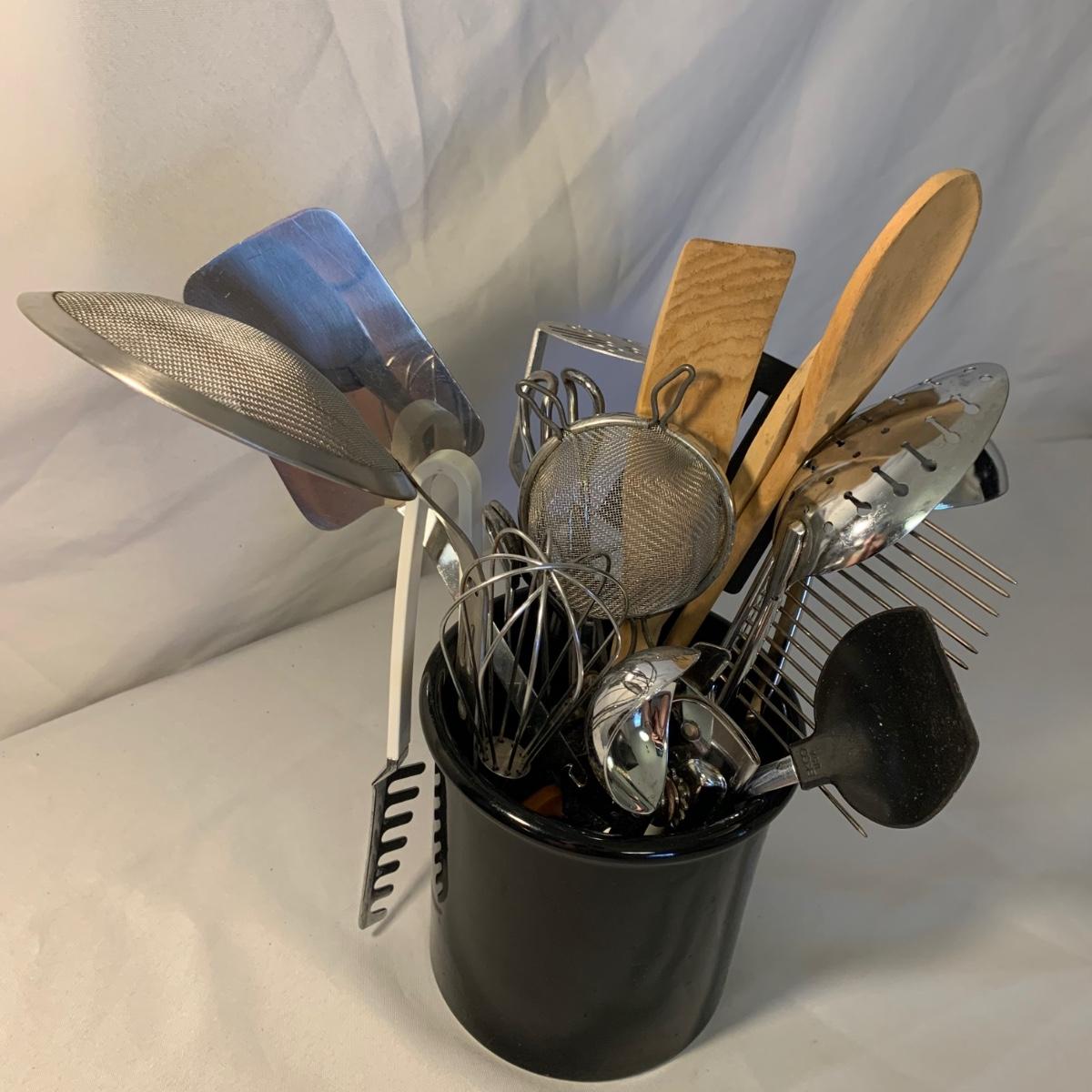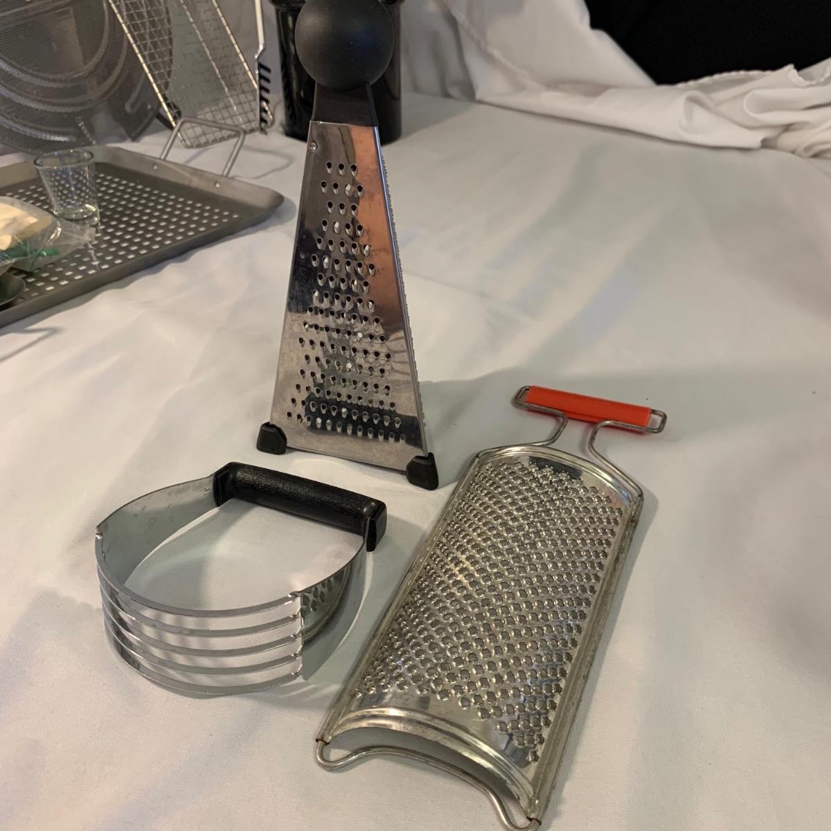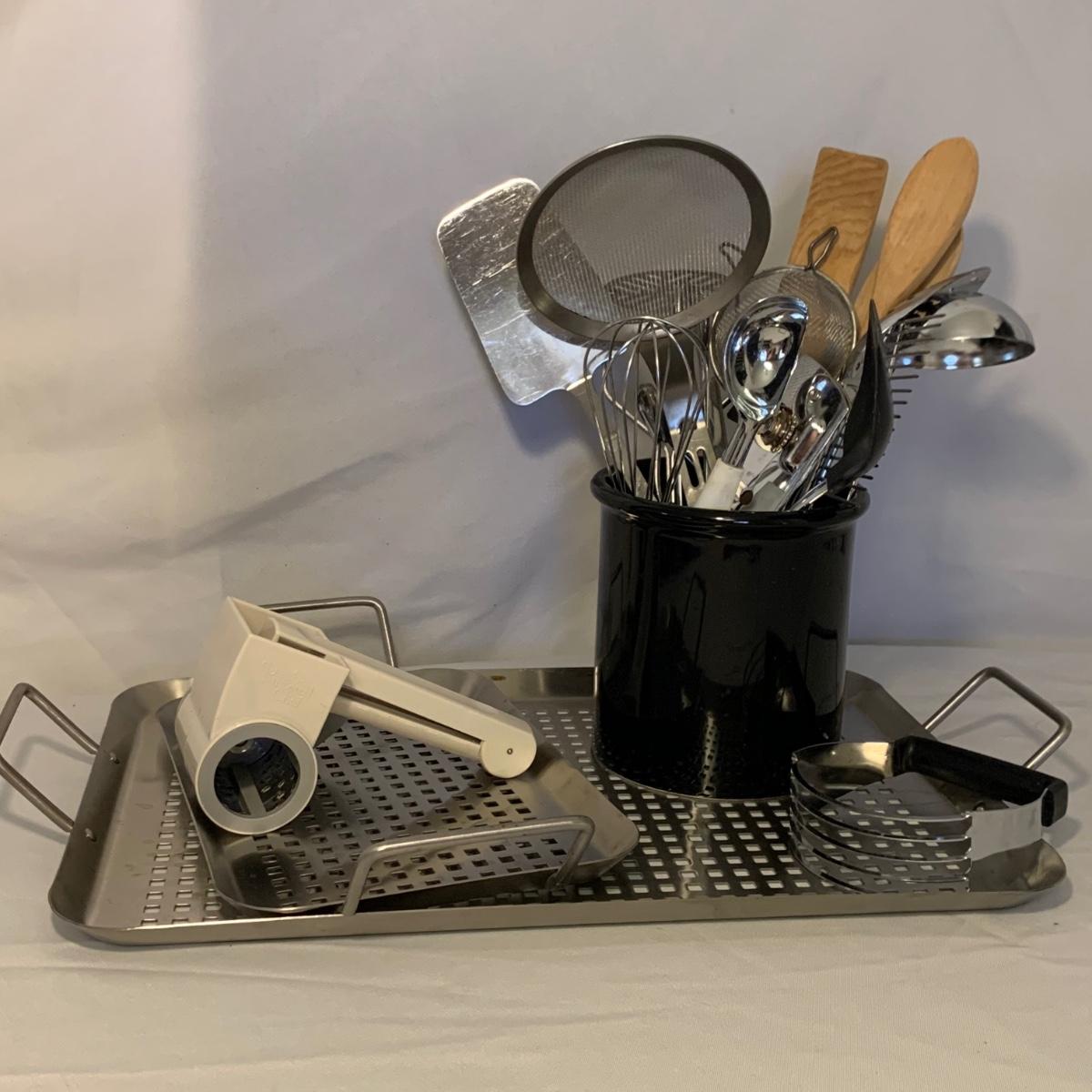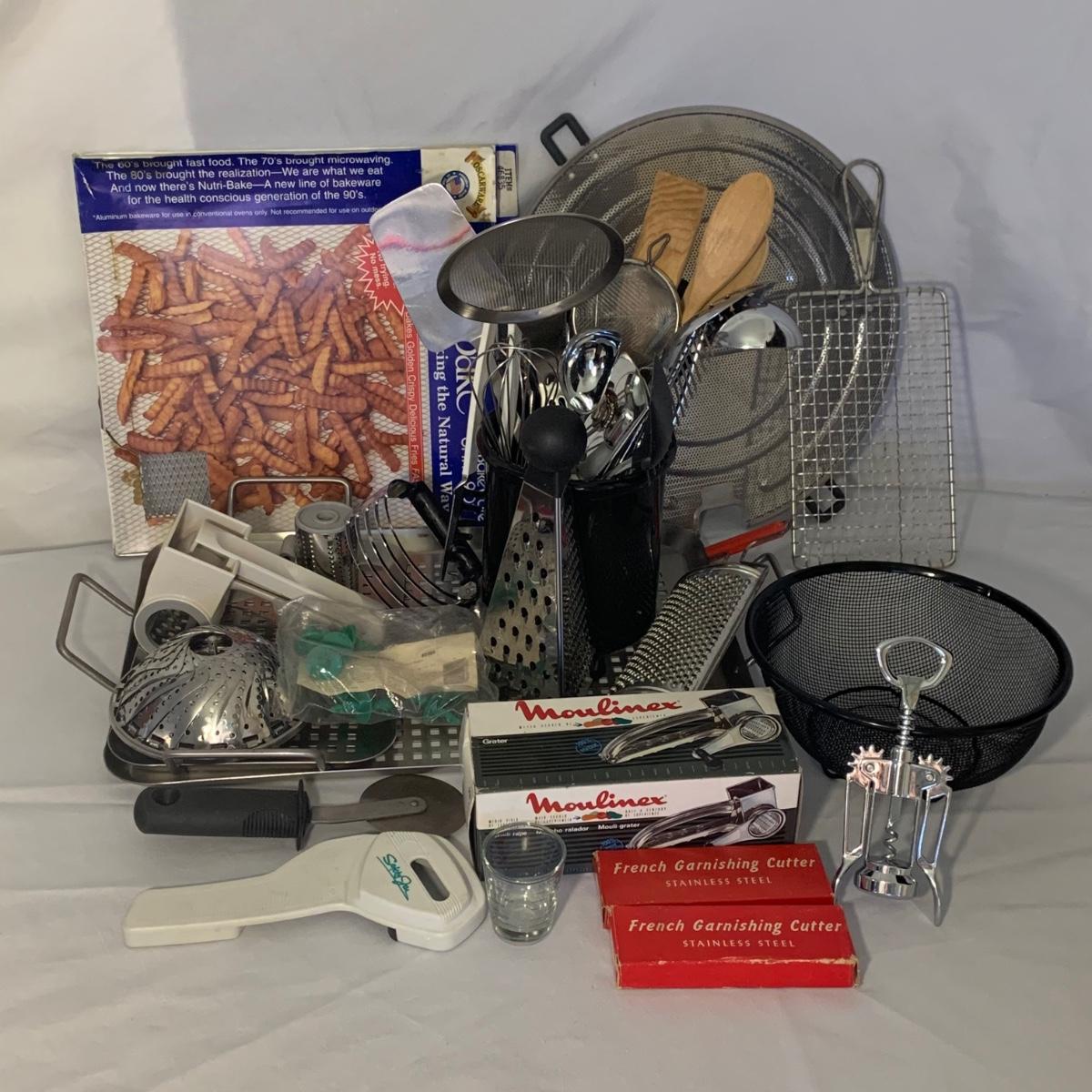A collection of essential kitchen utensils including a can open, a jar opener, a metal spatula, tongs, a whisk, an ice cream scoop, a pizza cutter, wooden spoons, a few different graters, a steamer basket, two French garnishing cutters, baking trays, and more. Items are in good to like-new condition.