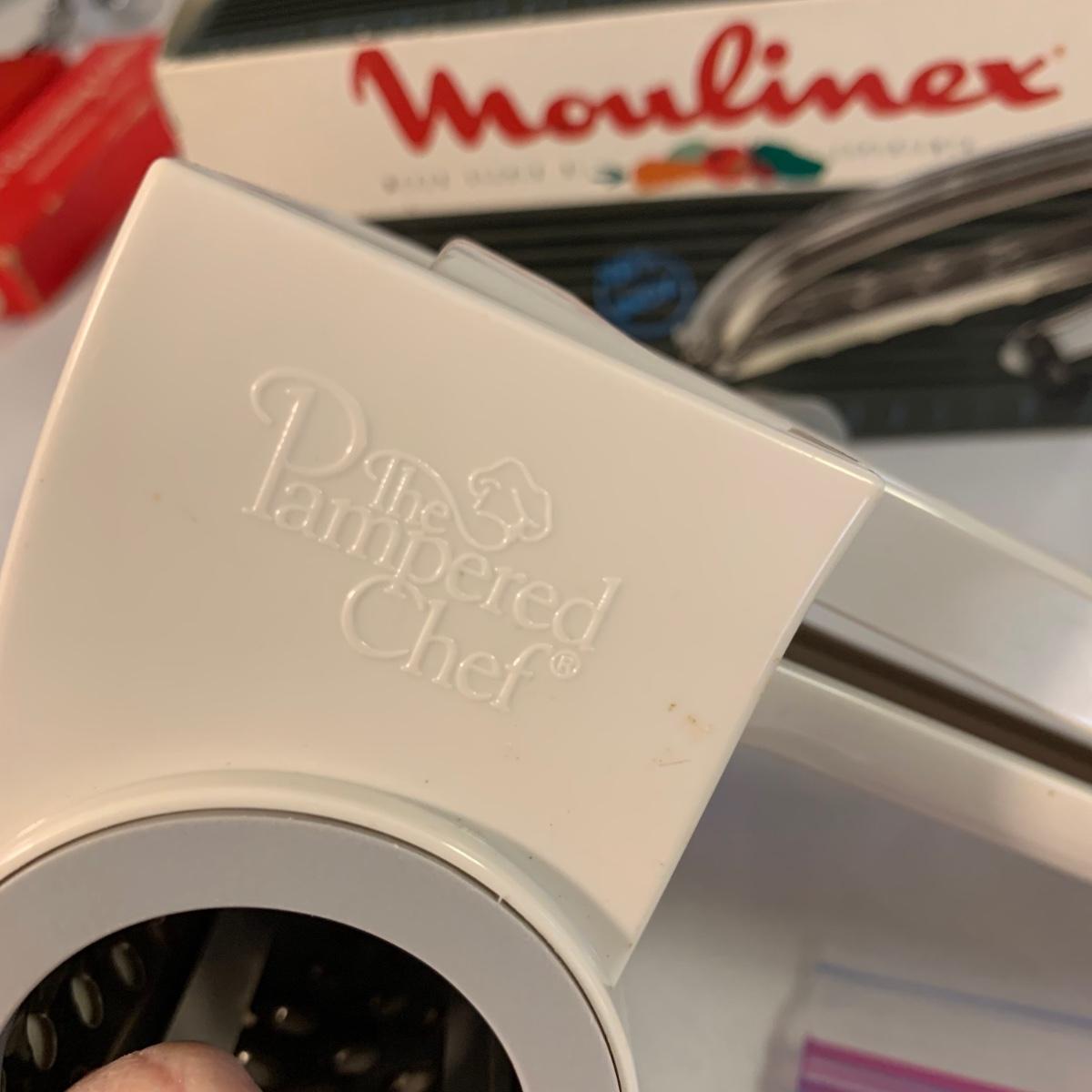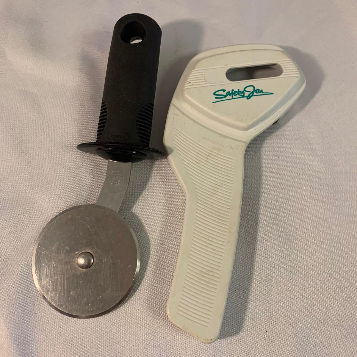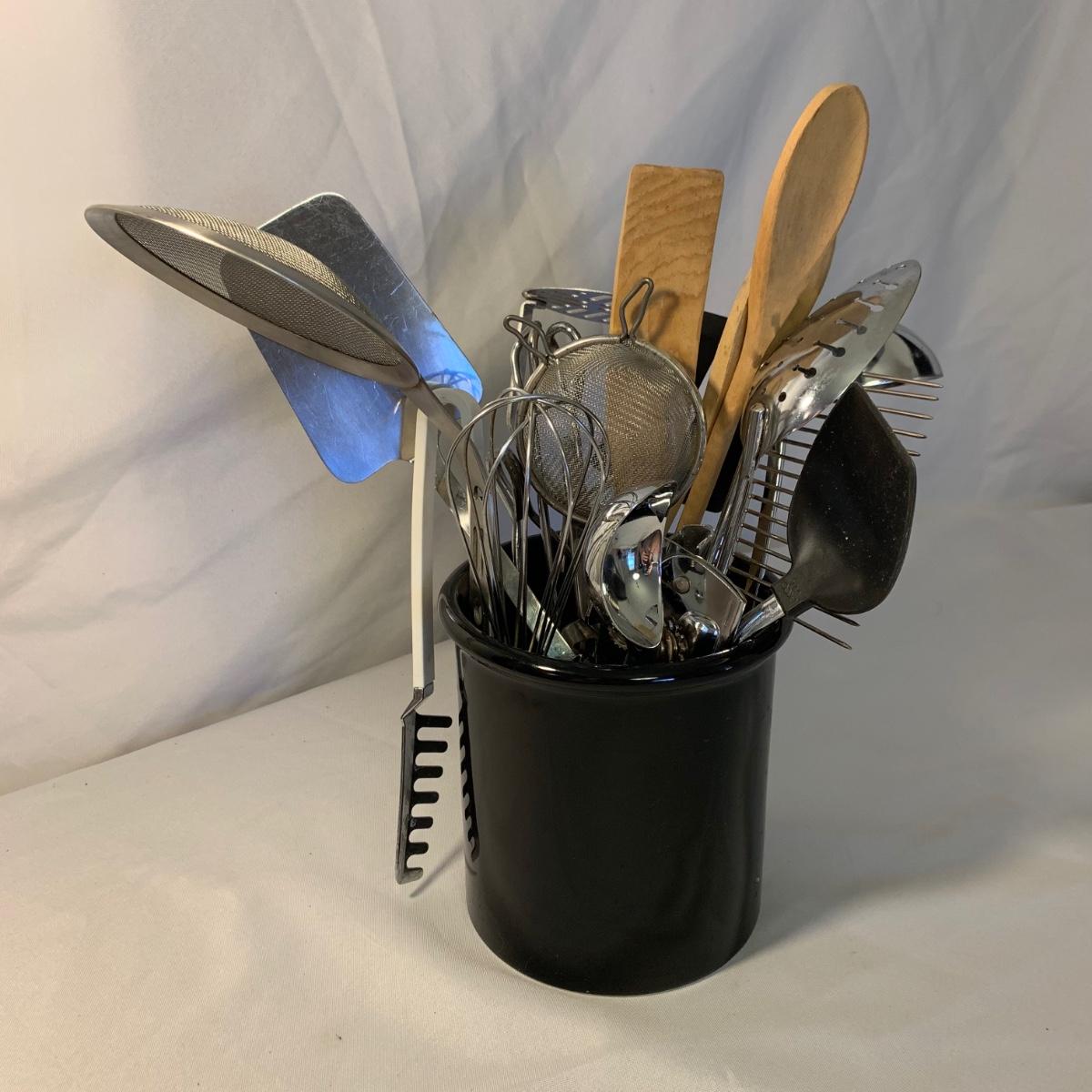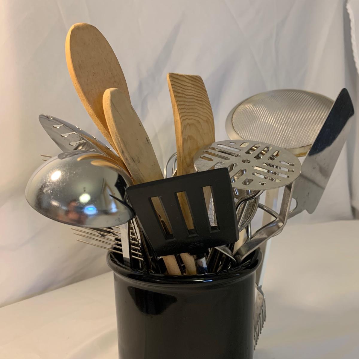 A collection of essential kitchen utensils including a can open, a jar opener, a metal spatula, tongs, a whisk, an ice cream scoop, a pizza cutter, wooden spoons, a few different graters, a steamer basket, two French garnishing cutters, baking trays, and more. Items are in good to like-new condition.