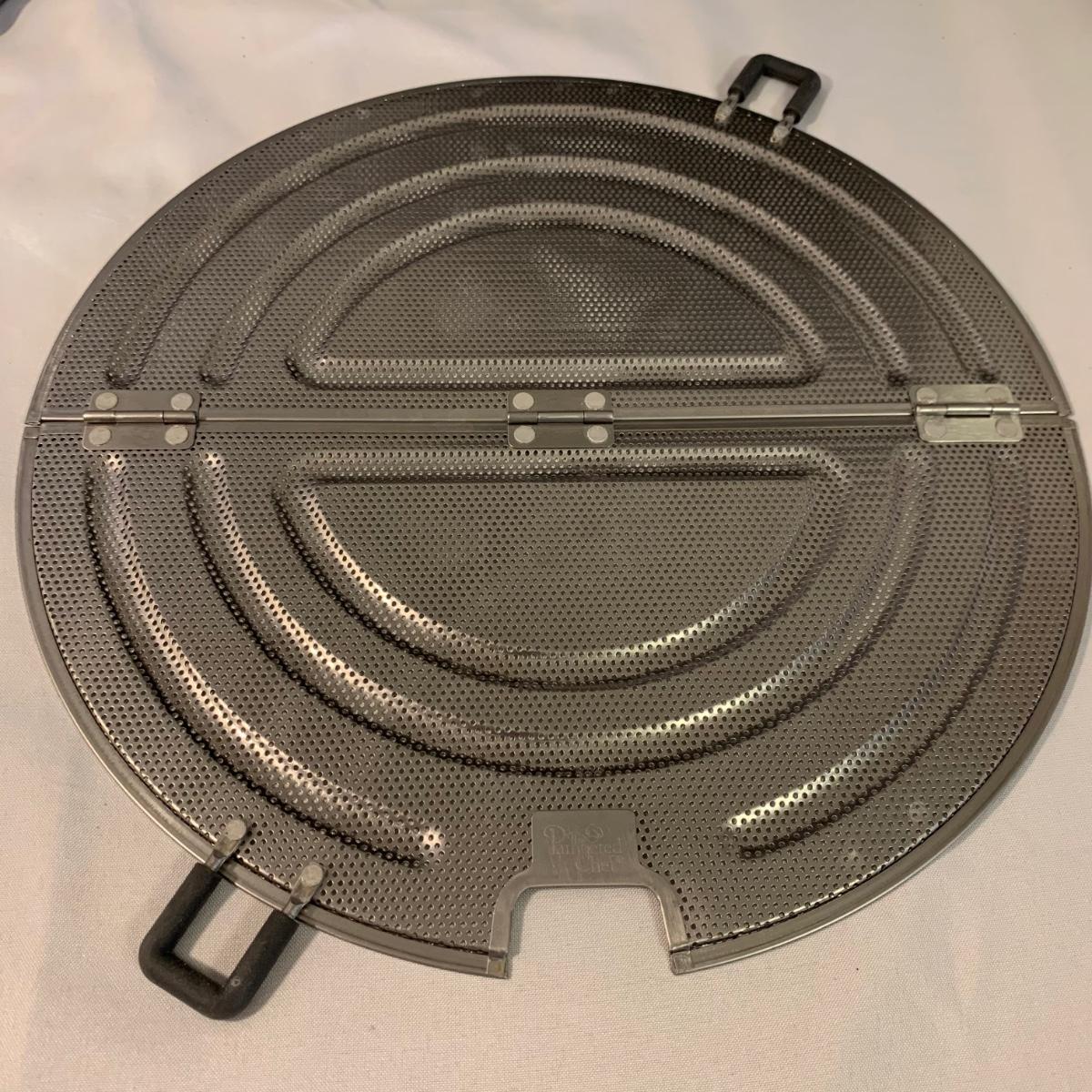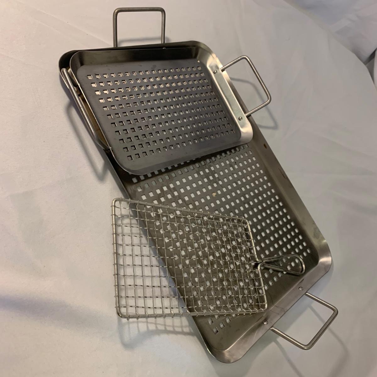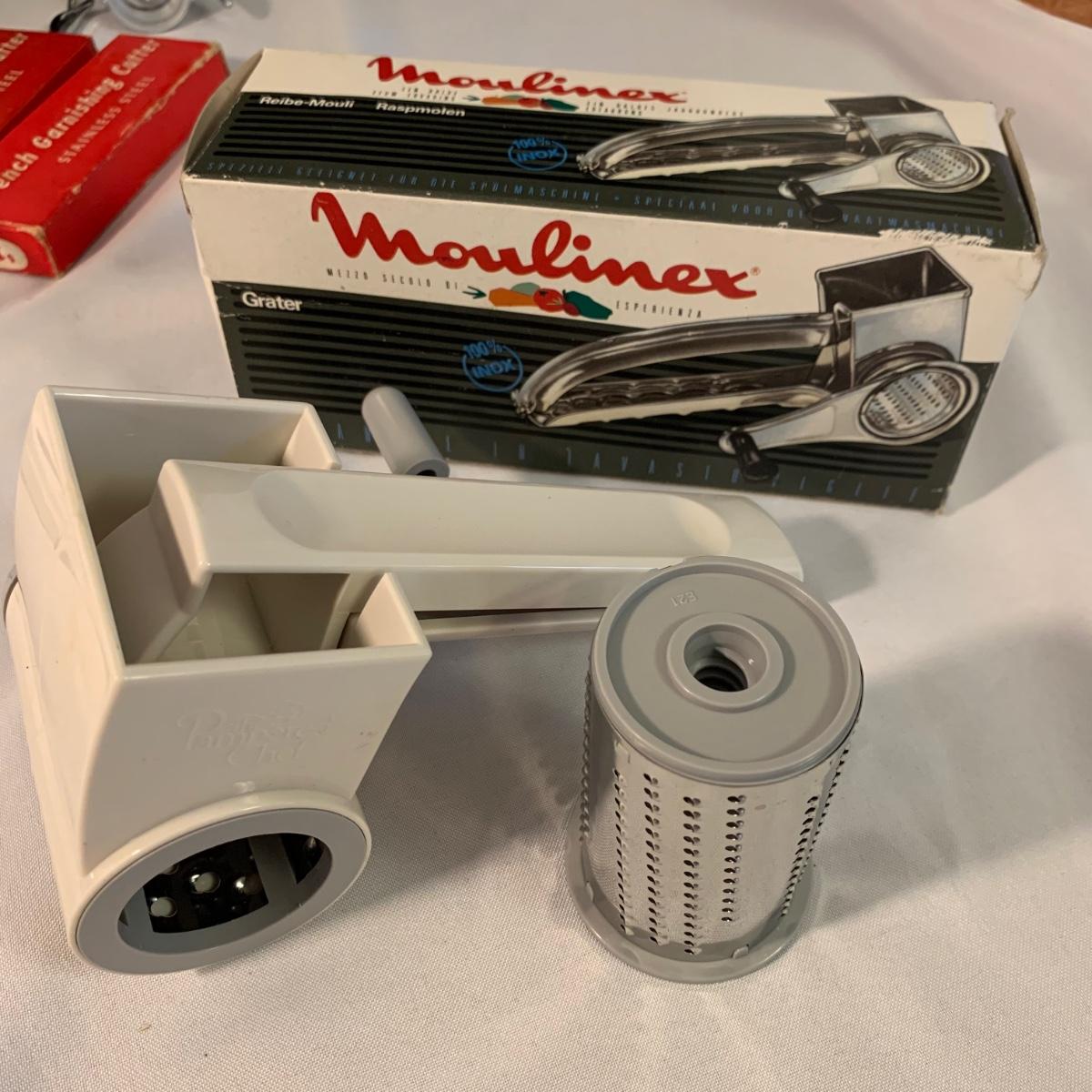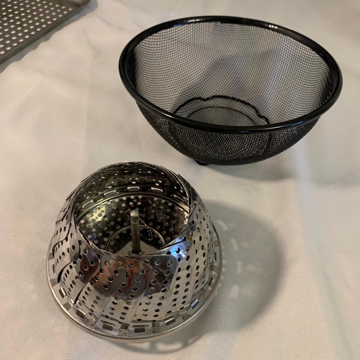 A collection of essential kitchen utensils including a can open, a jar opener, a metal spatula, tongs, a whisk, an ice cream scoop, a pizza cutter, wooden spoons, a few different graters, a steamer basket, two French garnishing cutters, baking trays, and more. Items are in good to like-new condition.