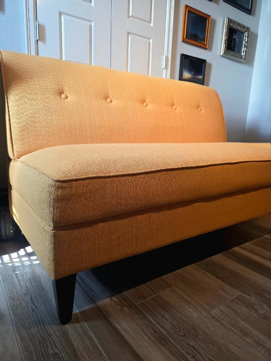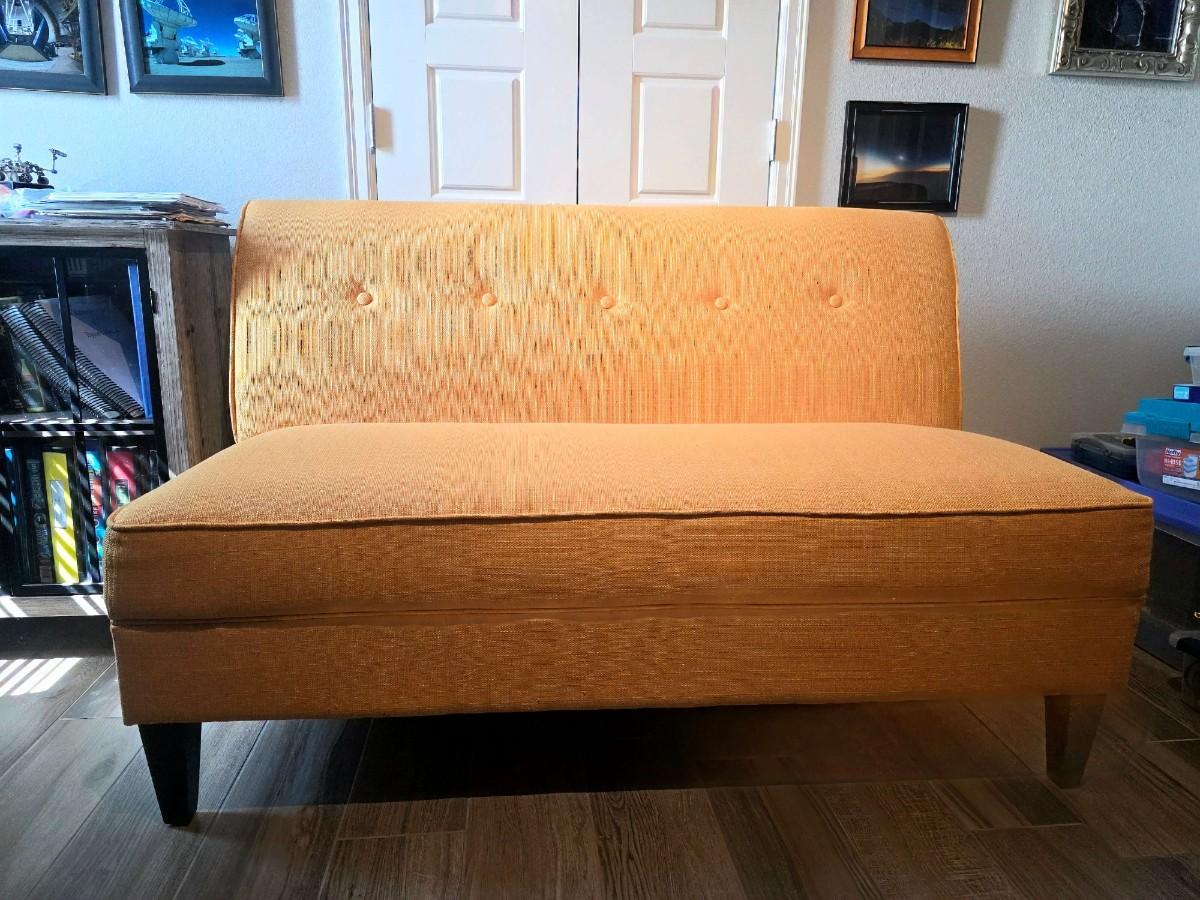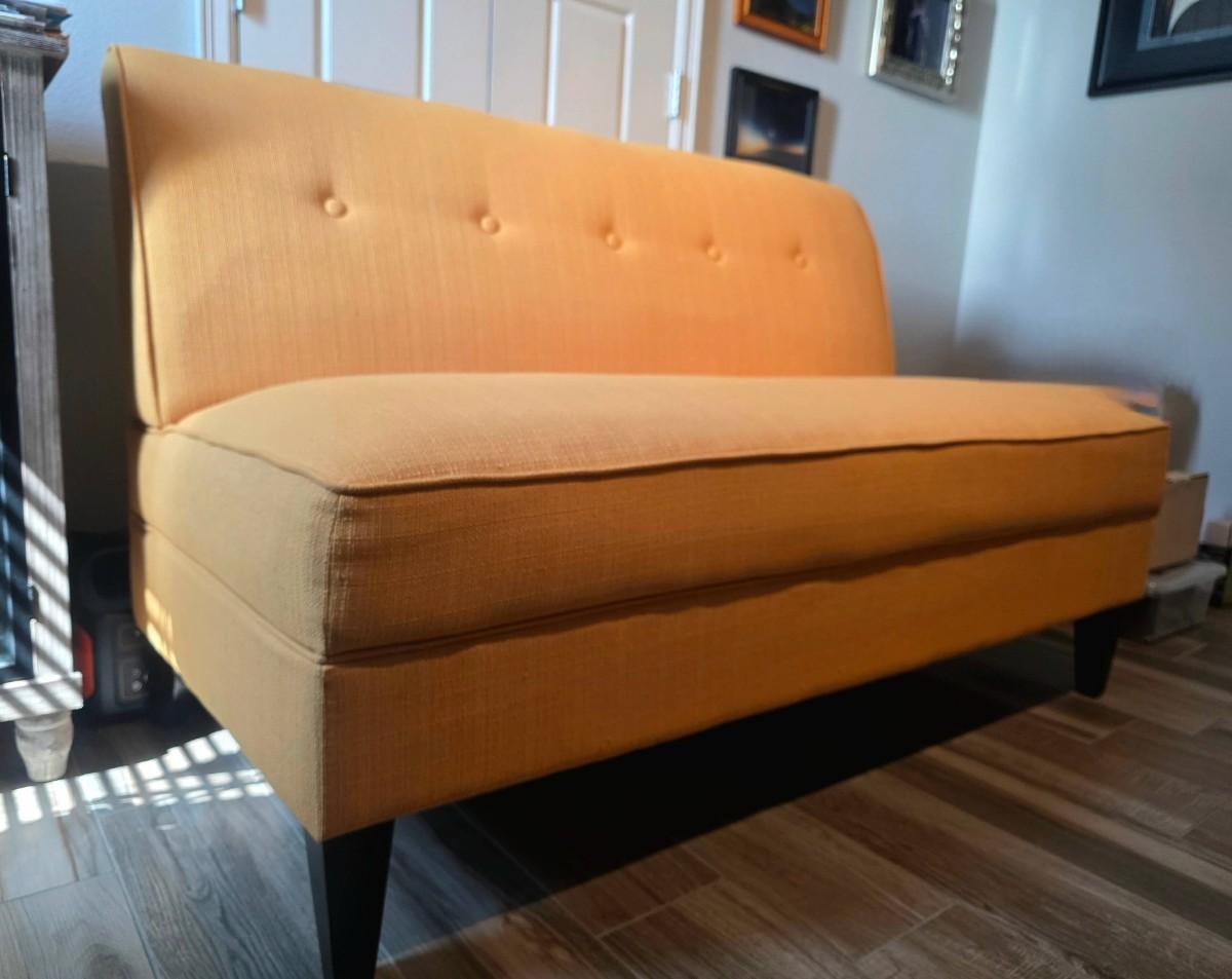 Modern loveseat sofa in sunset yellow woven upholstery. Originally purchased from Wayfair less than 2 years ago. Like new condition in a clean, climate controlled, smoke free home.