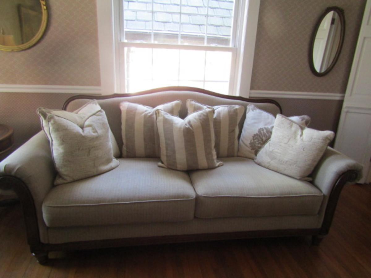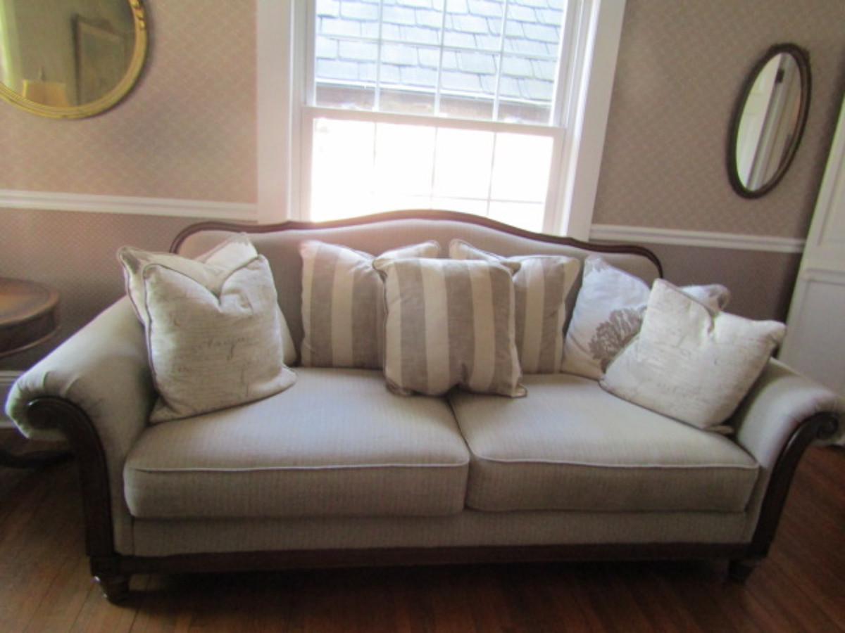 Modern Made Victorian Style Camelback Sofa. In like new condition. Non-smoking home with loving pet in house.