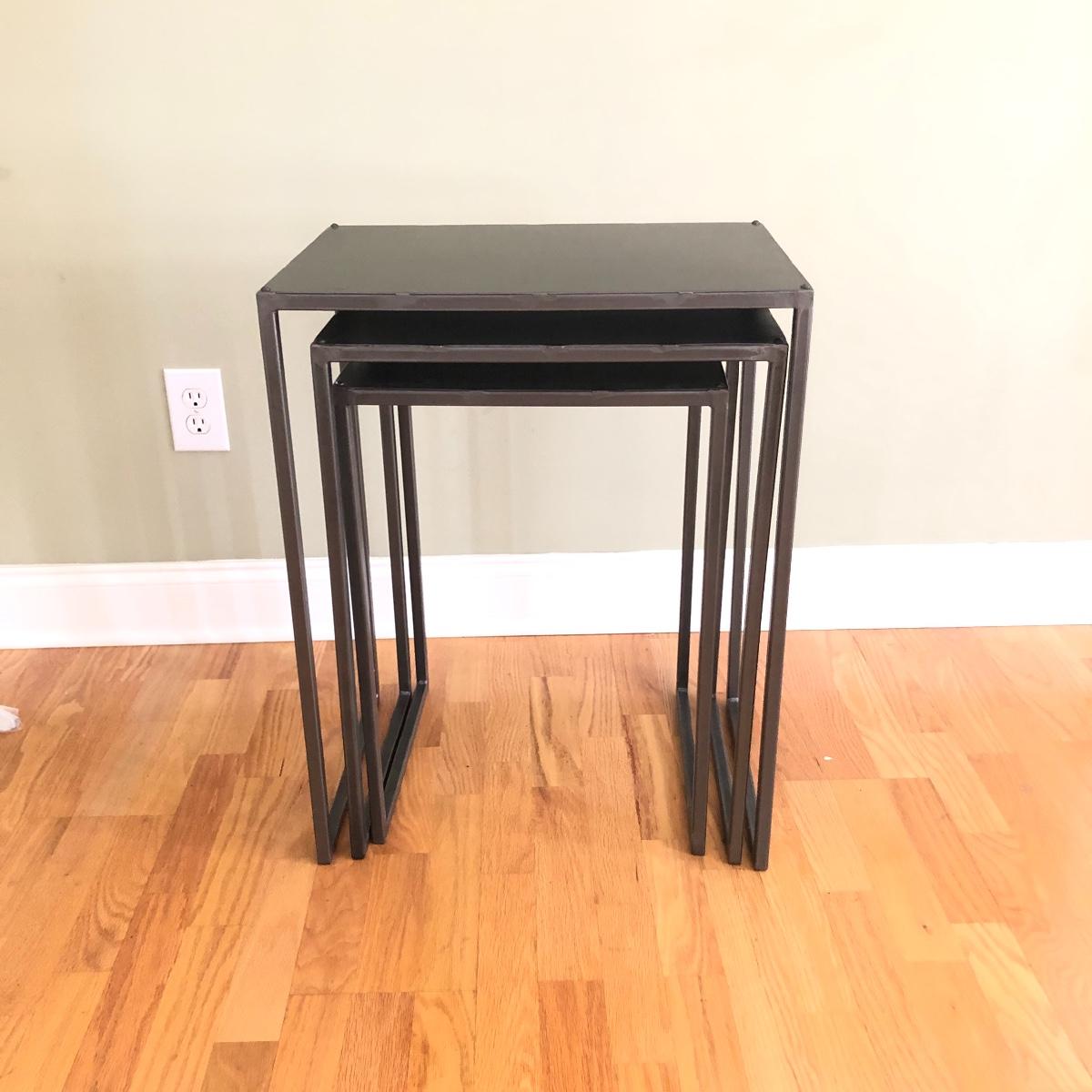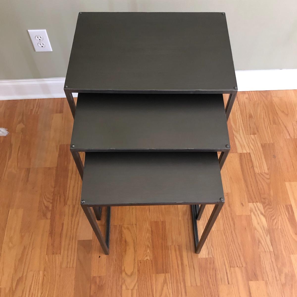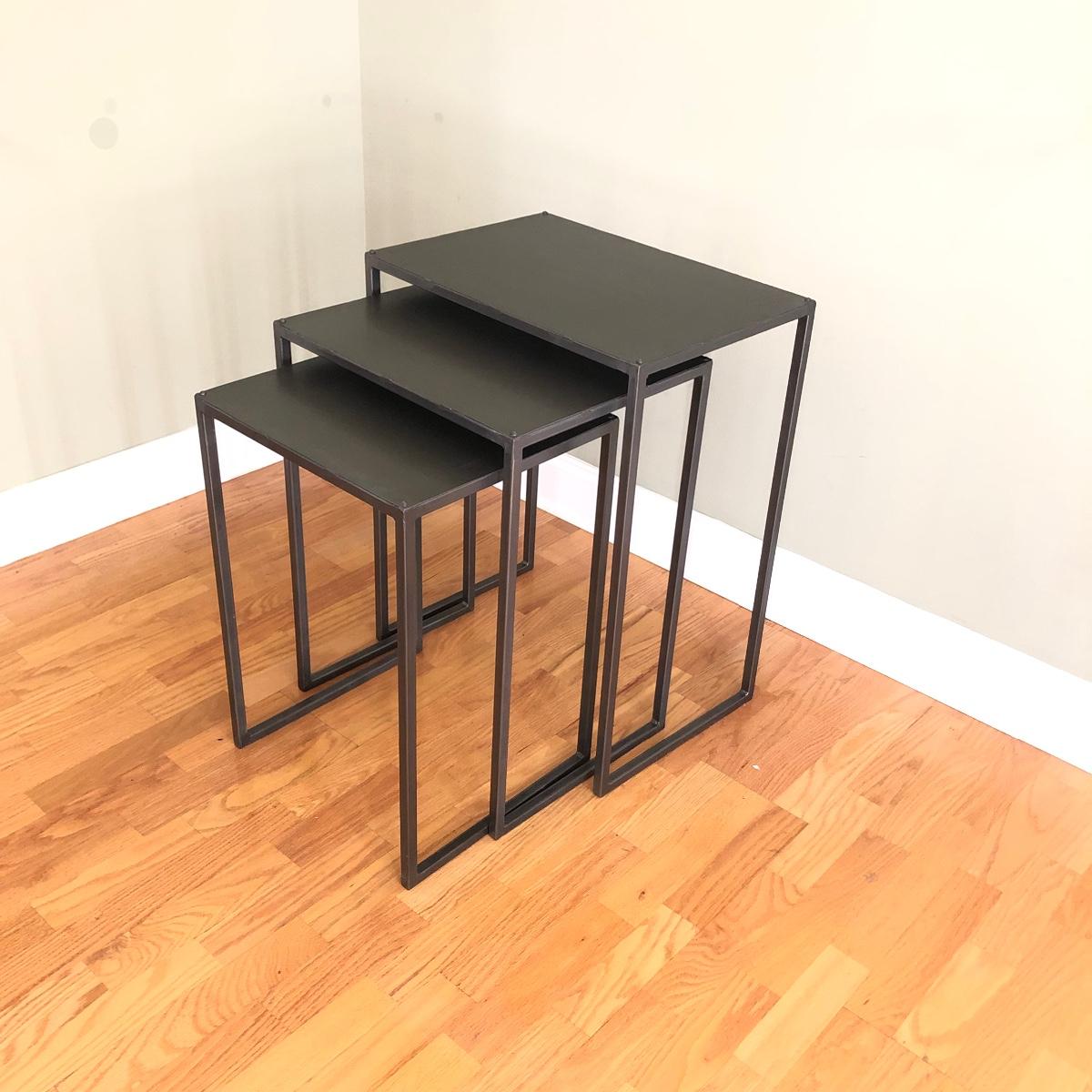 A sleek set of three grey metal nesting tables here, largest table measures 14” x 20” x 26”. A few dings on the fronts of the medium and small tables.