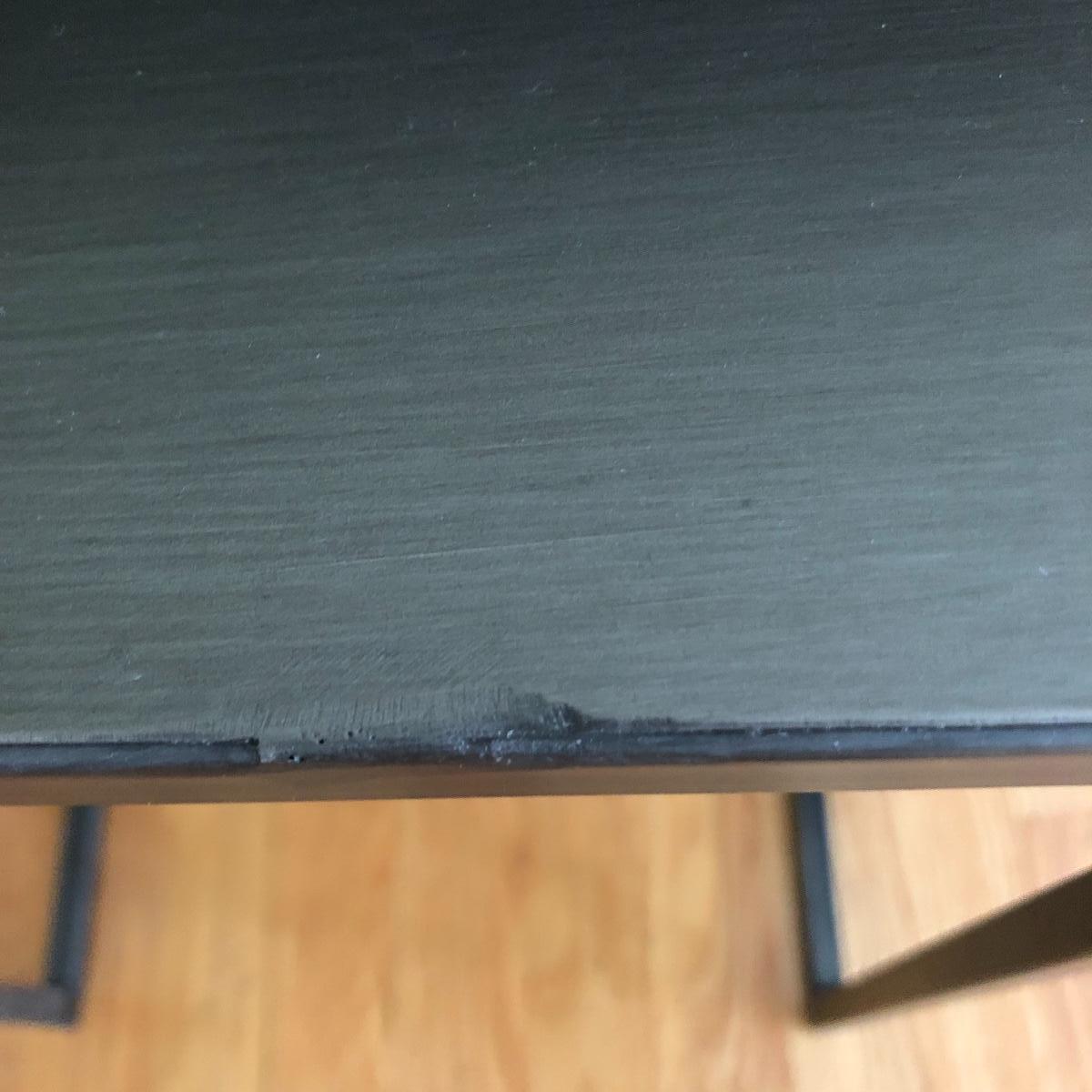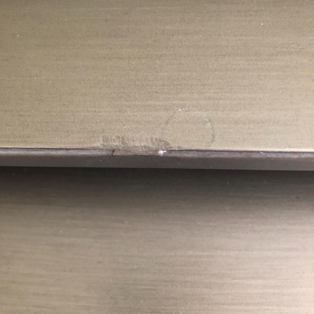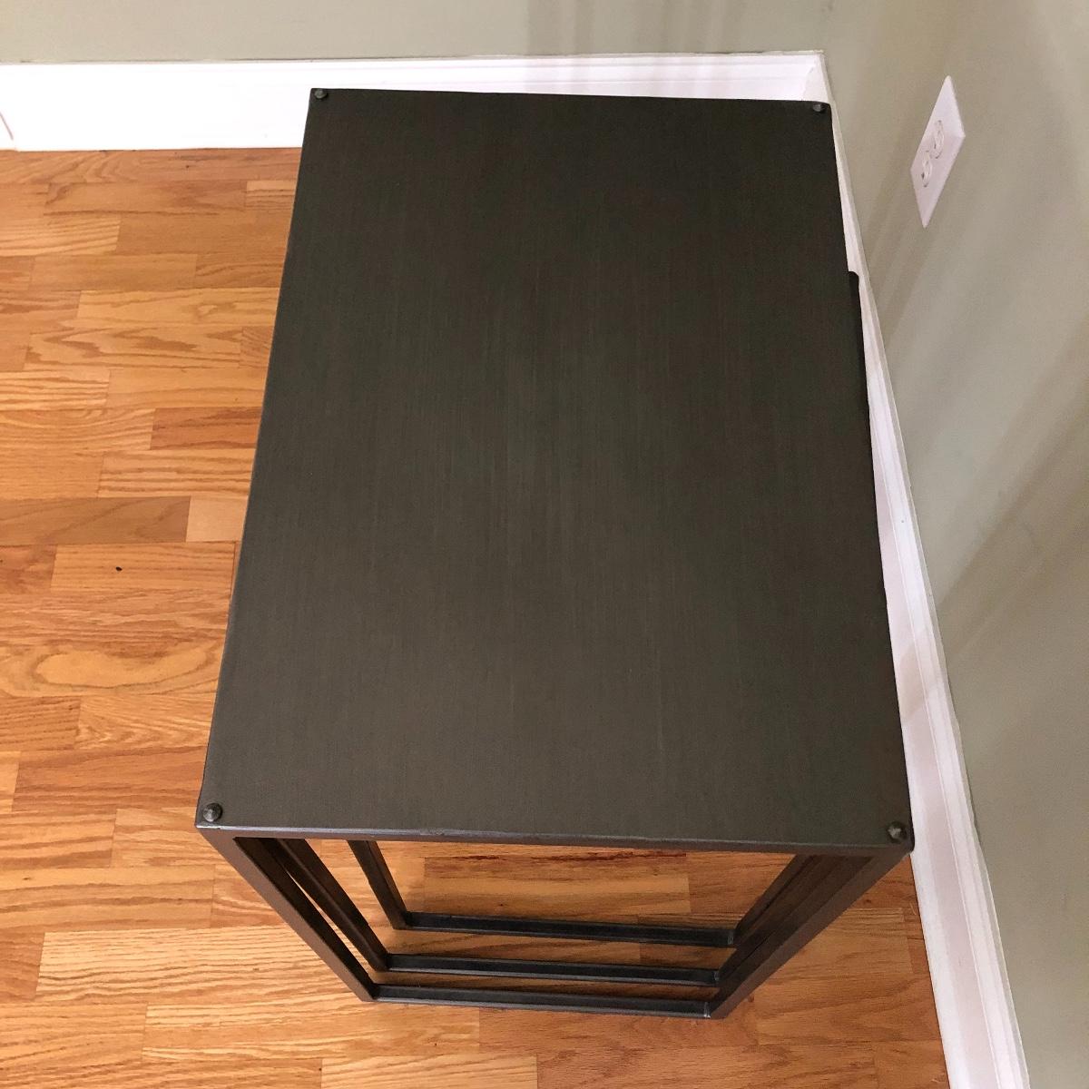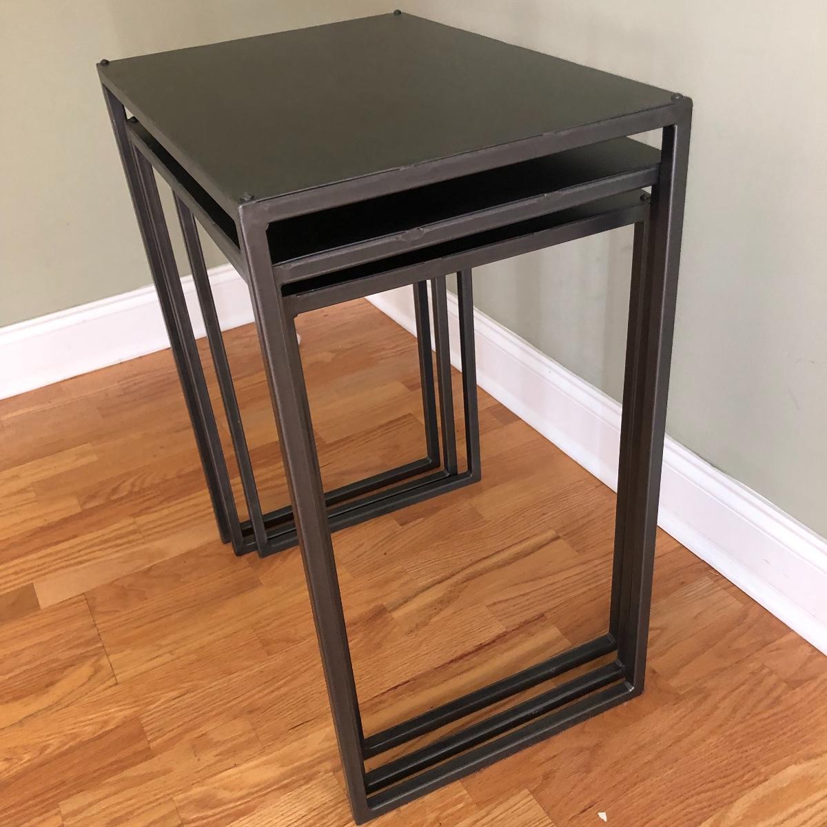 A sleek set of three grey metal nesting tables here, largest table measures 14” x 20” x 26”. A few dings on the fronts of the medium and small tables.