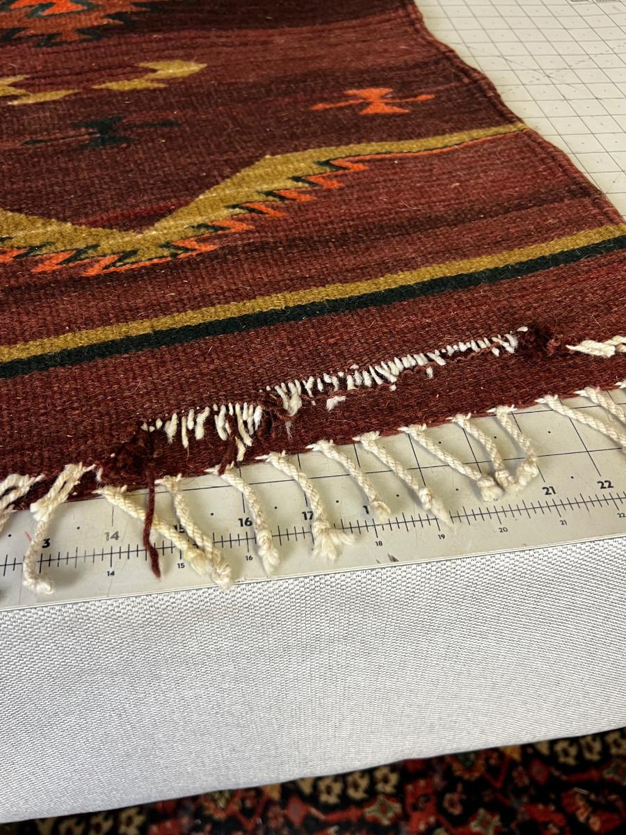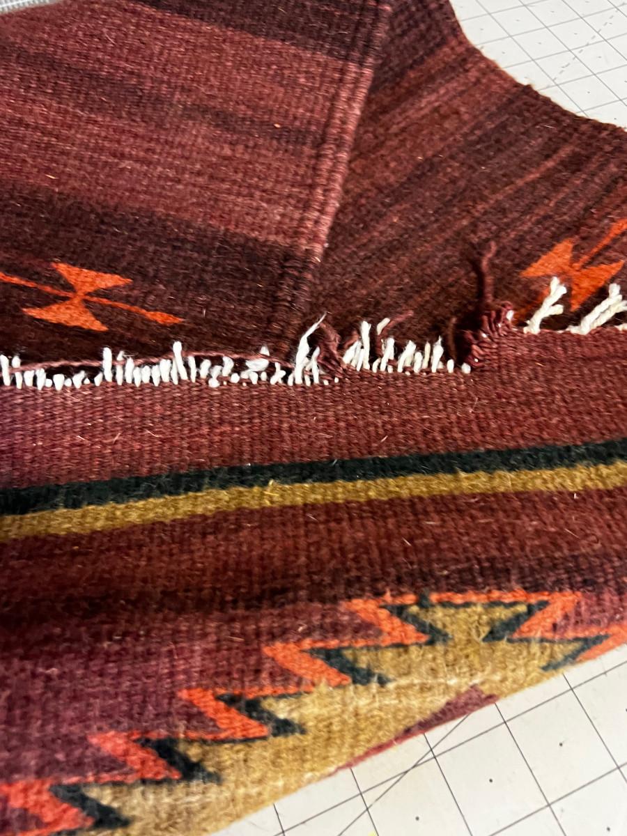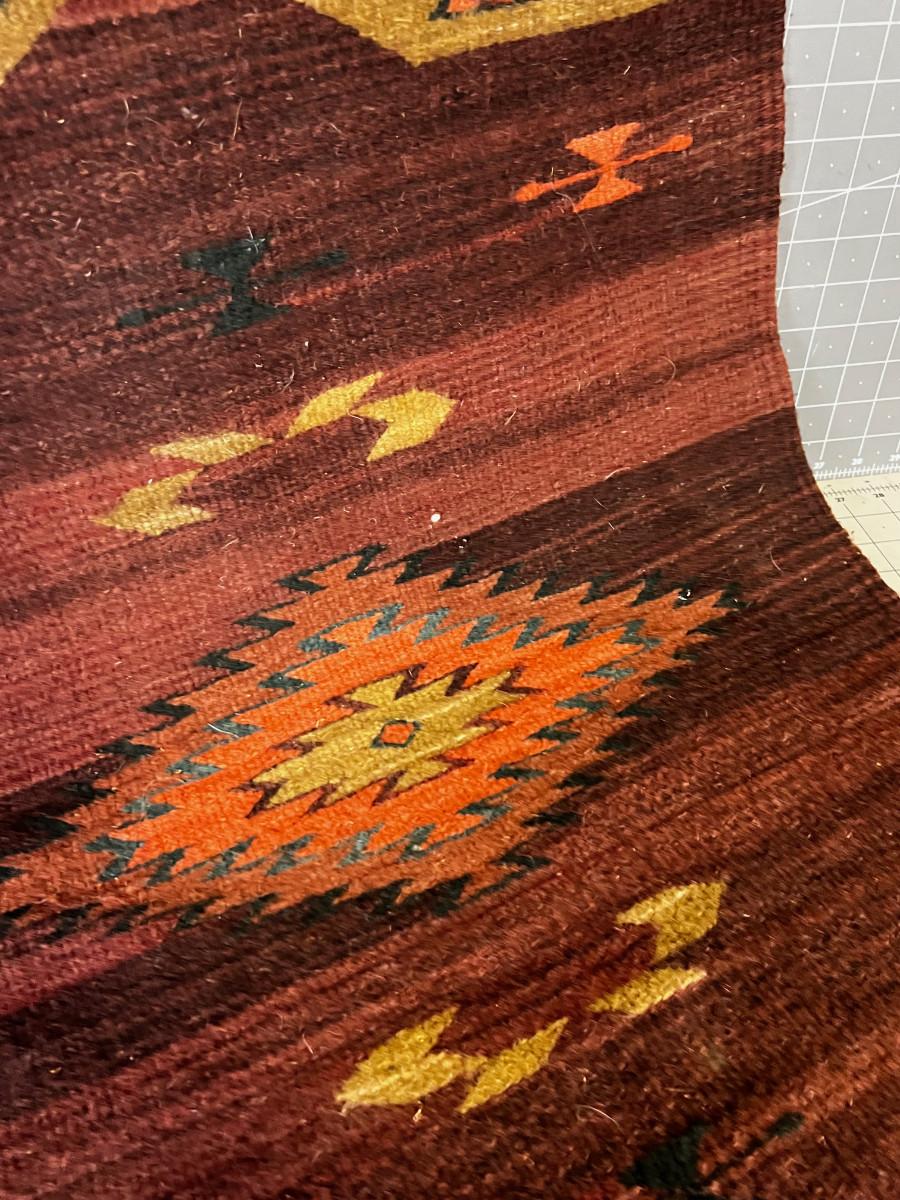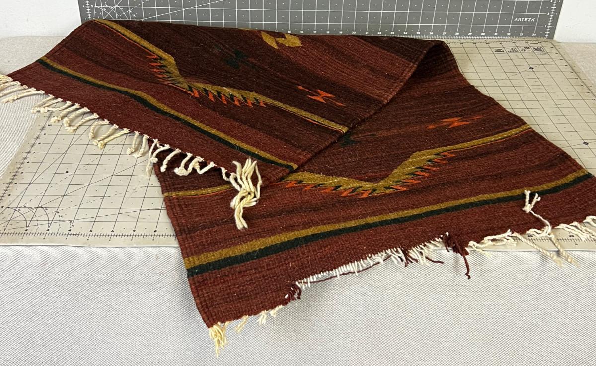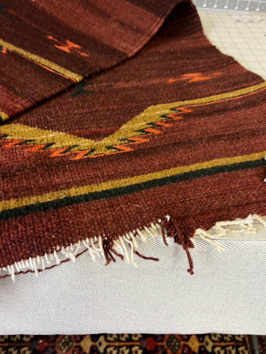 Used. Size 22 x 38" Has some Damage on one end. Nice Dark Maroon & Brown Tones.
