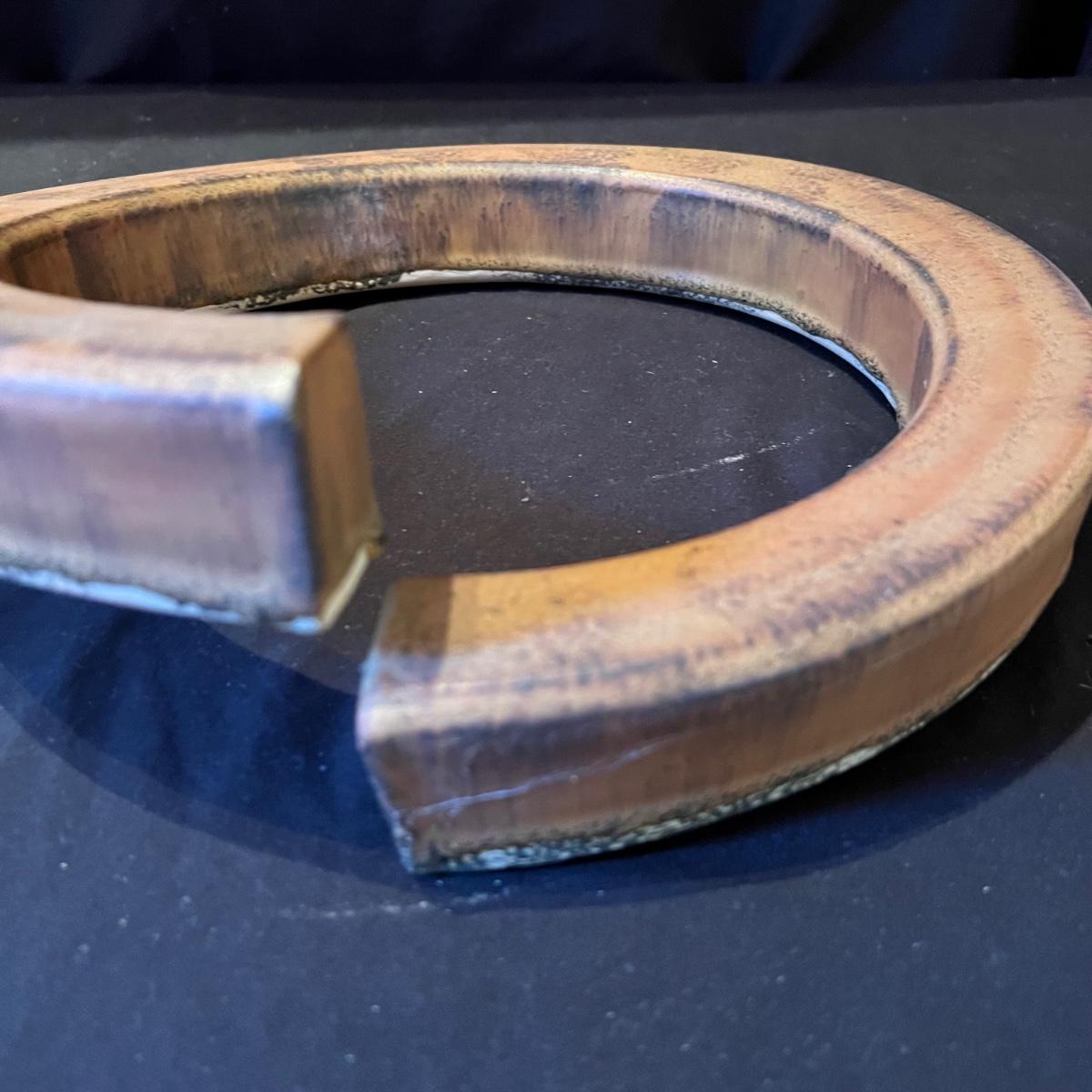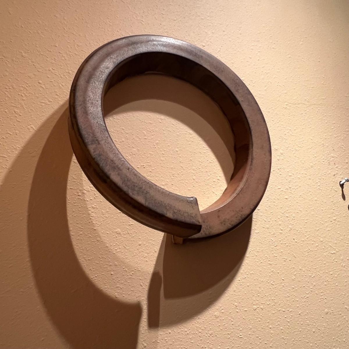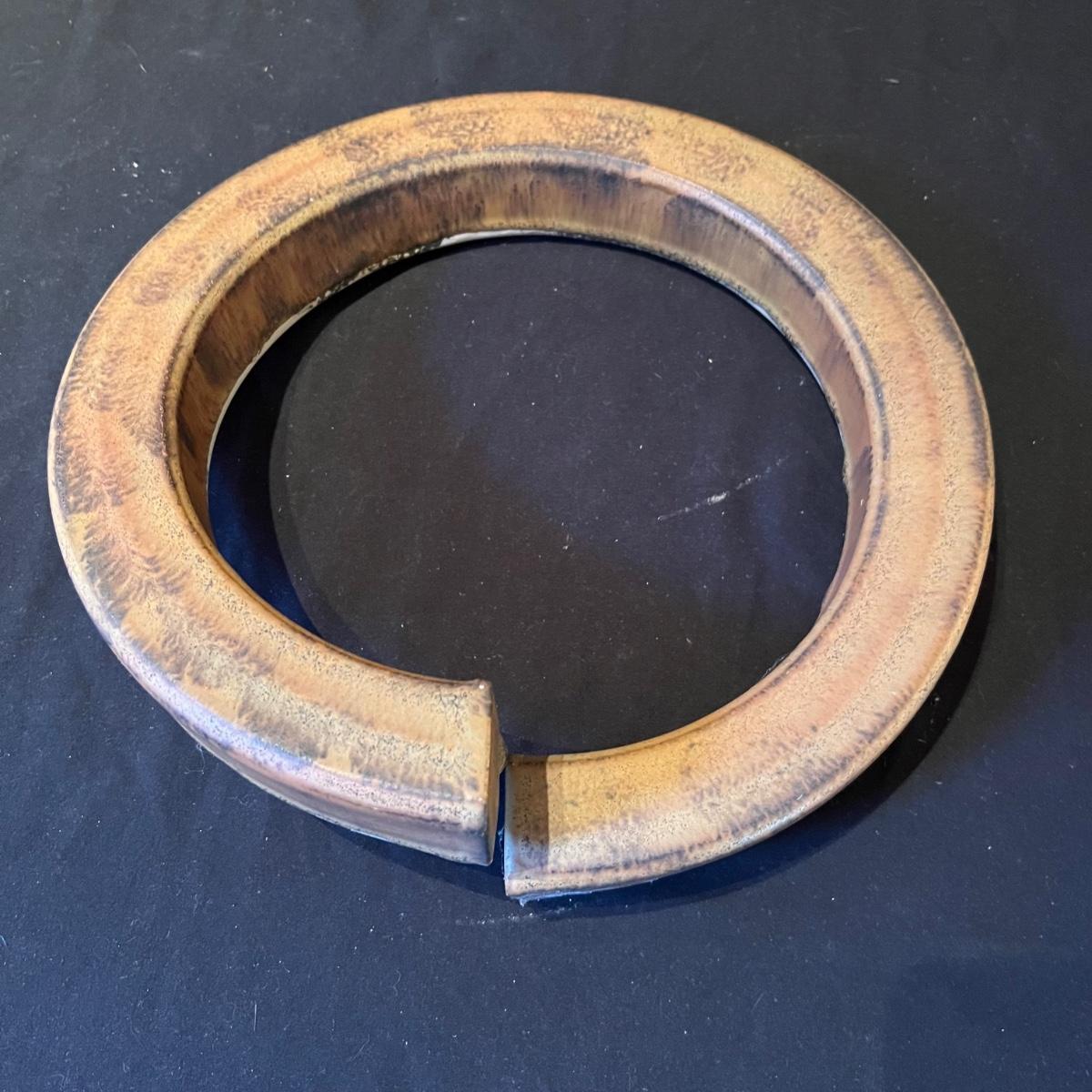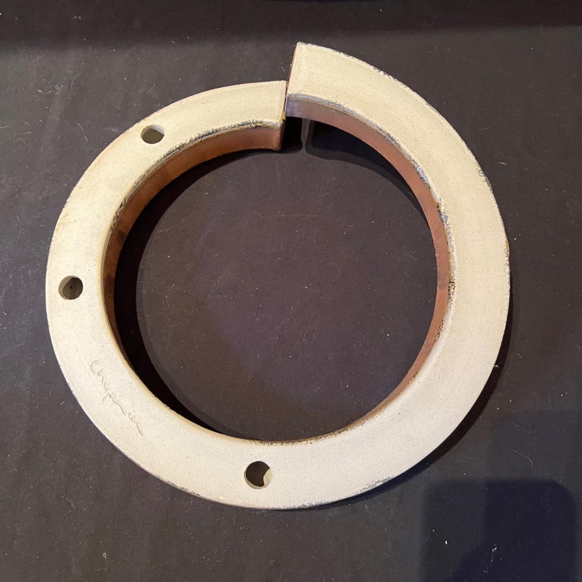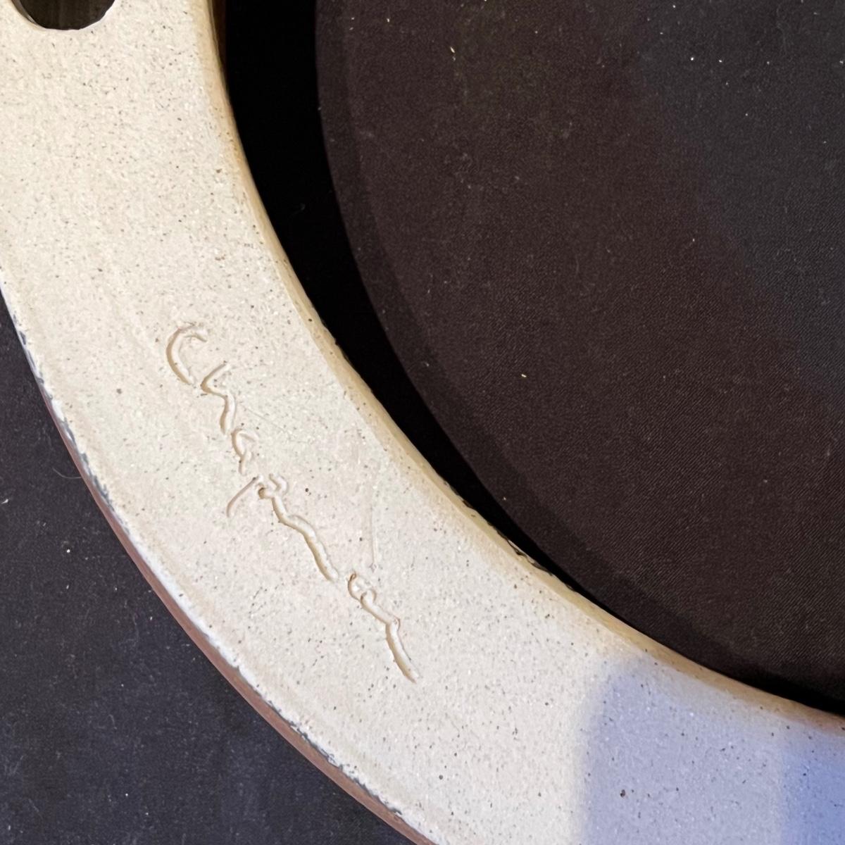 Fun pottery from Dana Chapman Tupa (another lot containing her work is available in this sale). This piece is an altered circle that has a matte glaze. It has three holes which allow the piece to be hung at your position of choice.