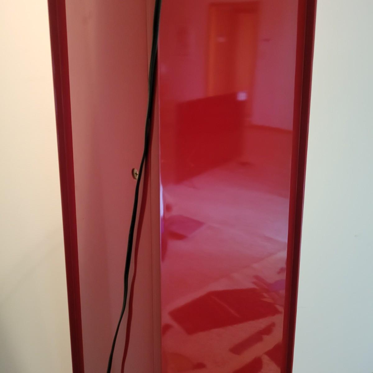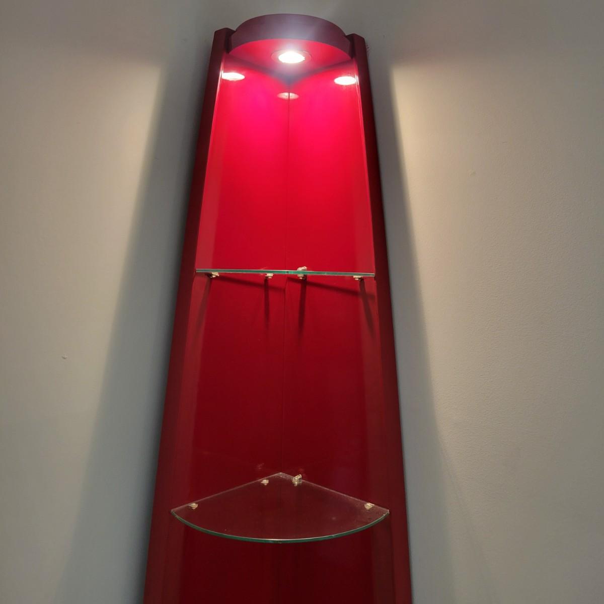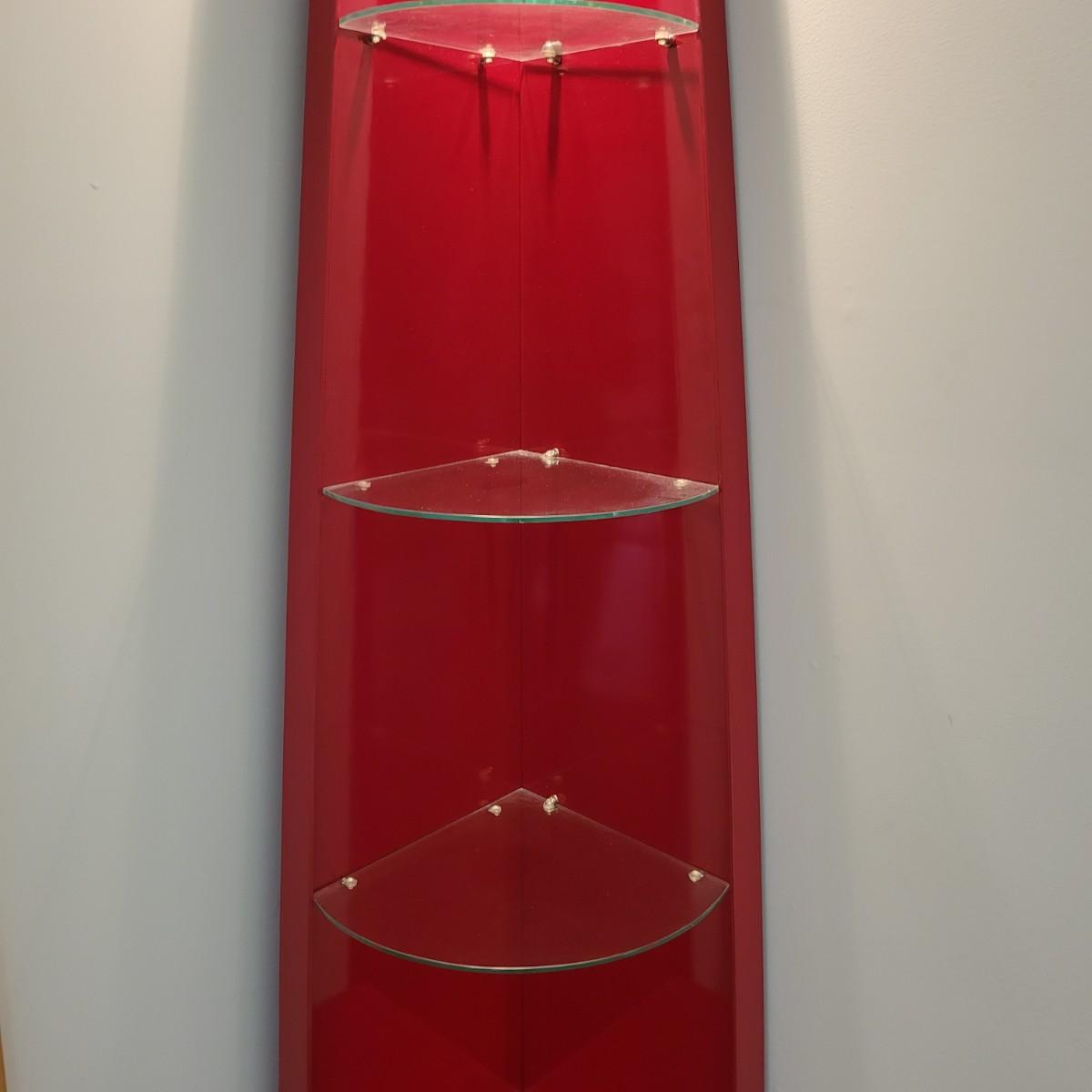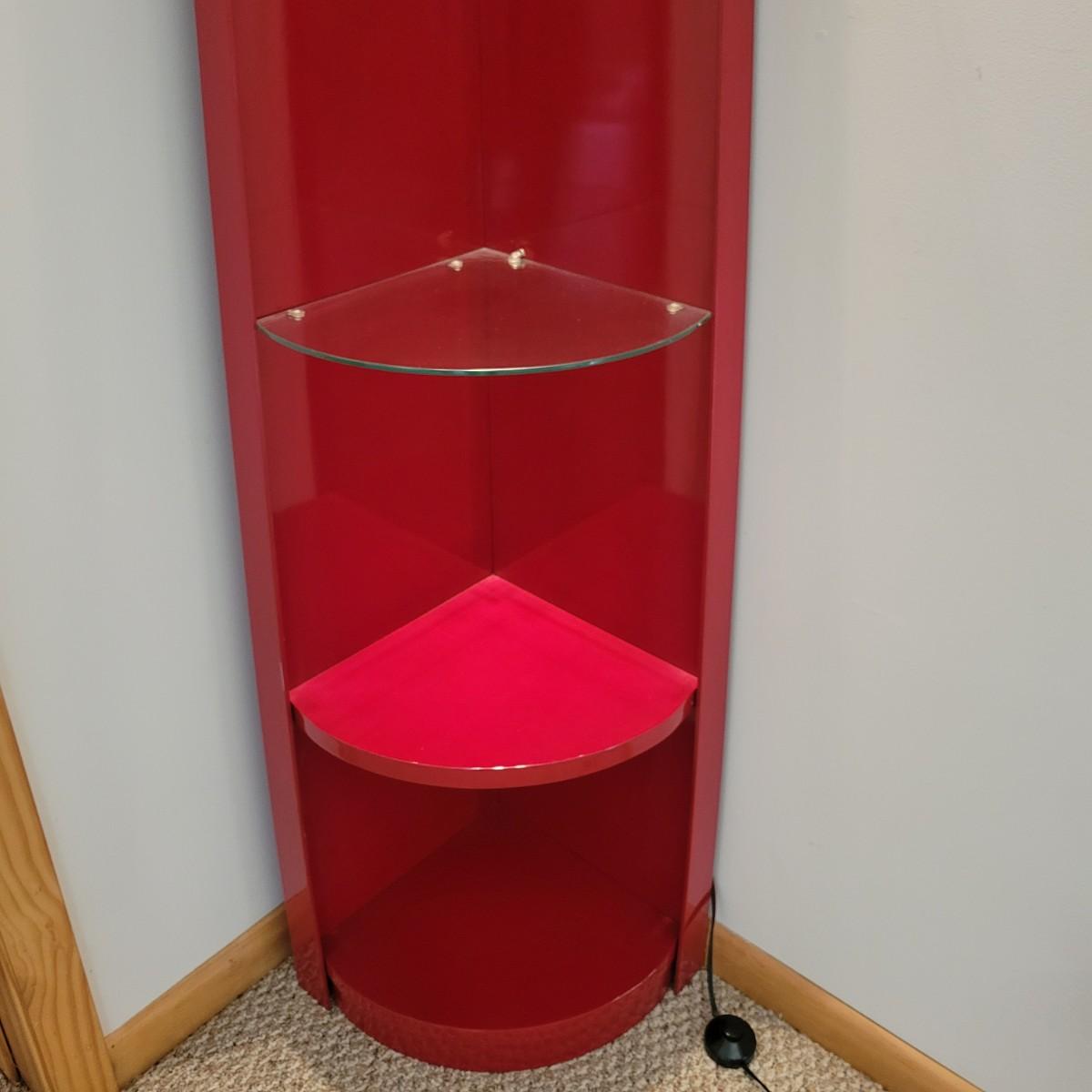 A modern red enameled corner shelving unit. This shelving unit features three glass shelves and two additional shelves that are enamel. It has a light that worked when plugged in. It has some minor chips in its enamel finish. Unit measures approximately 21" x 13.5" x 79.5"H. Local pickup only. Winning bidder must bring assistance to help move and load this item due to its weight and/or size.