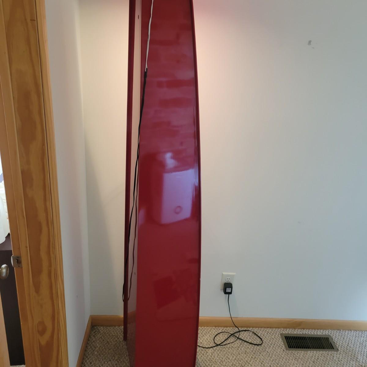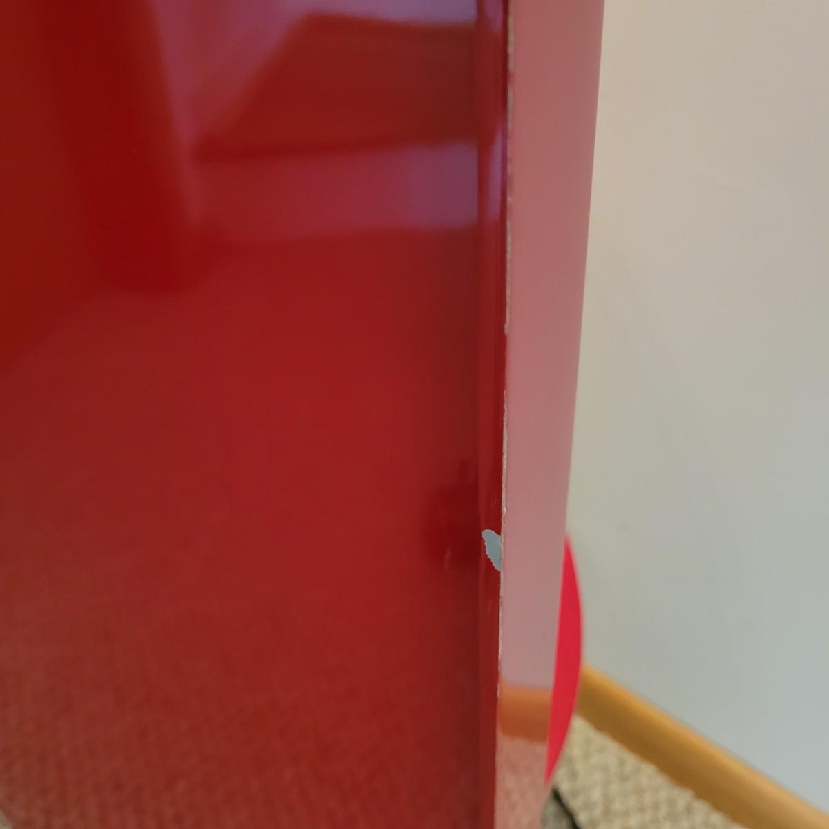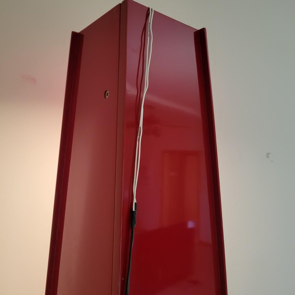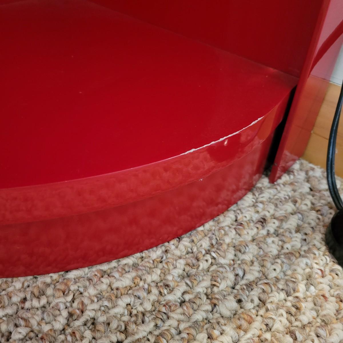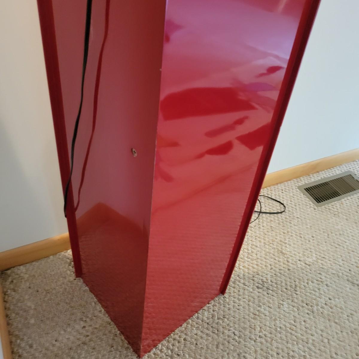 A modern red enameled corner shelving unit. This shelving unit features three glass shelves and two additional shelves that are enamel. It has a light that worked when plugged in. It has some minor chips in its enamel finish. Unit measures approximately 21" x 13.5" x 79.5"H. Local pickup only. Winning bidder must bring assistance to help move and load this item due to its weight and/or size.
