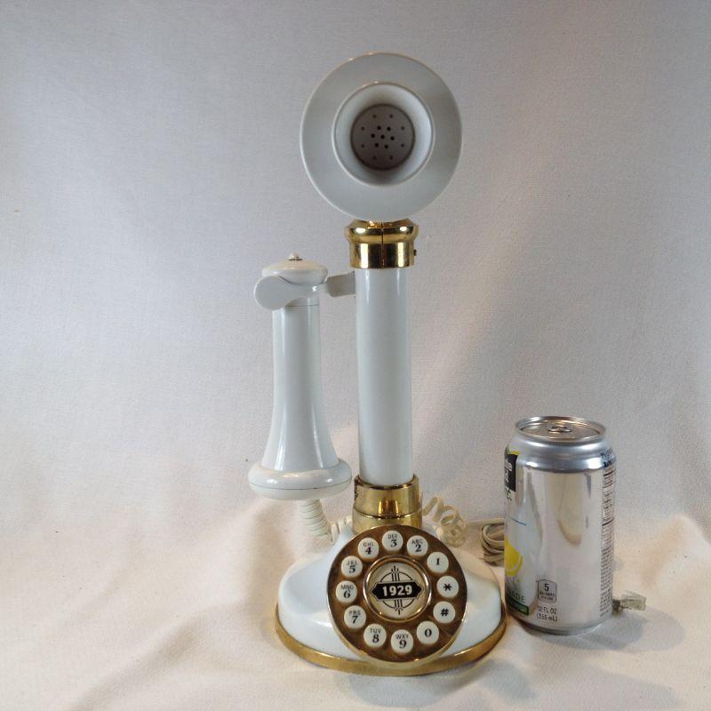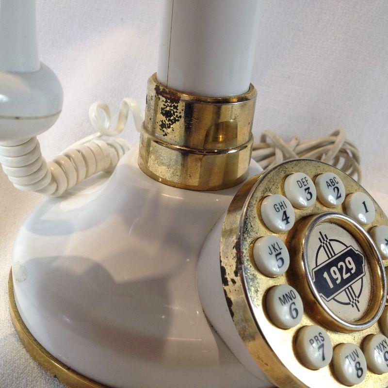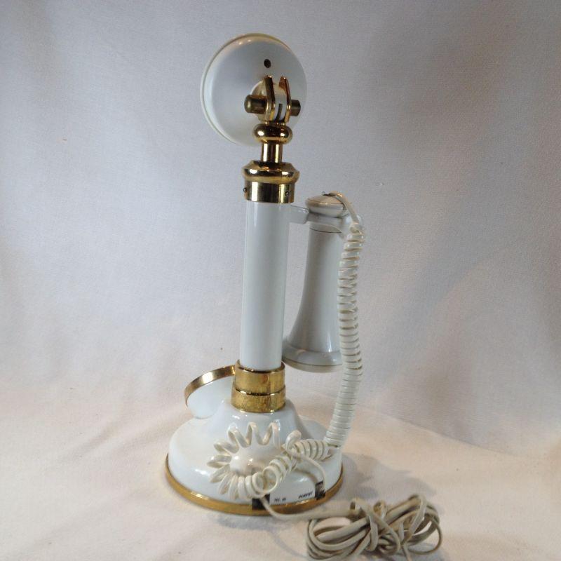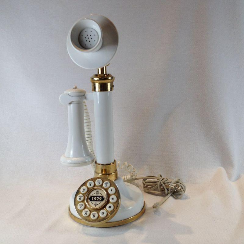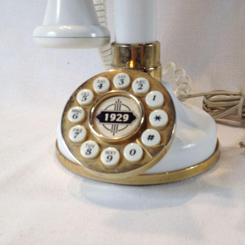 This is a modern push button dial phone in the style of vintage telephones of days gone by. Add a little class to your land line or just to confuse your kids. Shows a little wear on the gold areas but in good working condition.