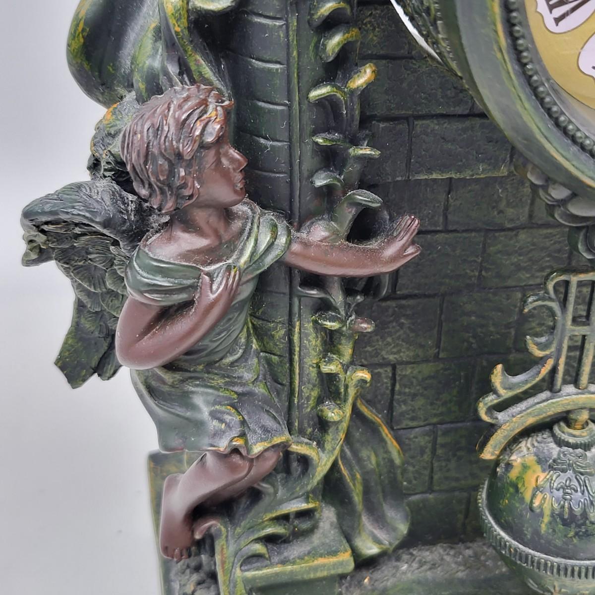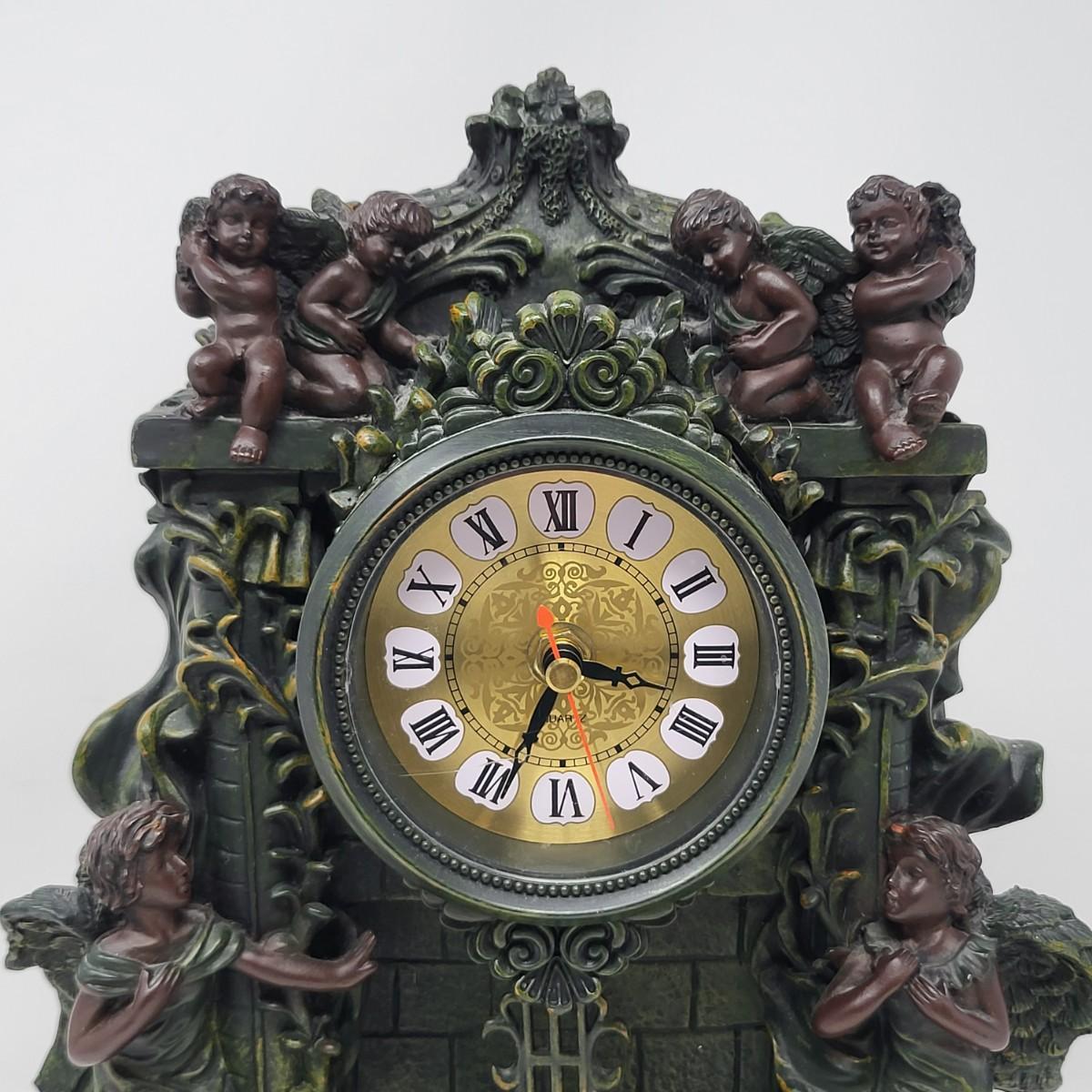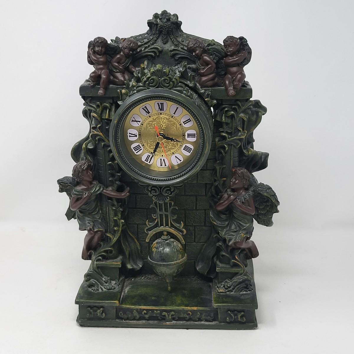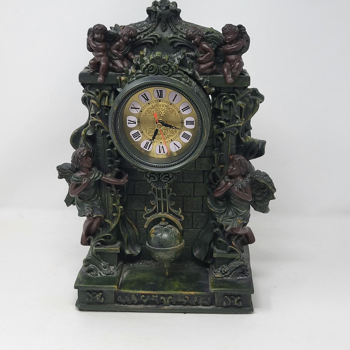 Goth-looking battery operated clock. Needs new AA battery. Pendulum is lightweight plastic. Newer, made to look old, heavy resin cherub mantle clock. Appears maybe back piece missing? 13.5" tall x 8" wide x 5" deep.