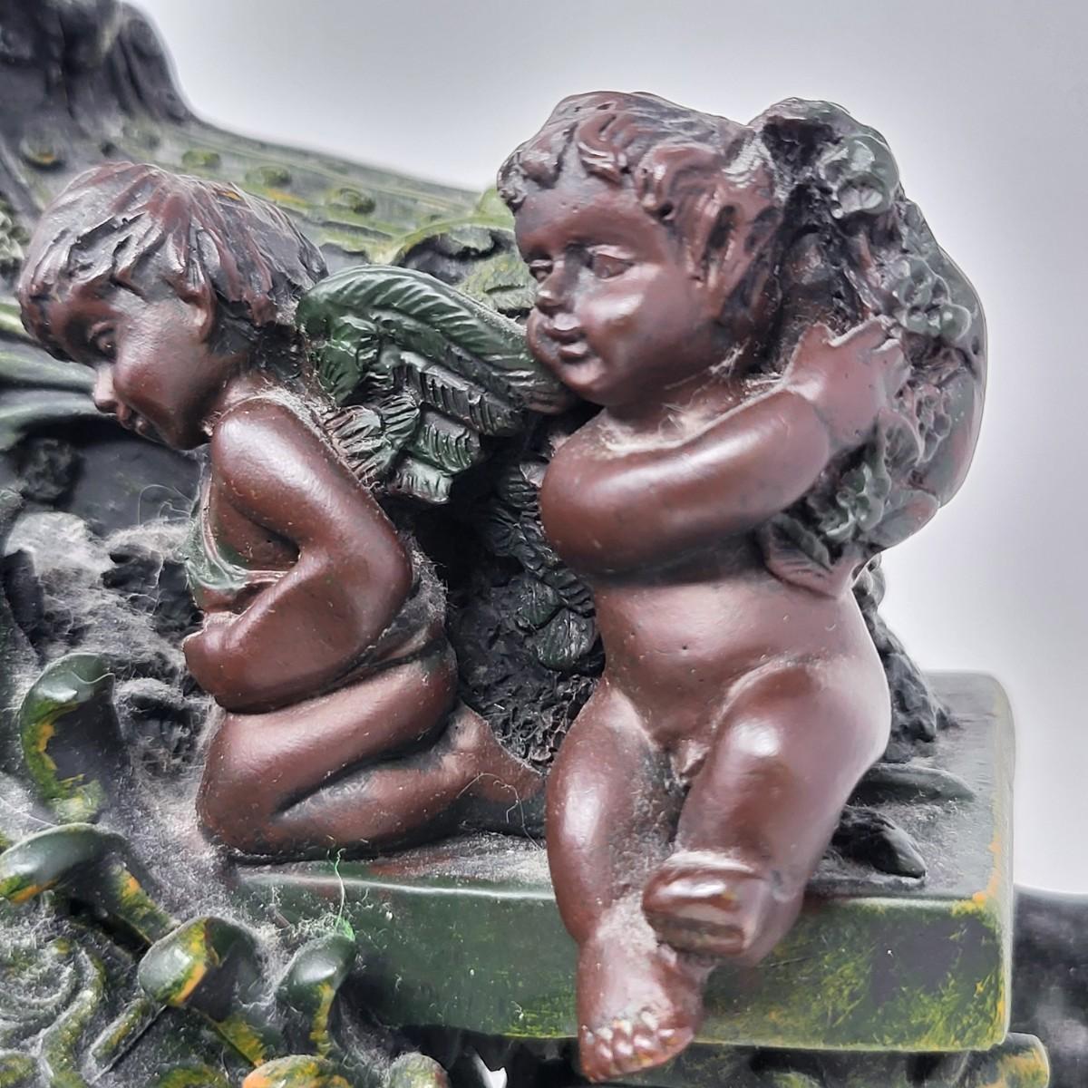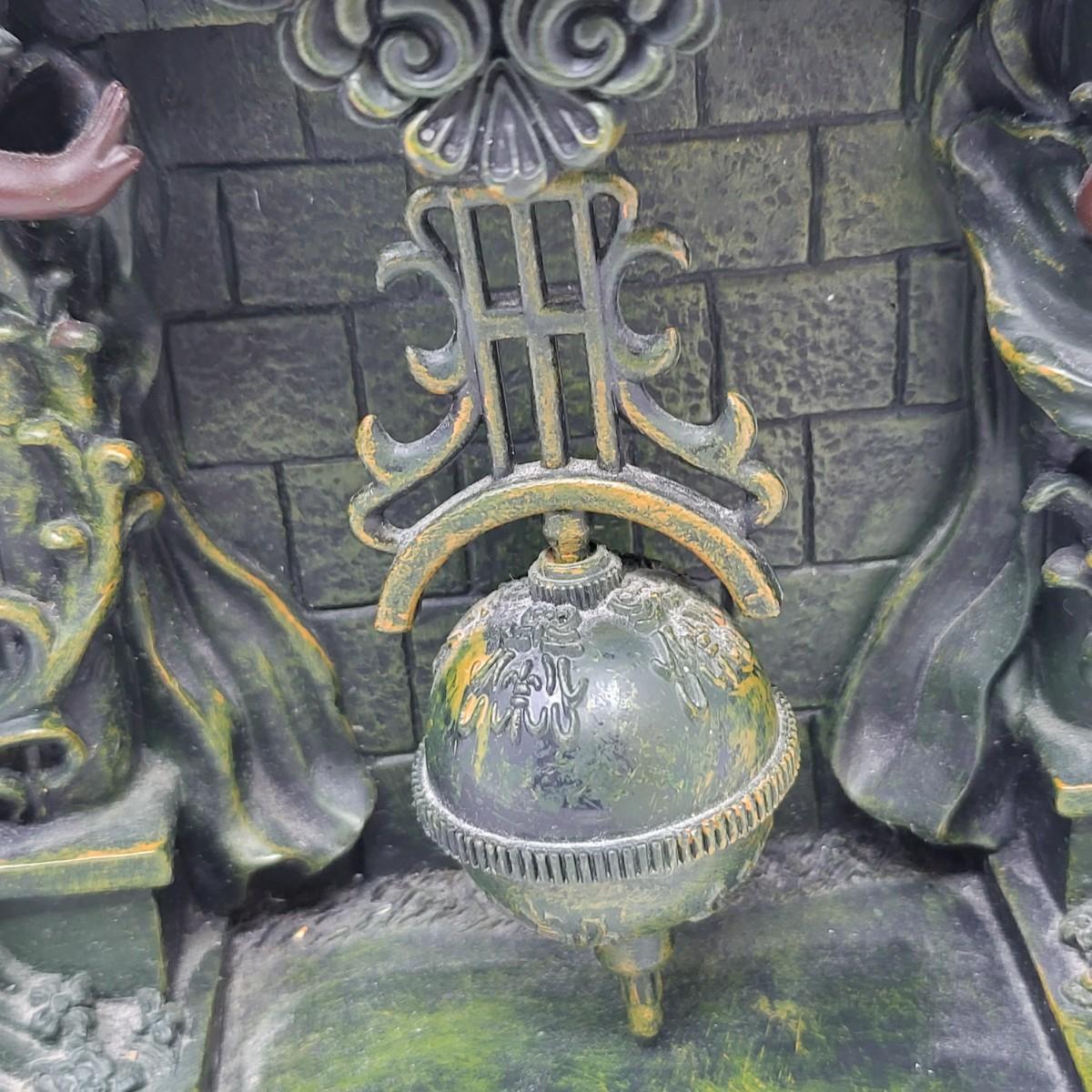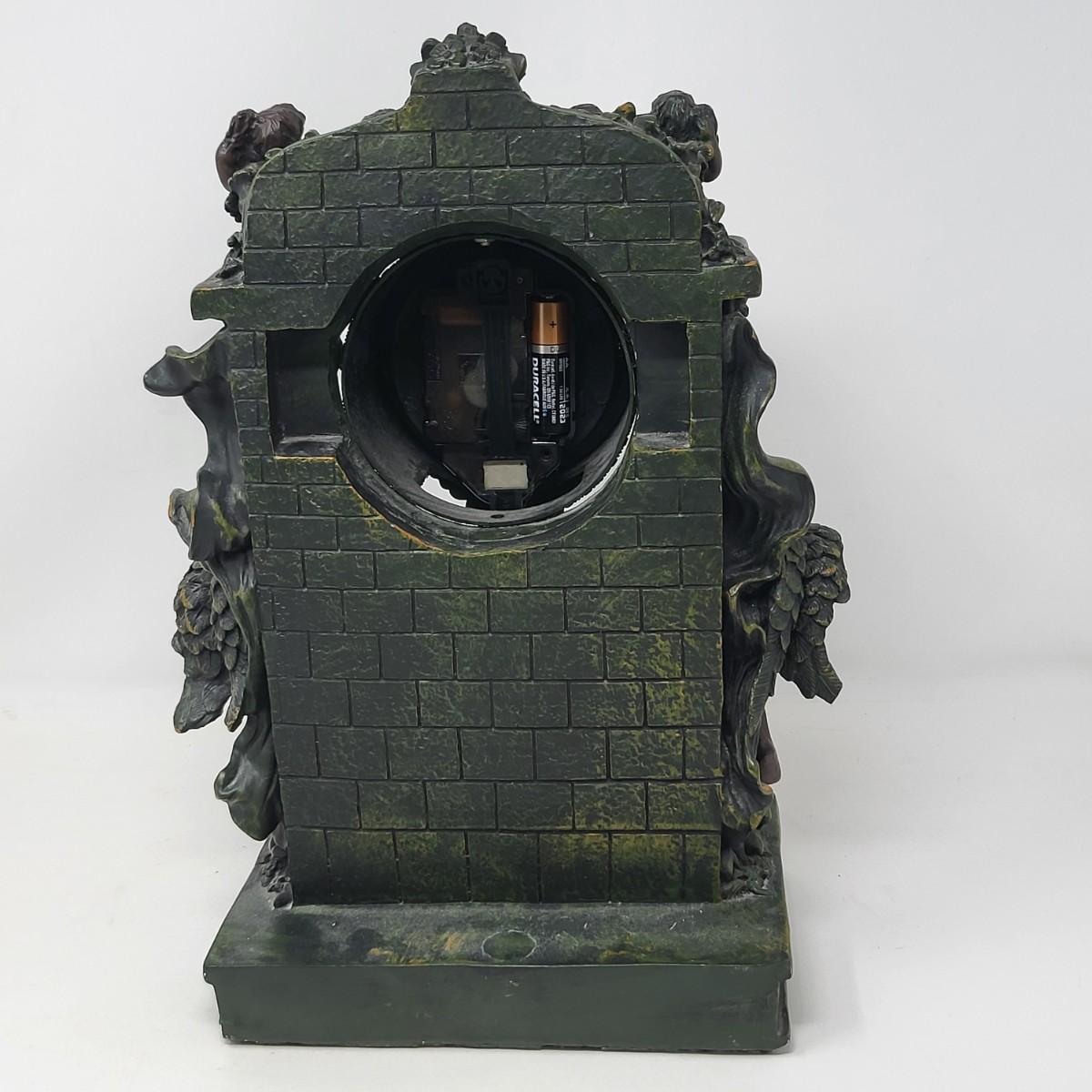 Goth-looking battery operated clock. Needs new AA battery. Pendulum is lightweight plastic. Newer, made to look old, heavy resin cherub mantle clock. Appears maybe back piece missing? 13.5" tall x 8" wide x 5" deep.