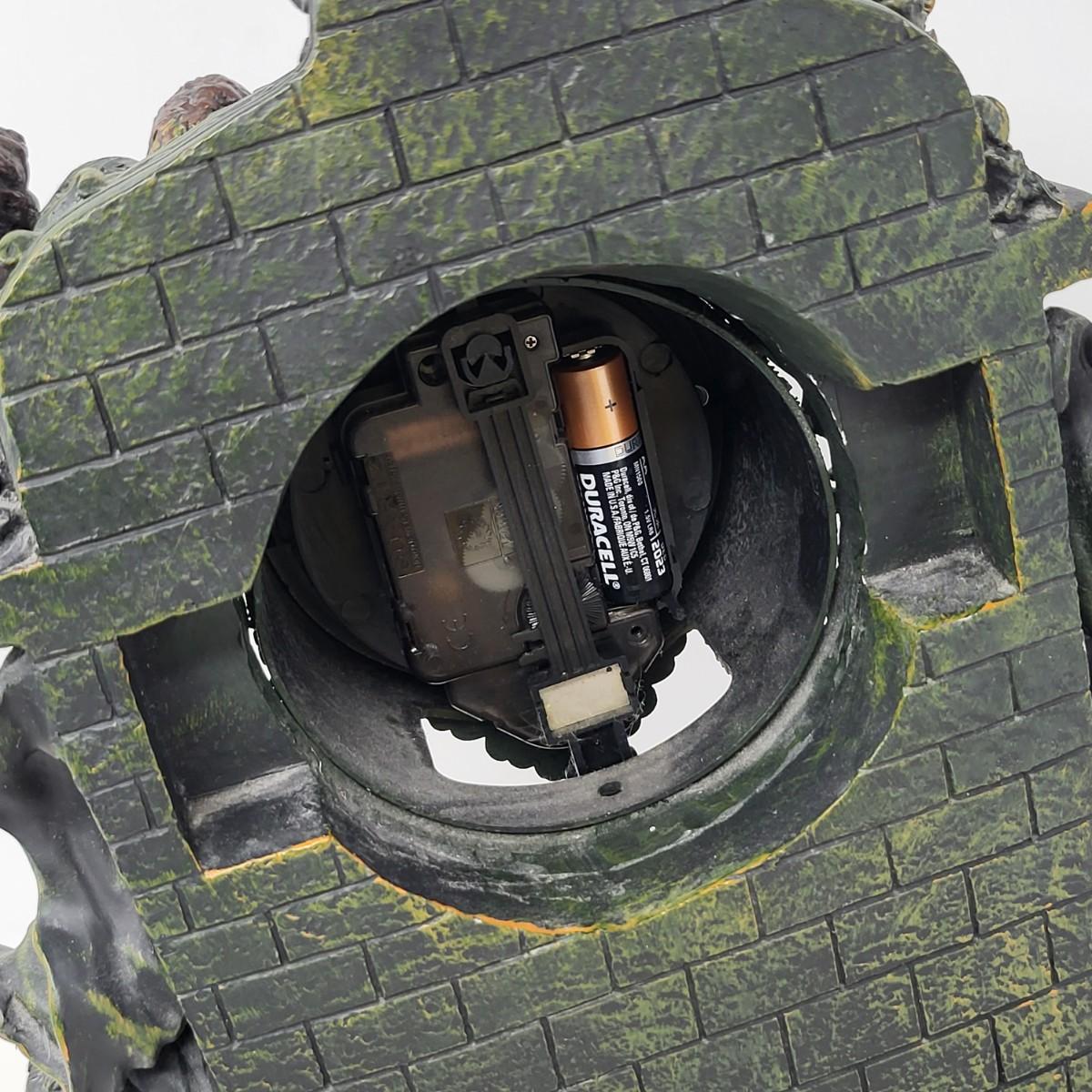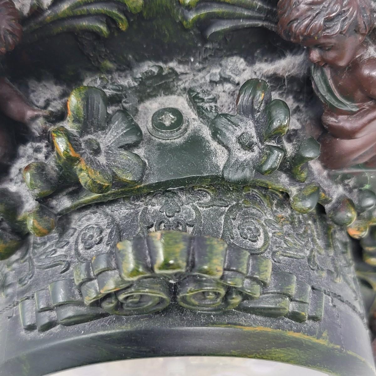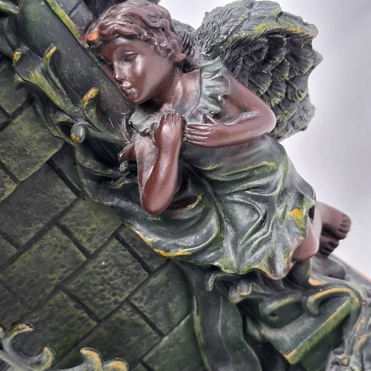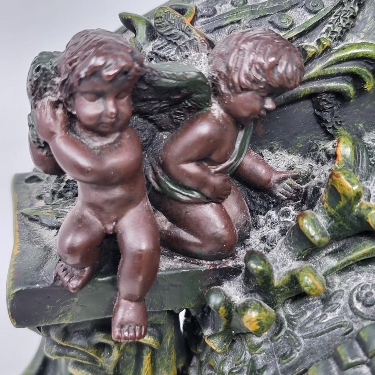 Goth-looking battery operated clock. Needs new AA battery. Pendulum is lightweight plastic. Newer, made to look old, heavy resin cherub mantle clock. Appears maybe back piece missing? 13.5" tall x 8" wide x 5" deep.