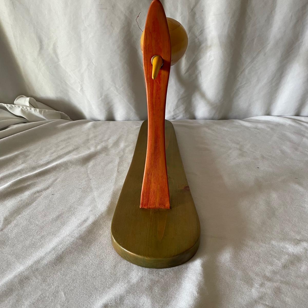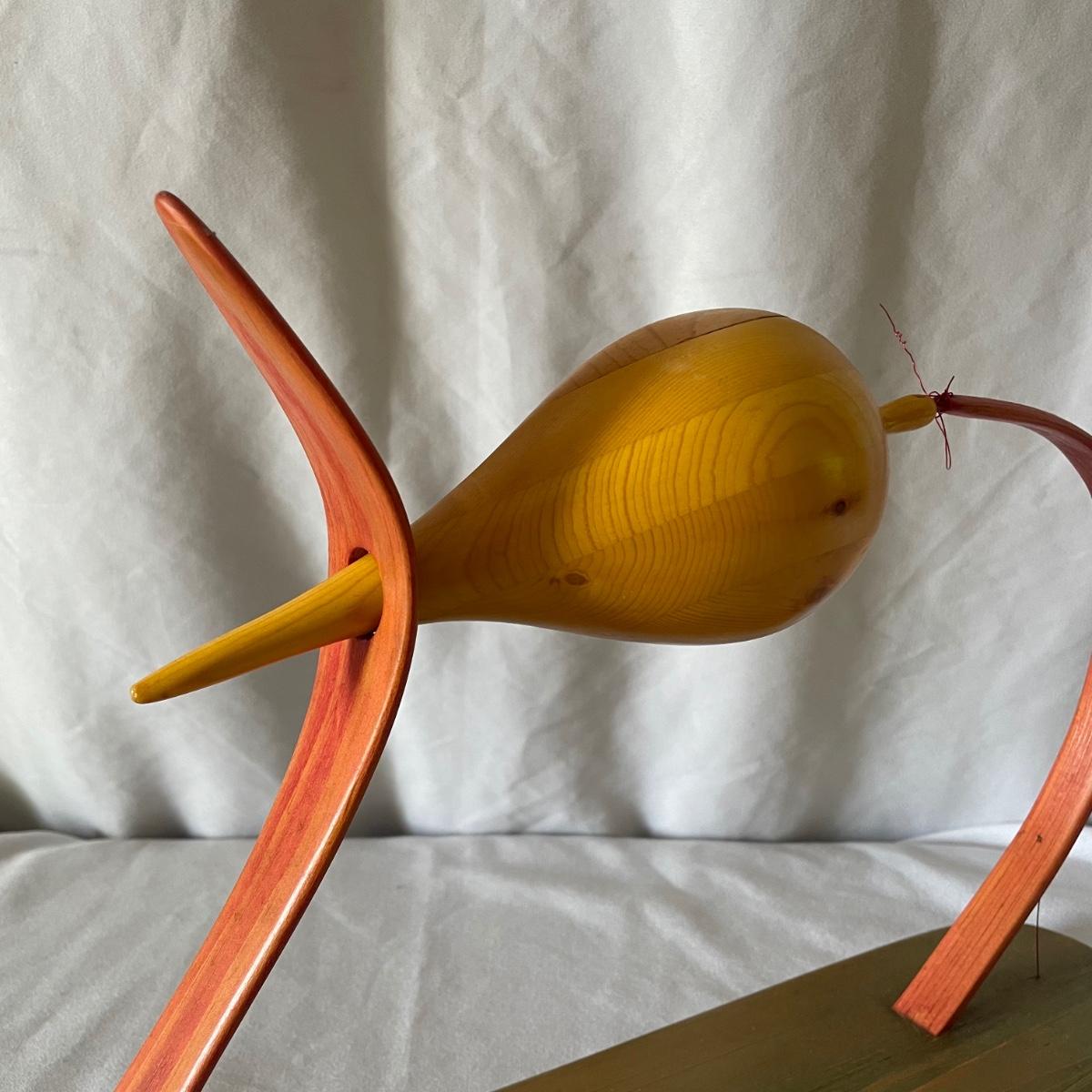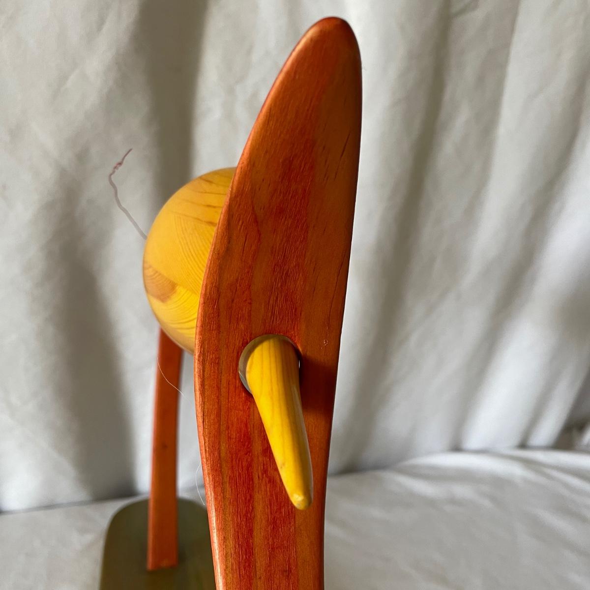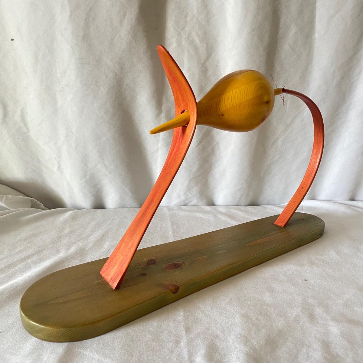 This unique piece of modern art is all made from lightweight wood. The red wire attaches the yellow section and just needs securing fully. It measures approximately 20” x 5” x 13”. By artist Ripp Smith.