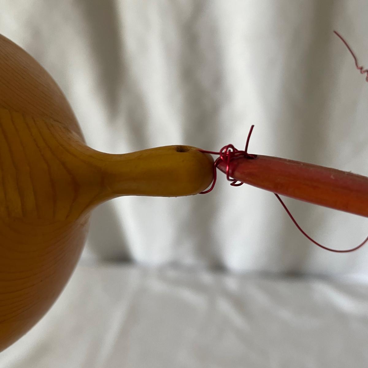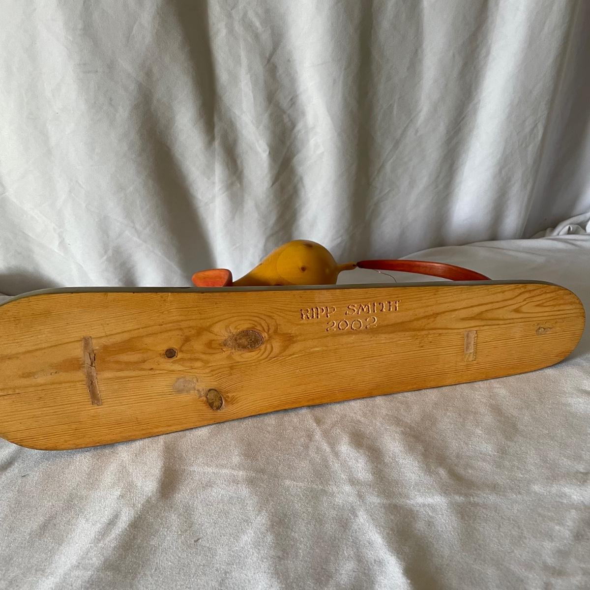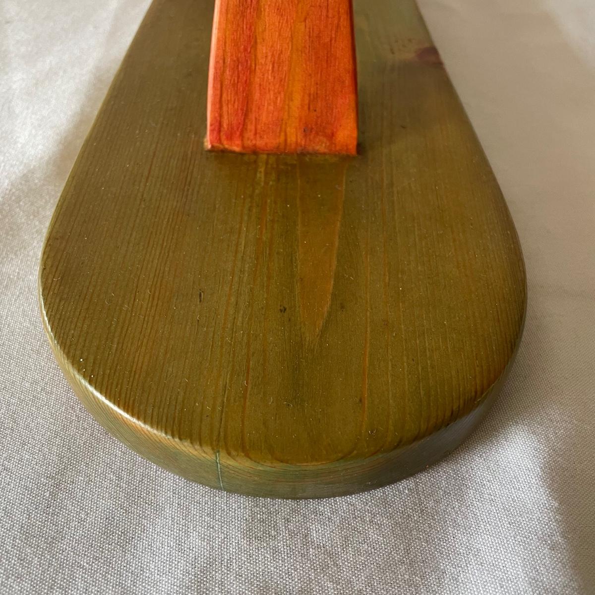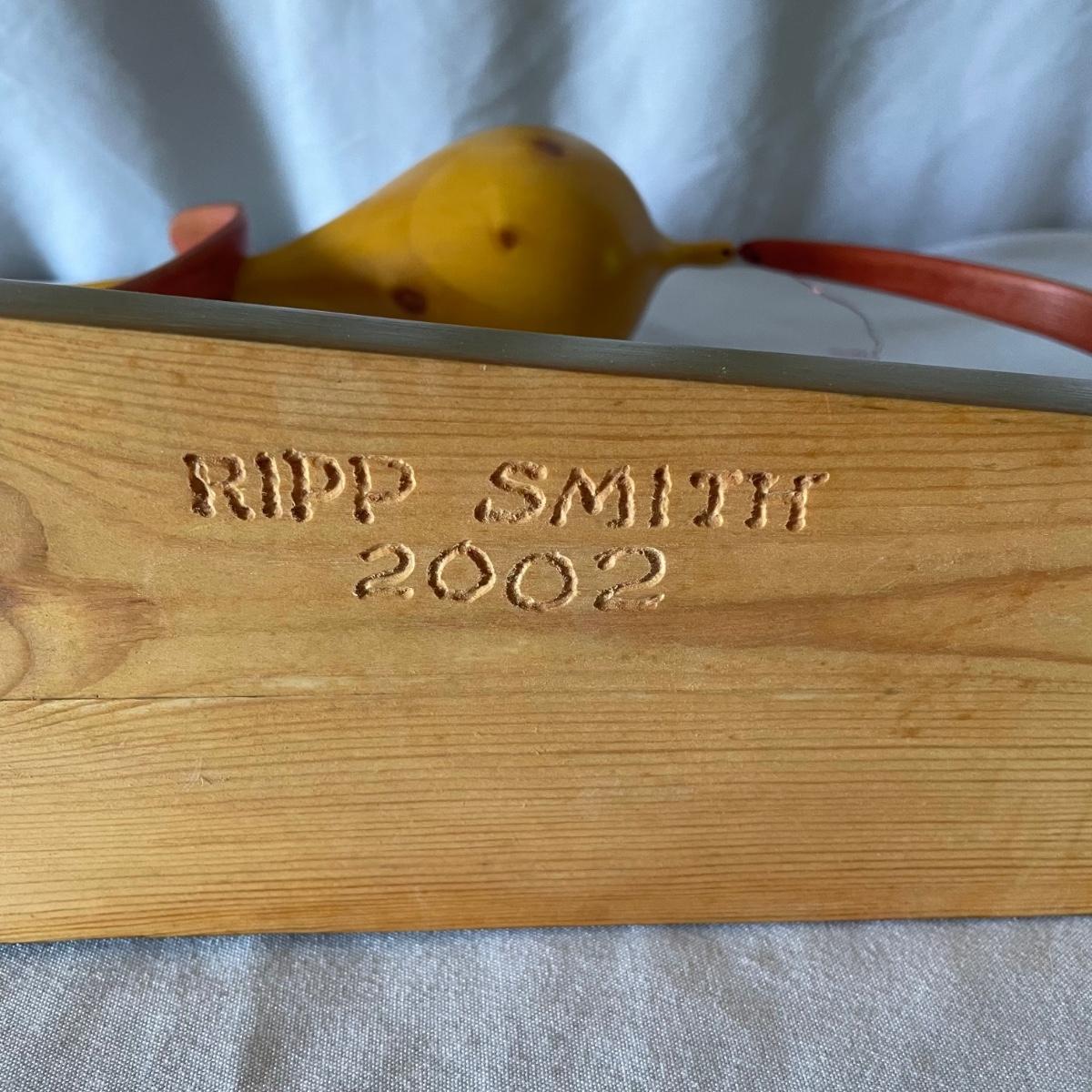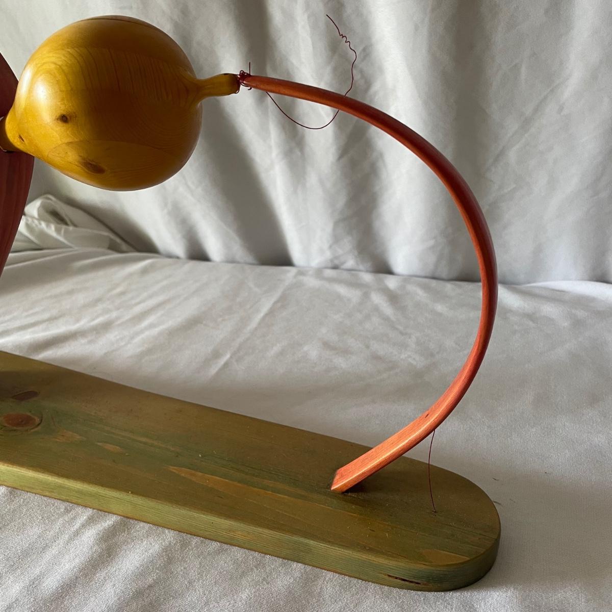 This unique piece of modern art is all made from lightweight wood. The red wire attaches the yellow section and just needs securing fully. It measures approximately 20” x 5” x 13”. By artist Ripp Smith.