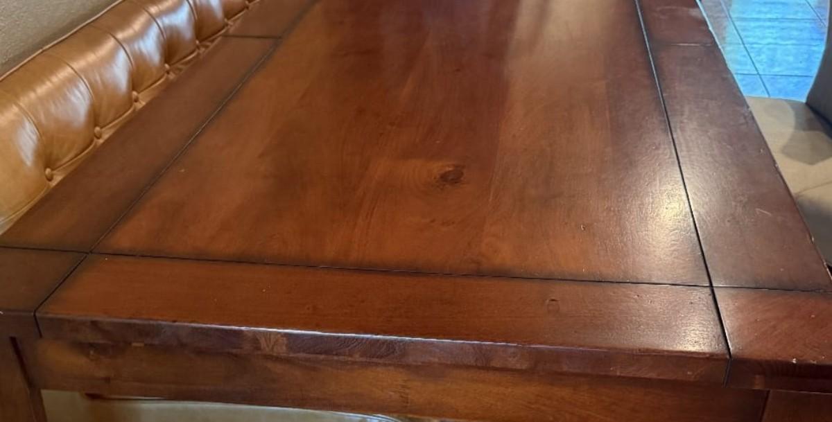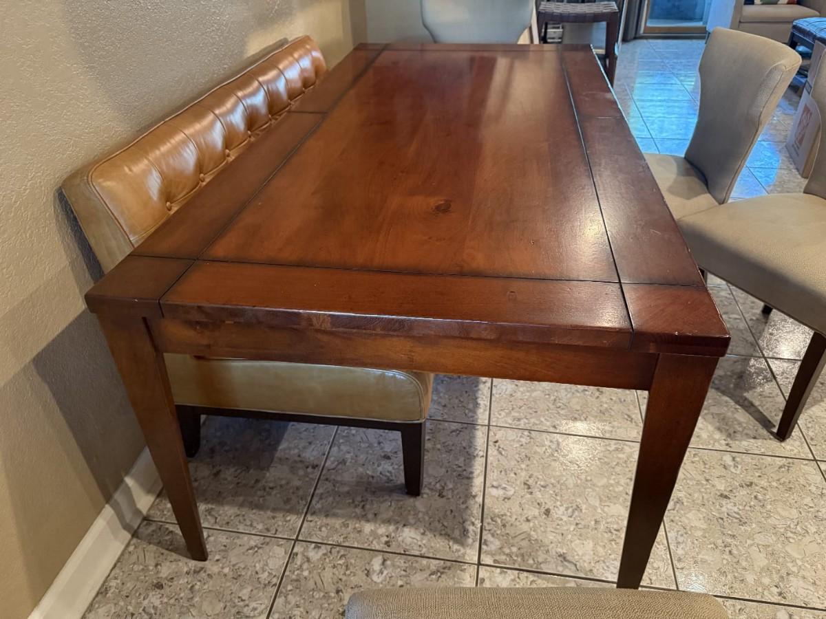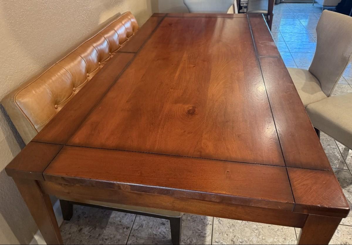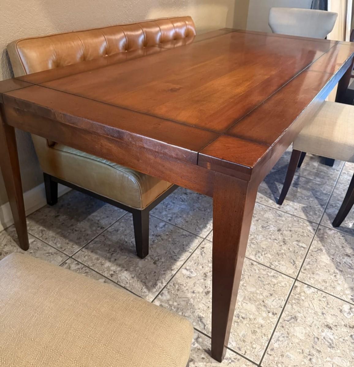 Solid wood dining table, sits 6, heavy good quality steady. Modern design. Not extendable, Single piece top. Measures approximately 83"Lx41"W