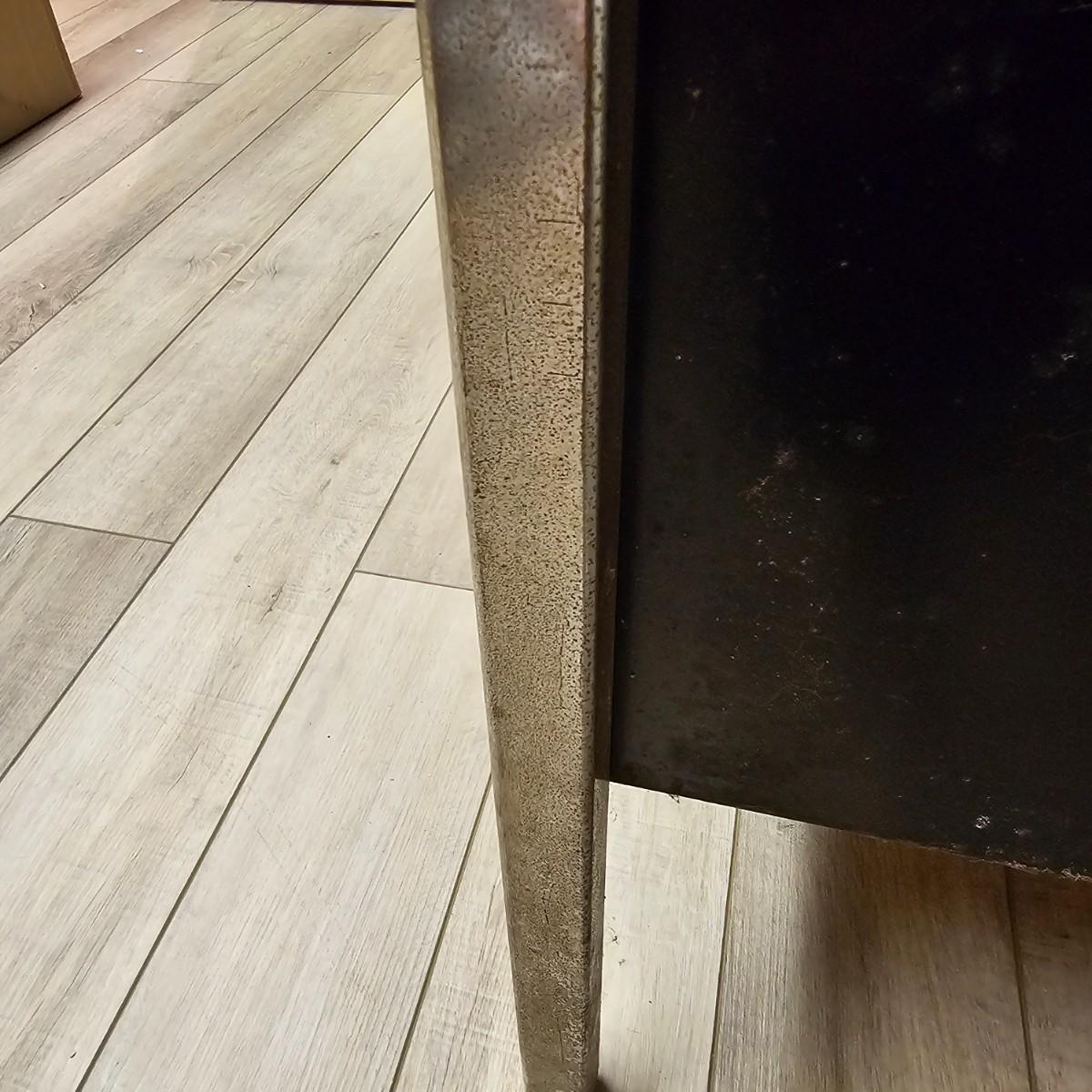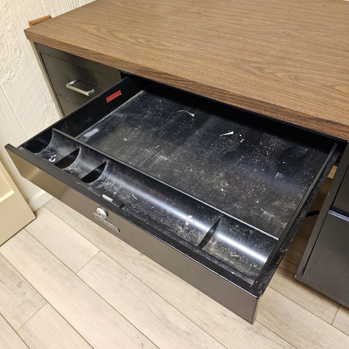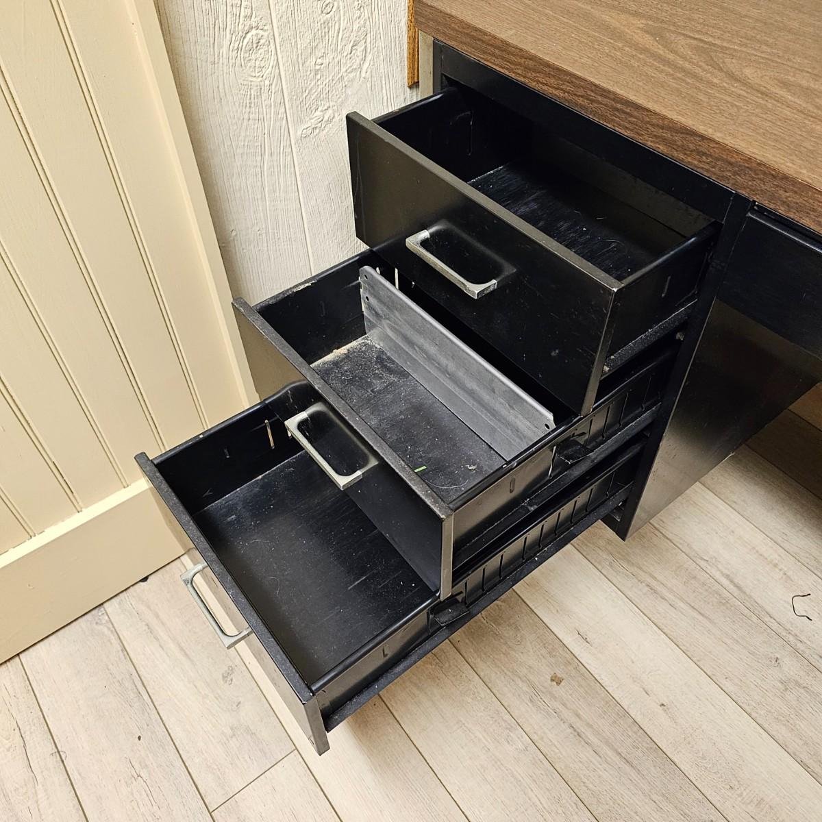 Contemporary style metal office desk with wood top. Made by Steelcraft. Desk has three drawers on left side, one center drawer and one regular drawer/one file drawer on right side with hanging file folders. Desk measures 54" x 24" x 29"H, has some discoloring on legs. See photos for details. Local pickup only. Winning bidder must bring assistance to help move and load this item due to its weight and/or size.