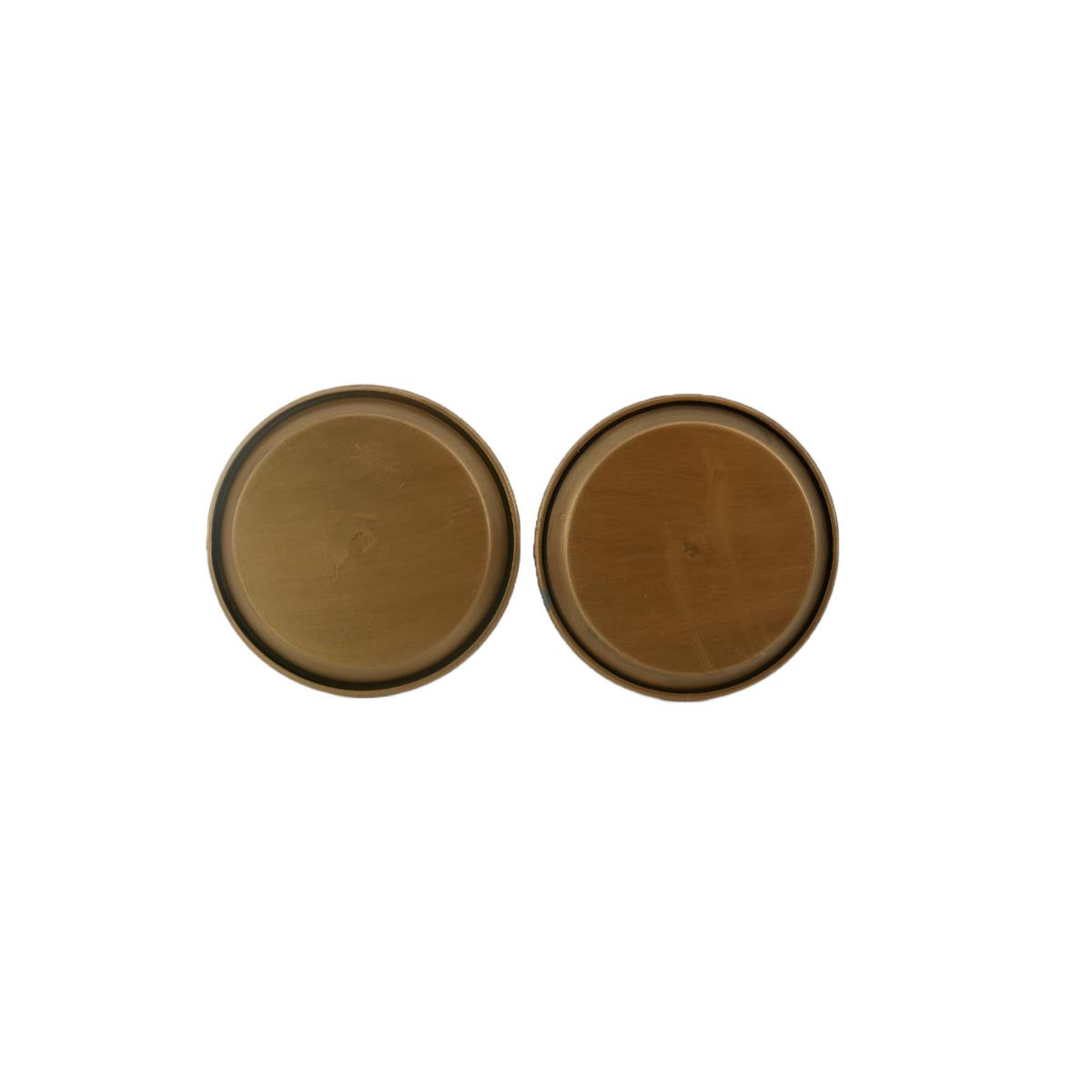 Two modern minimalist style metal brass colored tray candle holders. Both in good condition, slight paint wear. Measures approximately 5" in diameter and 6.5" in height. Lot weighs 6 oz. (D93)