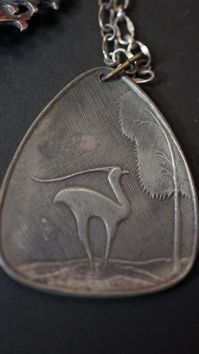 Stamped pewter Made in Norway Pendant with gazelle by tree in pewter. (surface scratches and wear noted)
