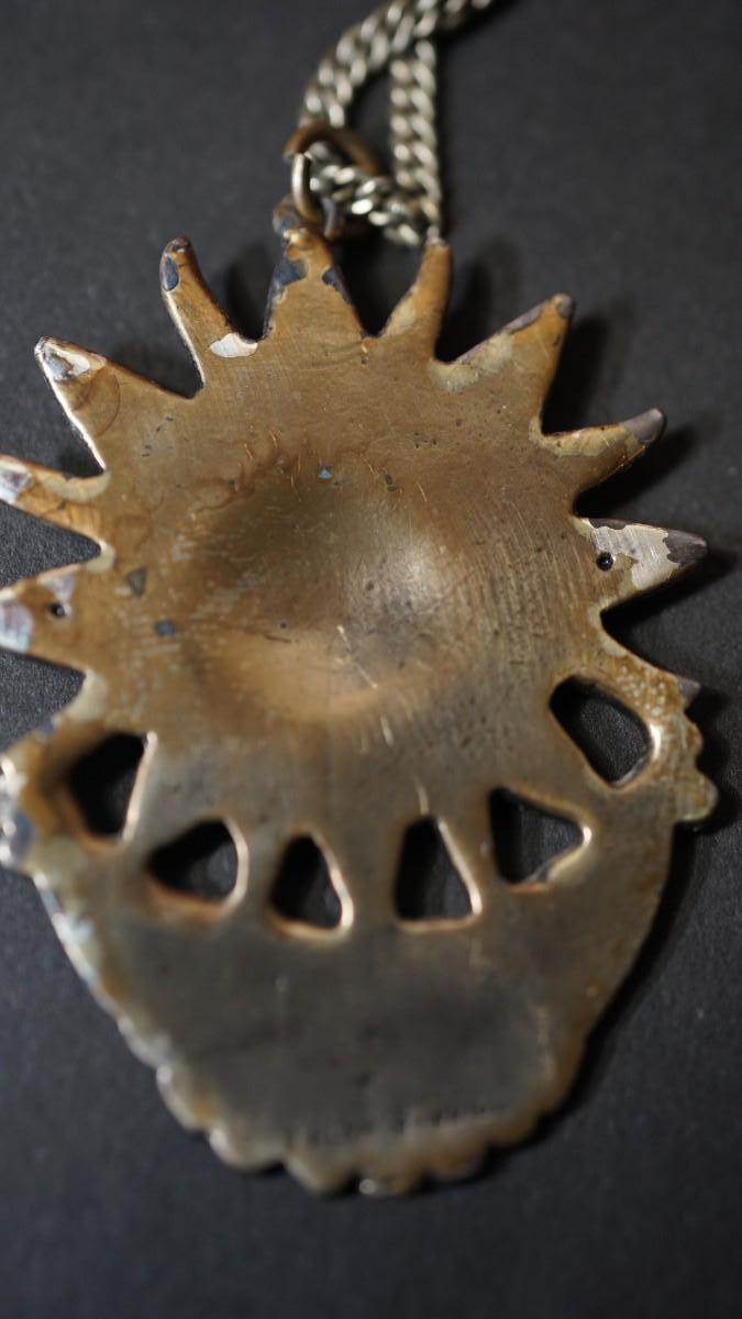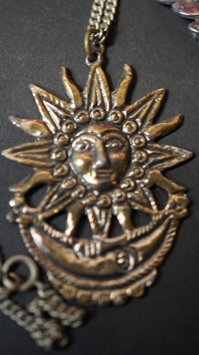 stamped Alva Sun burst pendant on brass chain. 2 1/4,with the pendant and the chain the length is 14" has a bronze finish over silver. tiny dents noted on the back, very cool design.