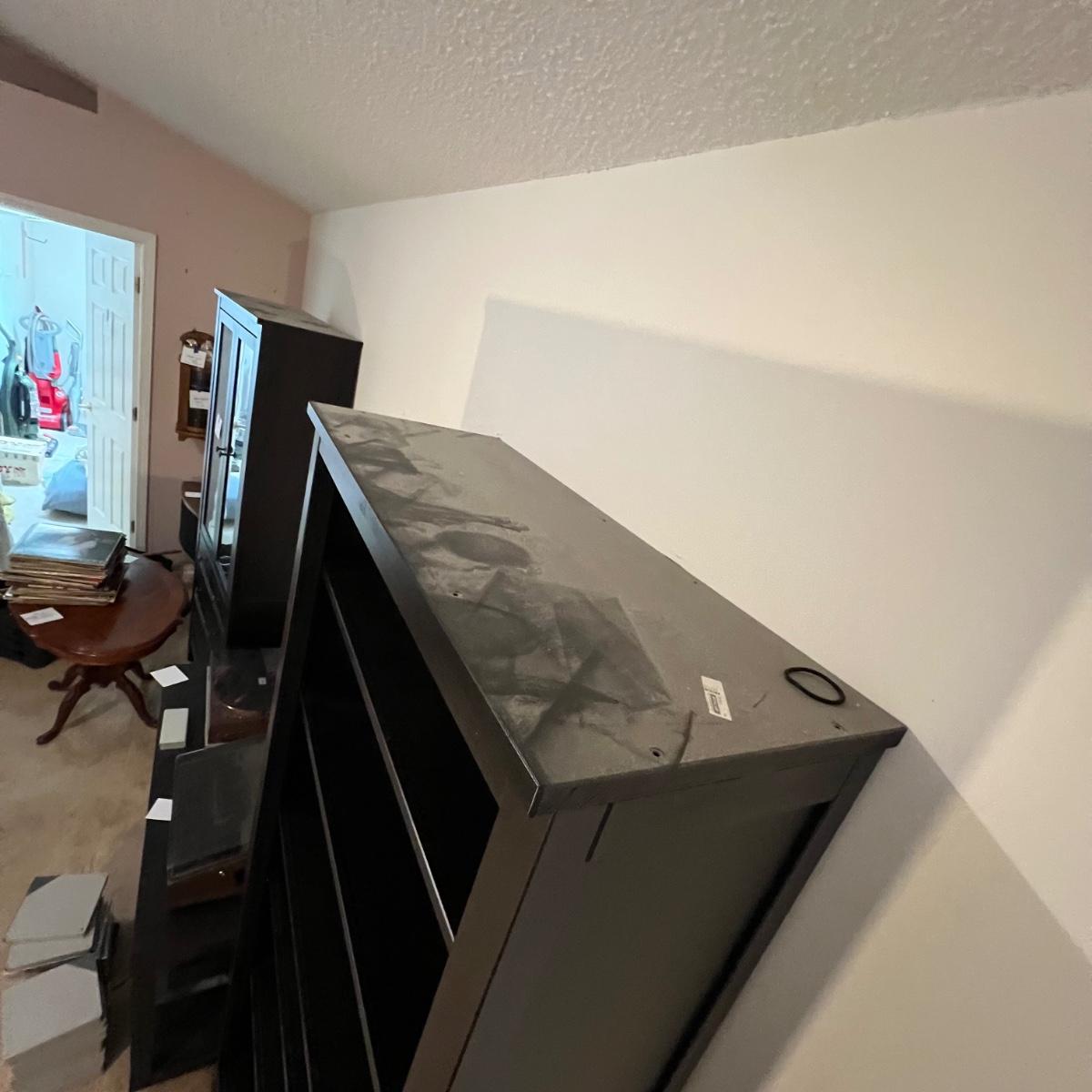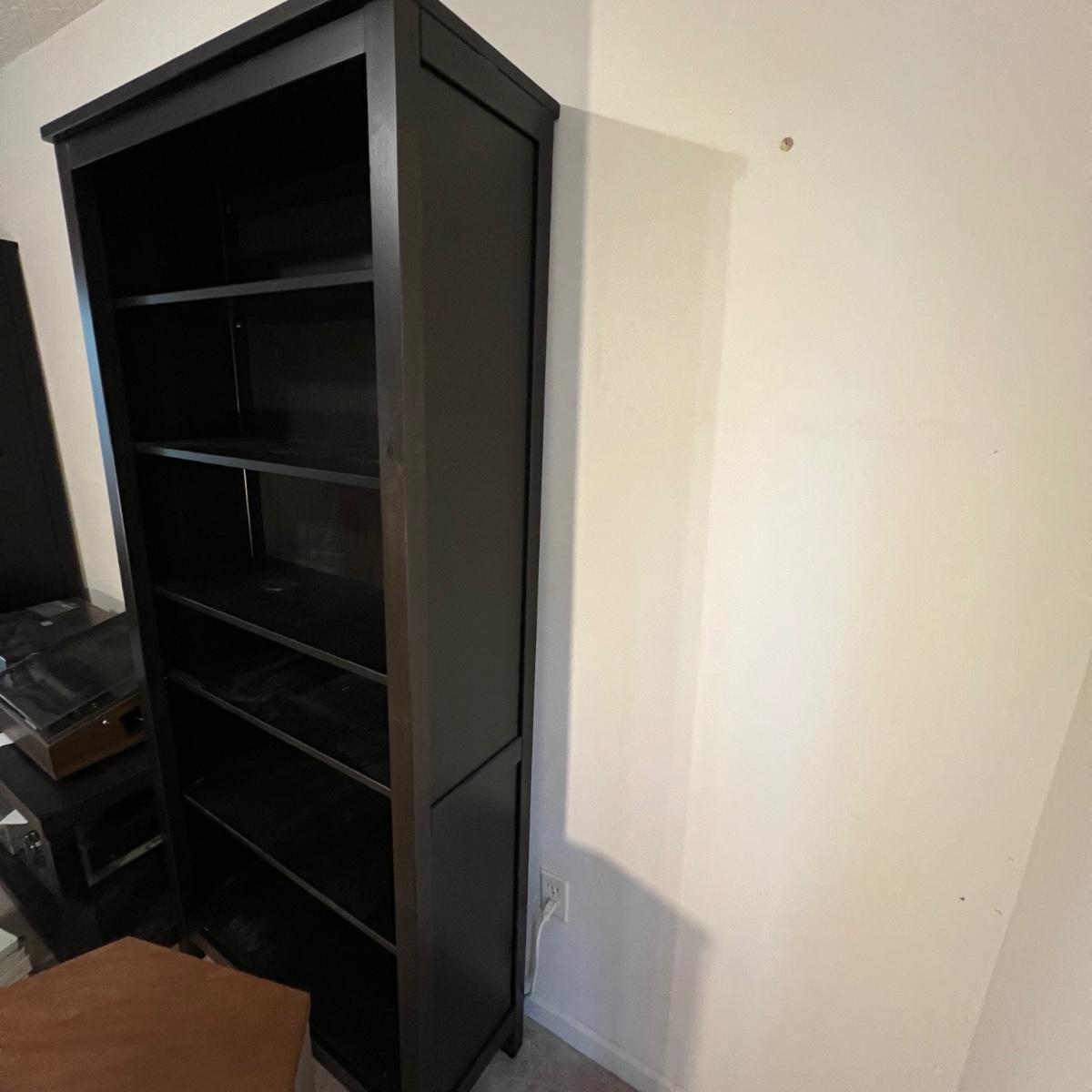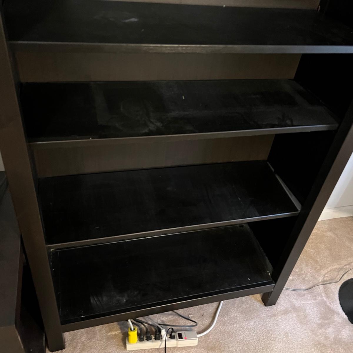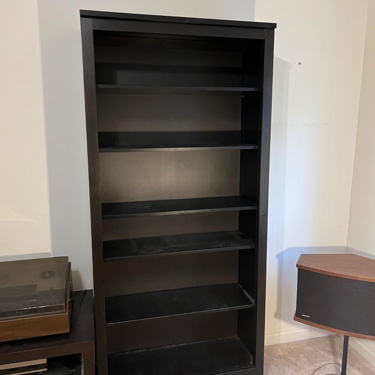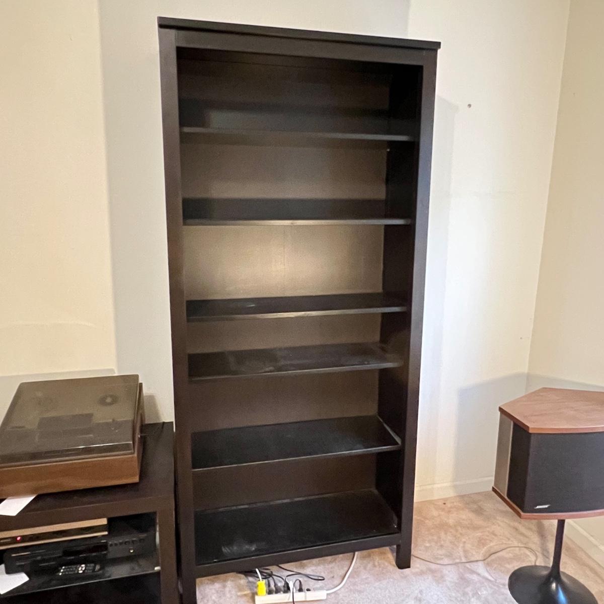 This dark brown bookcase appears to match the IKEA furniture lots in this sale, or at the very least pairs very nicely with it. It is manufactured wood. Four of its five shelves are adjustable, middle shelf cannot be changed.