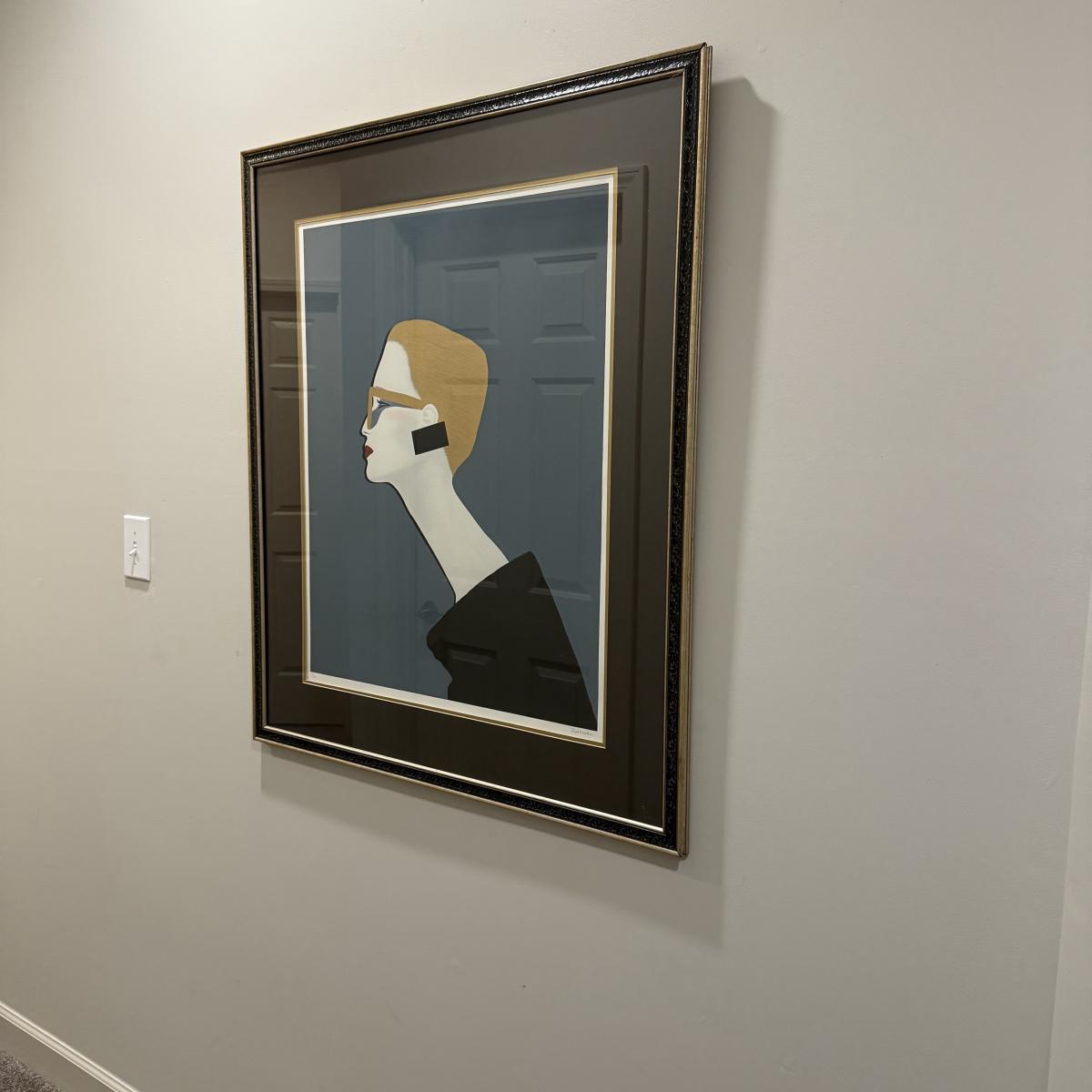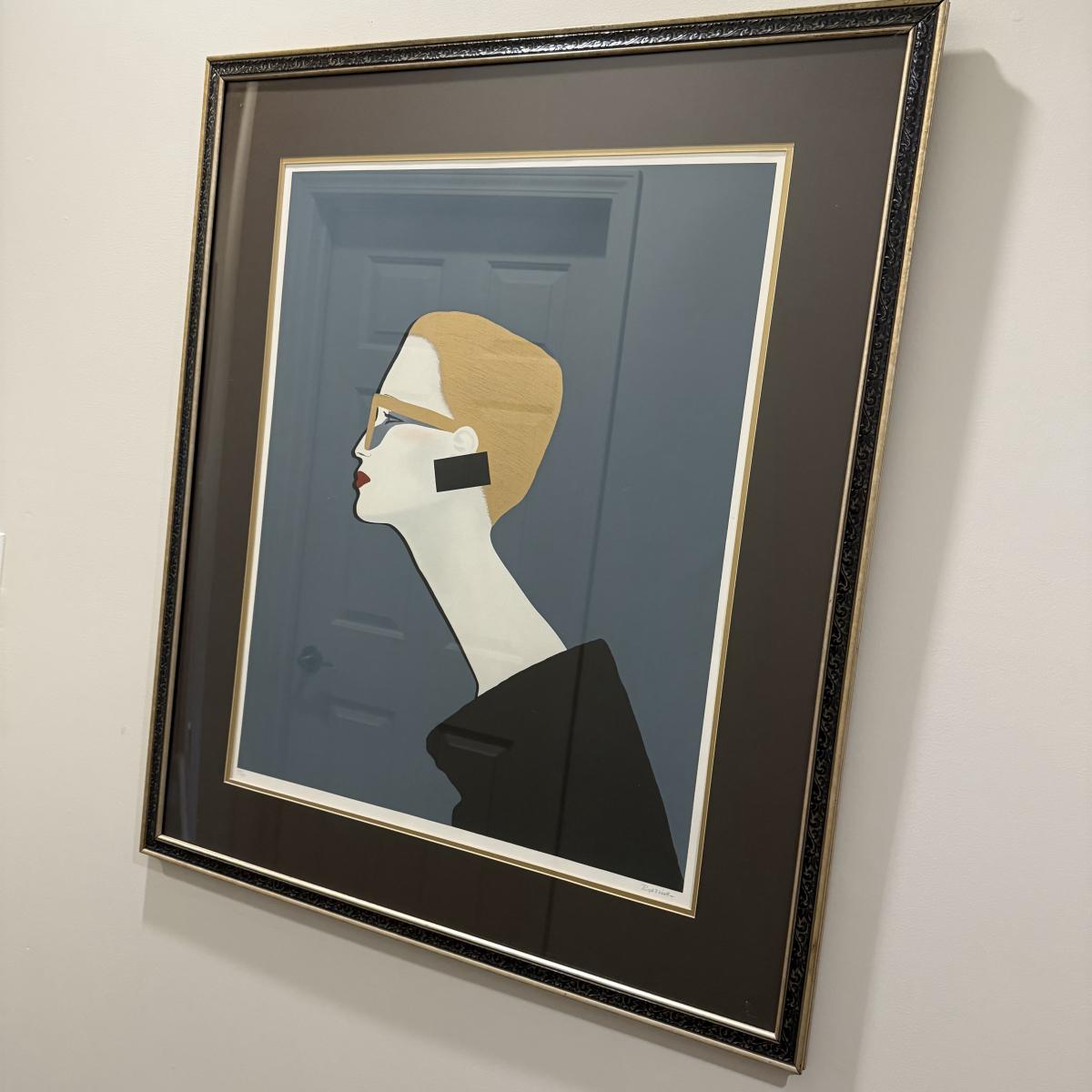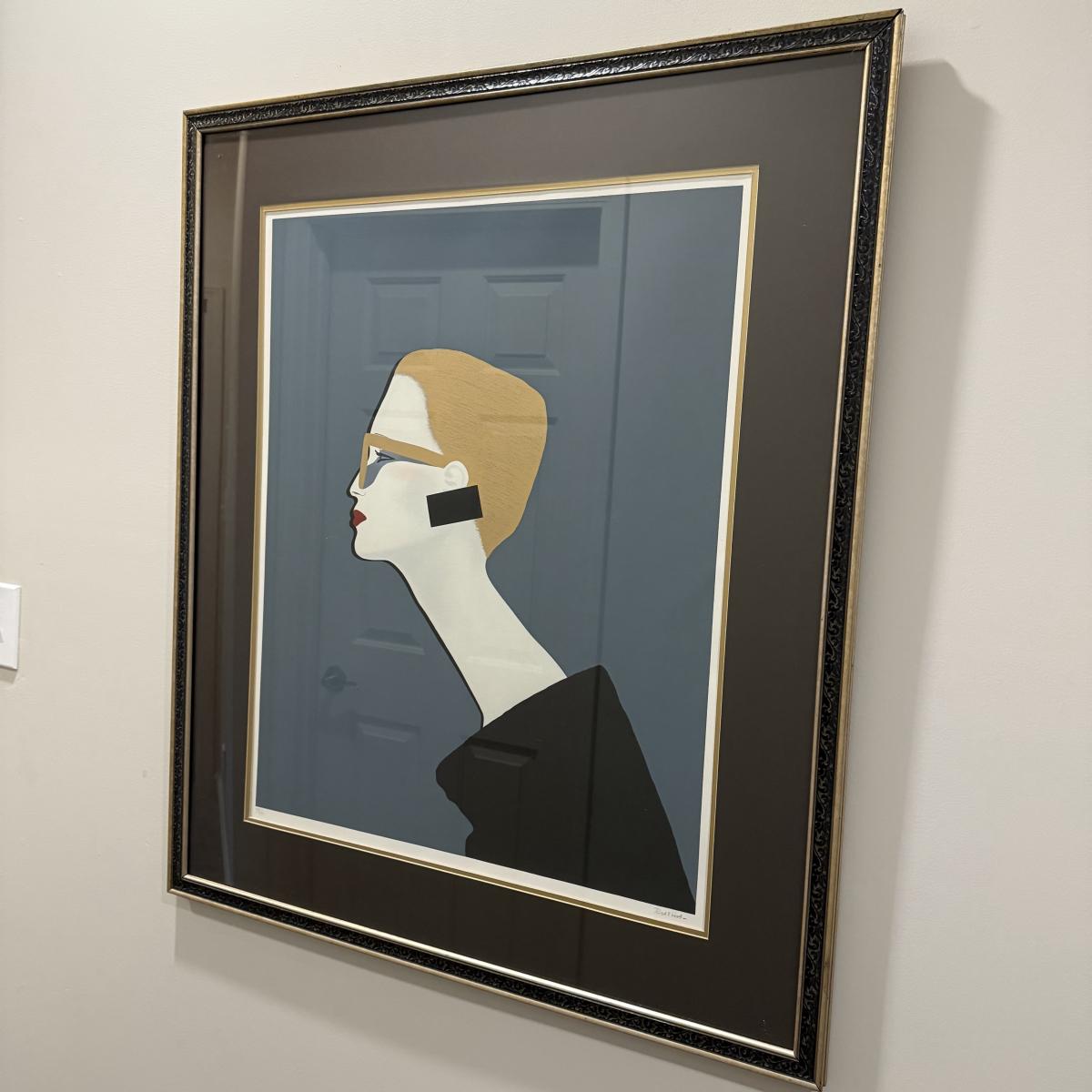 This lot is a stunning large framed print of the profile of a modern woman with her short hair chunky accessories and bold lip color. This spectacular piece sits behind the glass of a black and light gold wooden frame 34” x 40” frame. It is signed with what appears to be ‘Razzia’ and ‘313/350’. This piece does have hardware to be hung. Shipping available. Shipping can be costly. We suggest contacting our preferred local shipping provider, Postage Express, with dimensions and getting an estimate before bidding: (828) 255-9250 or shipping@postageexpressnc.com.