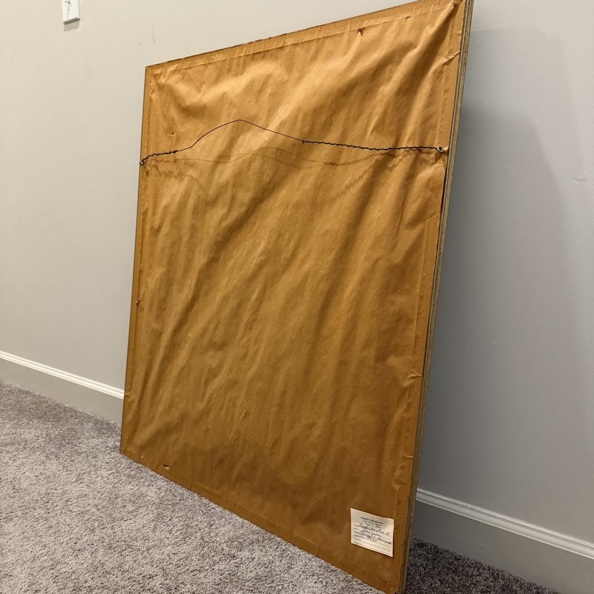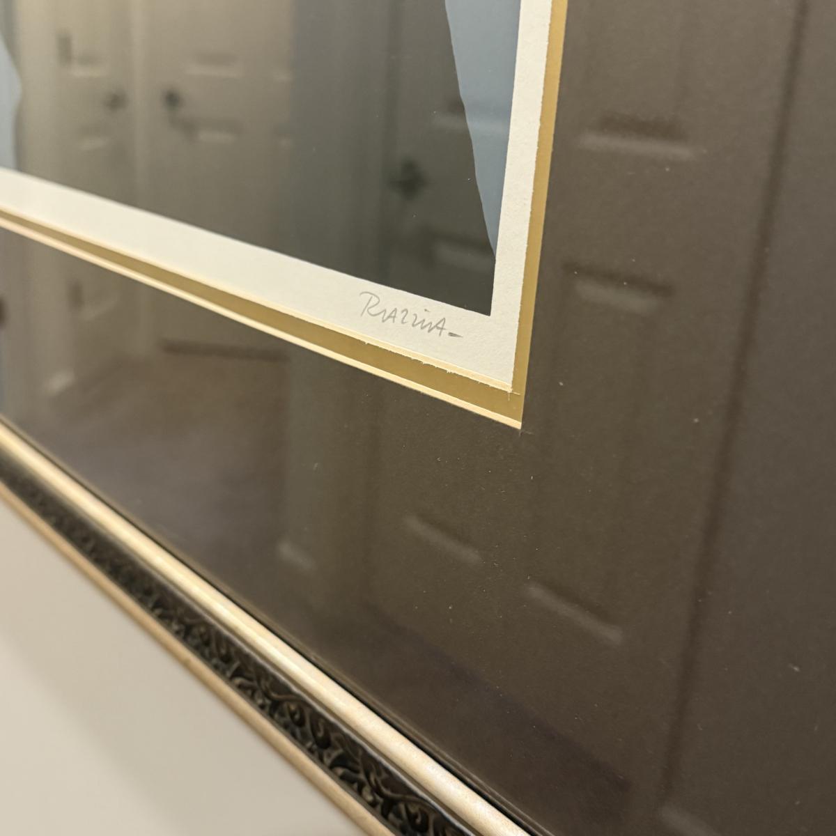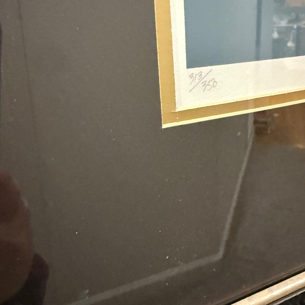 This lot is a stunning large framed print of the profile of a modern woman with her short hair chunky accessories and bold lip color. This spectacular piece sits behind the glass of a black and light gold wooden frame 34” x 40” frame. It is signed with what appears to be ‘Razzia’ and ‘313/350’. This piece does have hardware to be hung. Shipping available. Shipping can be costly. We suggest contacting our preferred local shipping provider, Postage Express, with dimensions and getting an estimate before bidding: (828) 255-9250 or shipping@postageexpressnc.com.