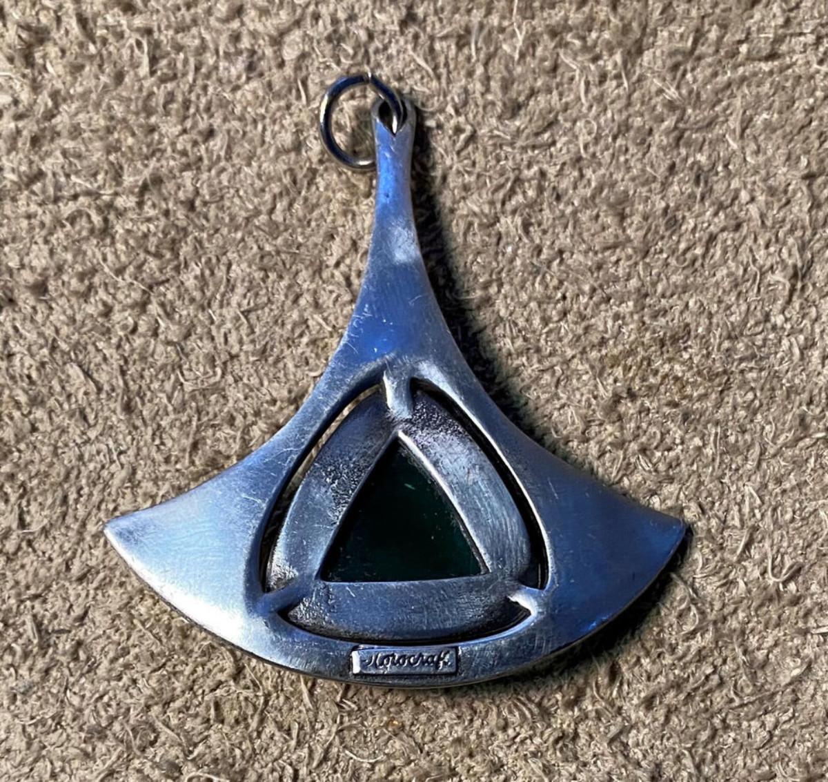 With a nod to modernist Scandinavian design in the Mid Century here is a silvertone pendant with a translucent green glass stone from Corocraft...This signed piece is 2 1/8"/54mm x 2"/51mm...Good condition with some normal use..some light surface wear...as shown...from CORO Jewelry(1901-1979).