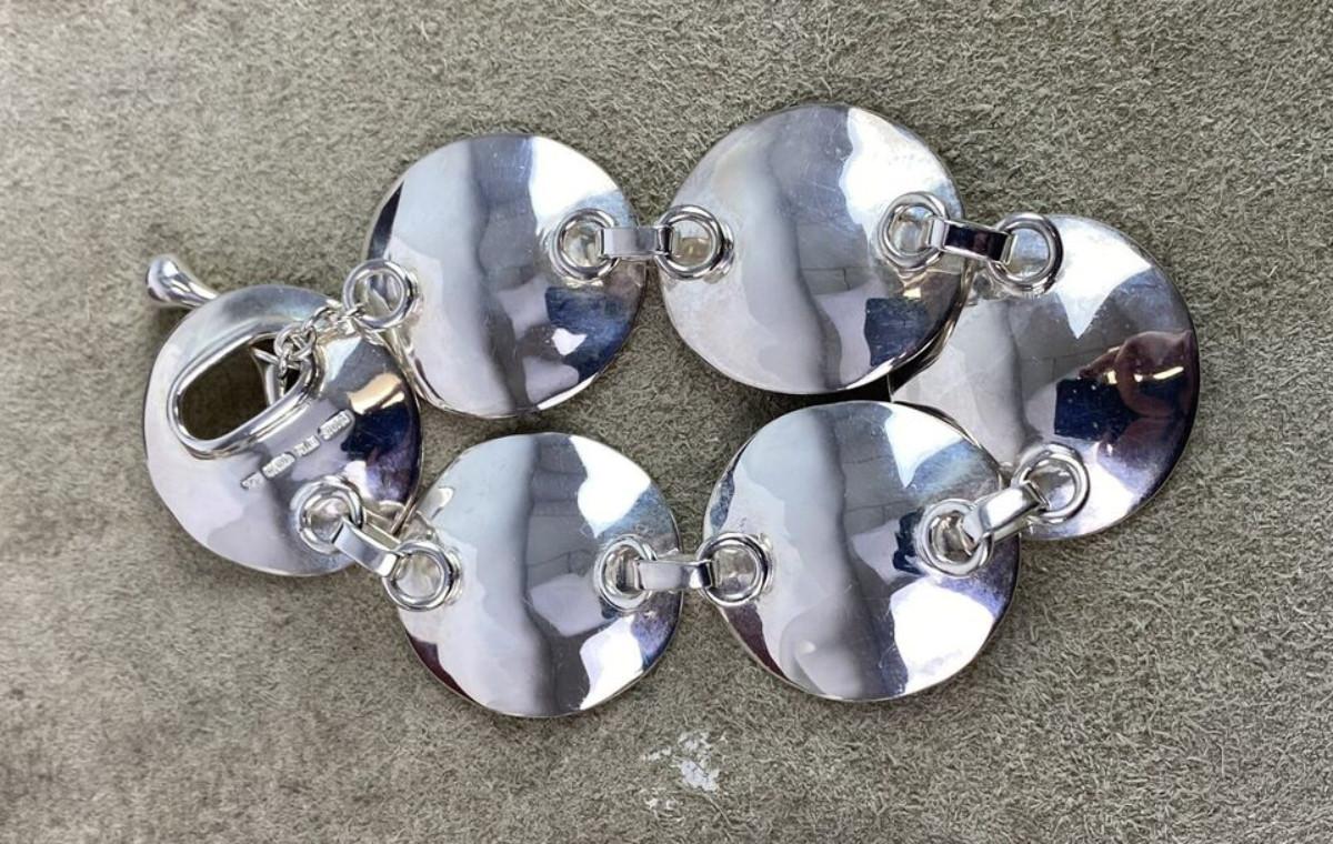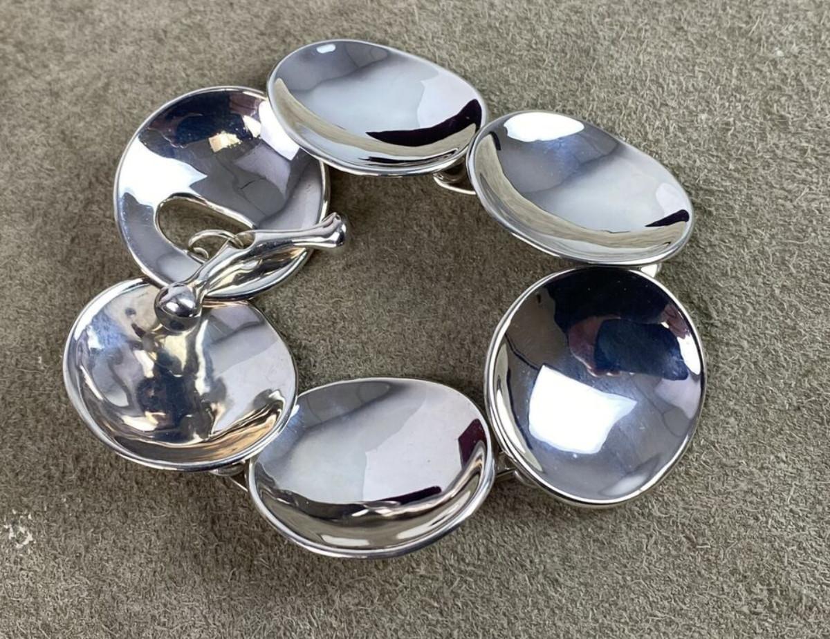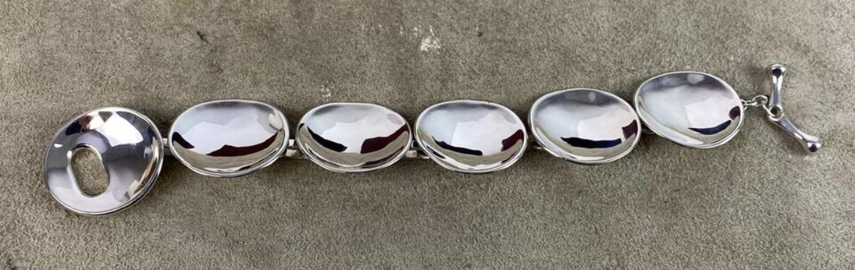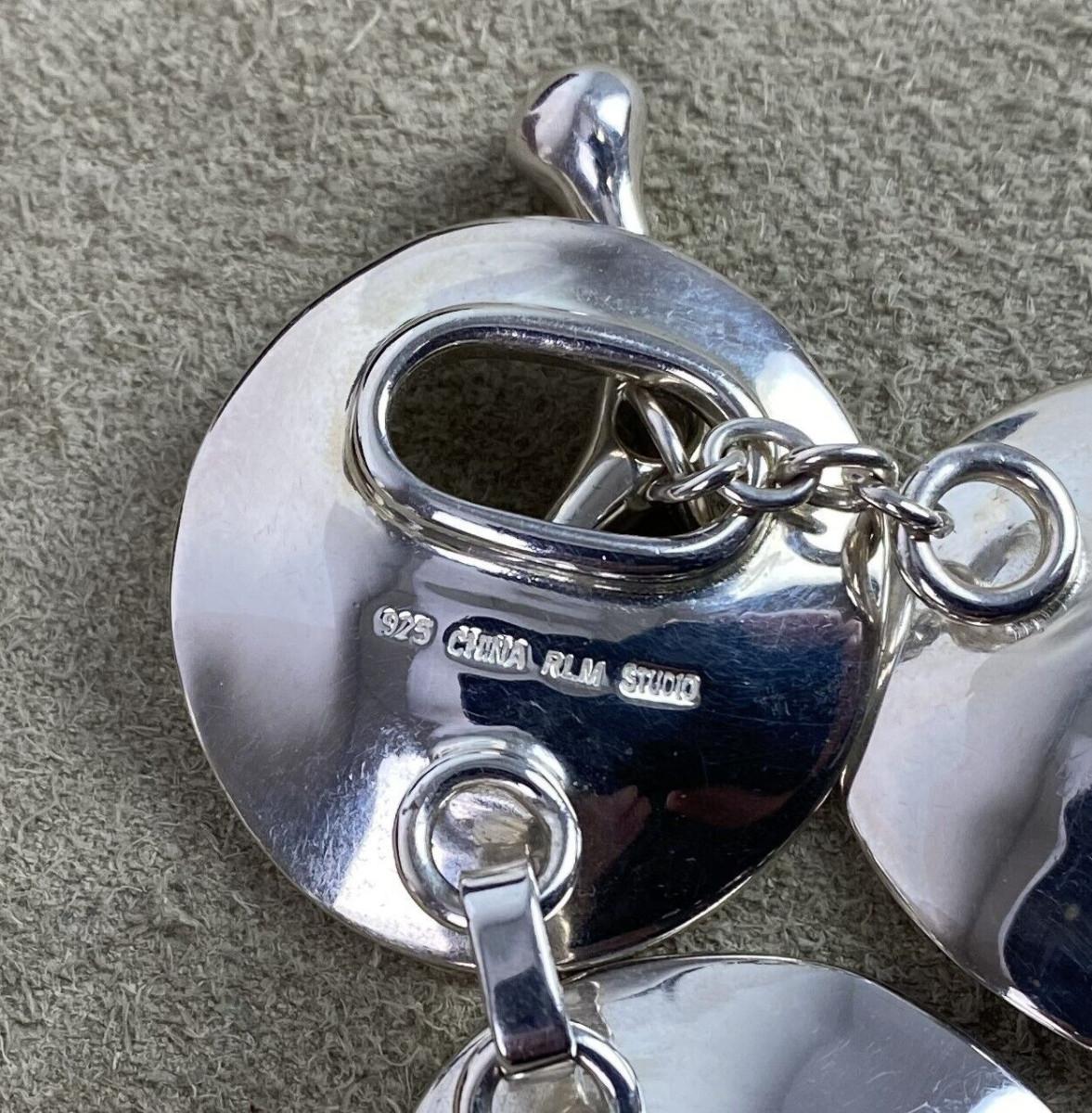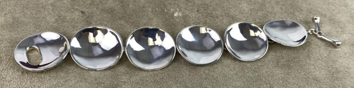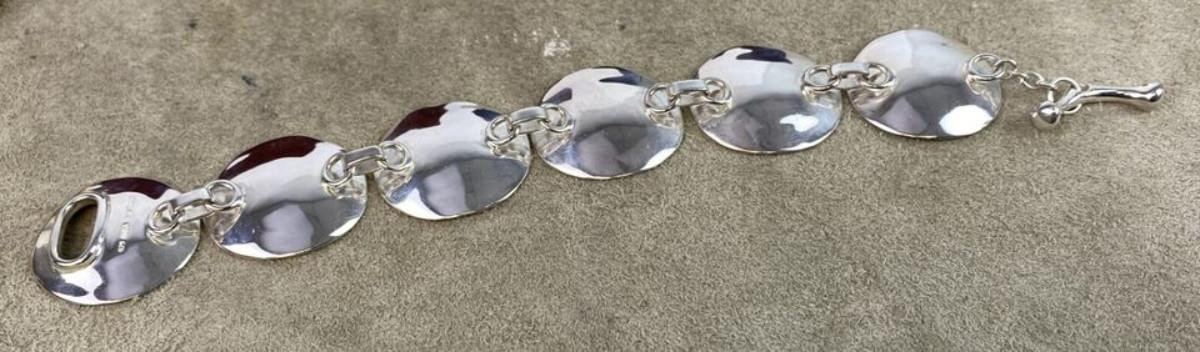 From designed Robert Lee Morris here is an 8-inch toggle bracelet in Sterling silver concave discs...55.1 grams...as shown...slightest use on this estate jewelry…