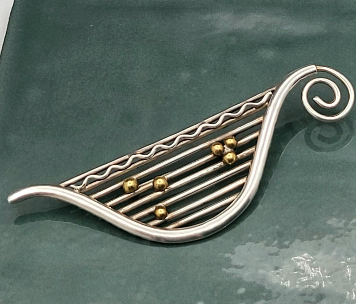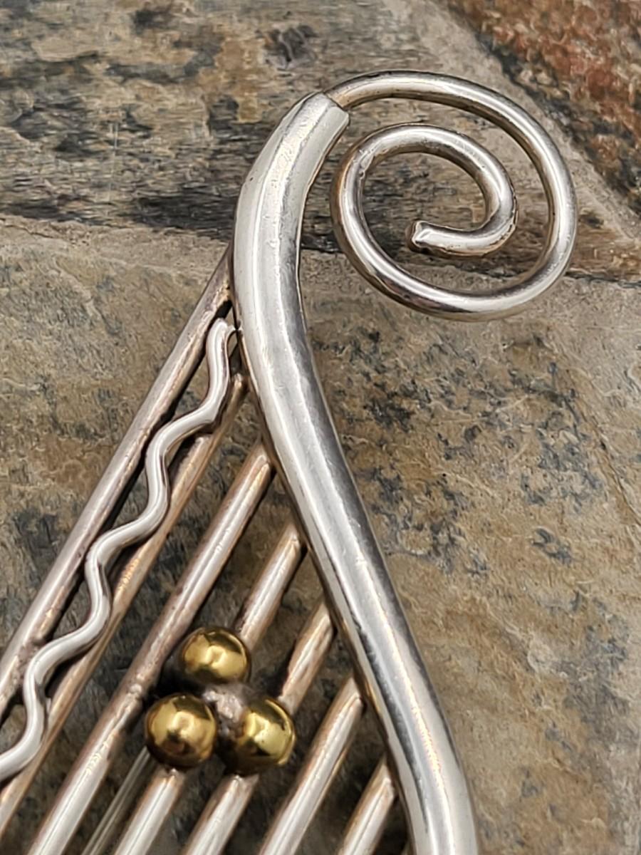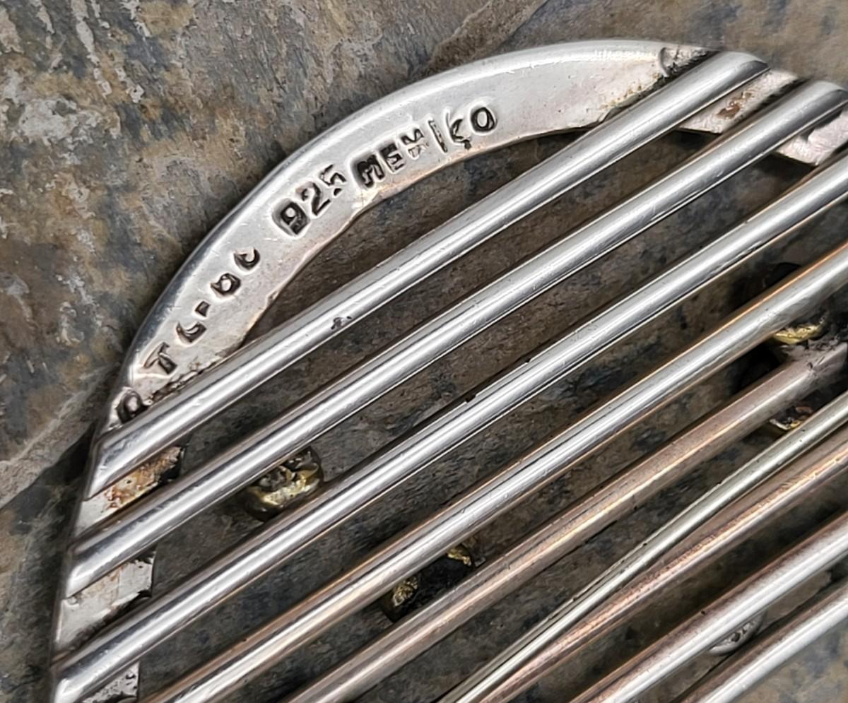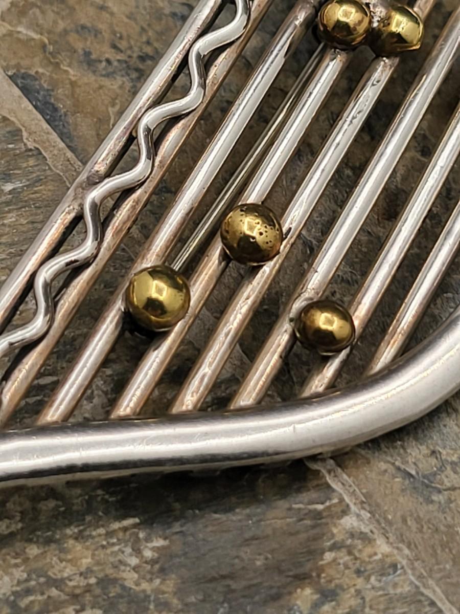 Modernist musical note design with gold or brass accents. Measures 3.75" x 1 25". Mexico 925. Weighs 19.2 grams.