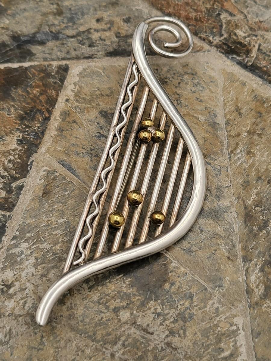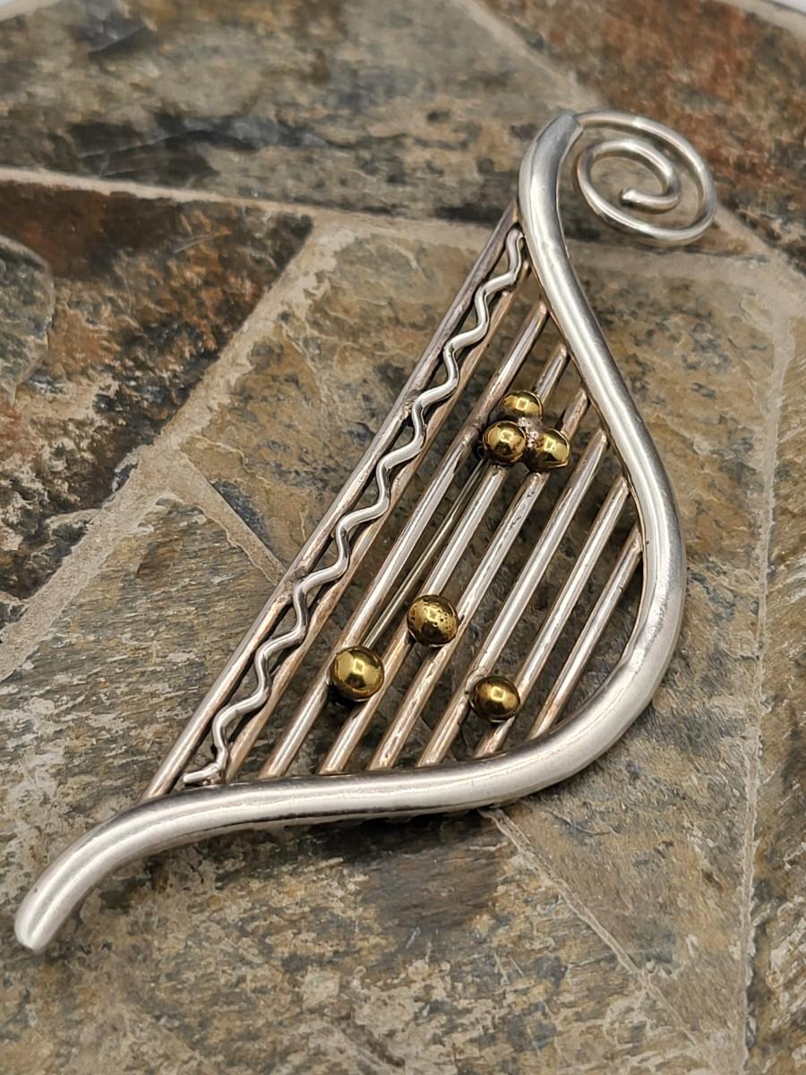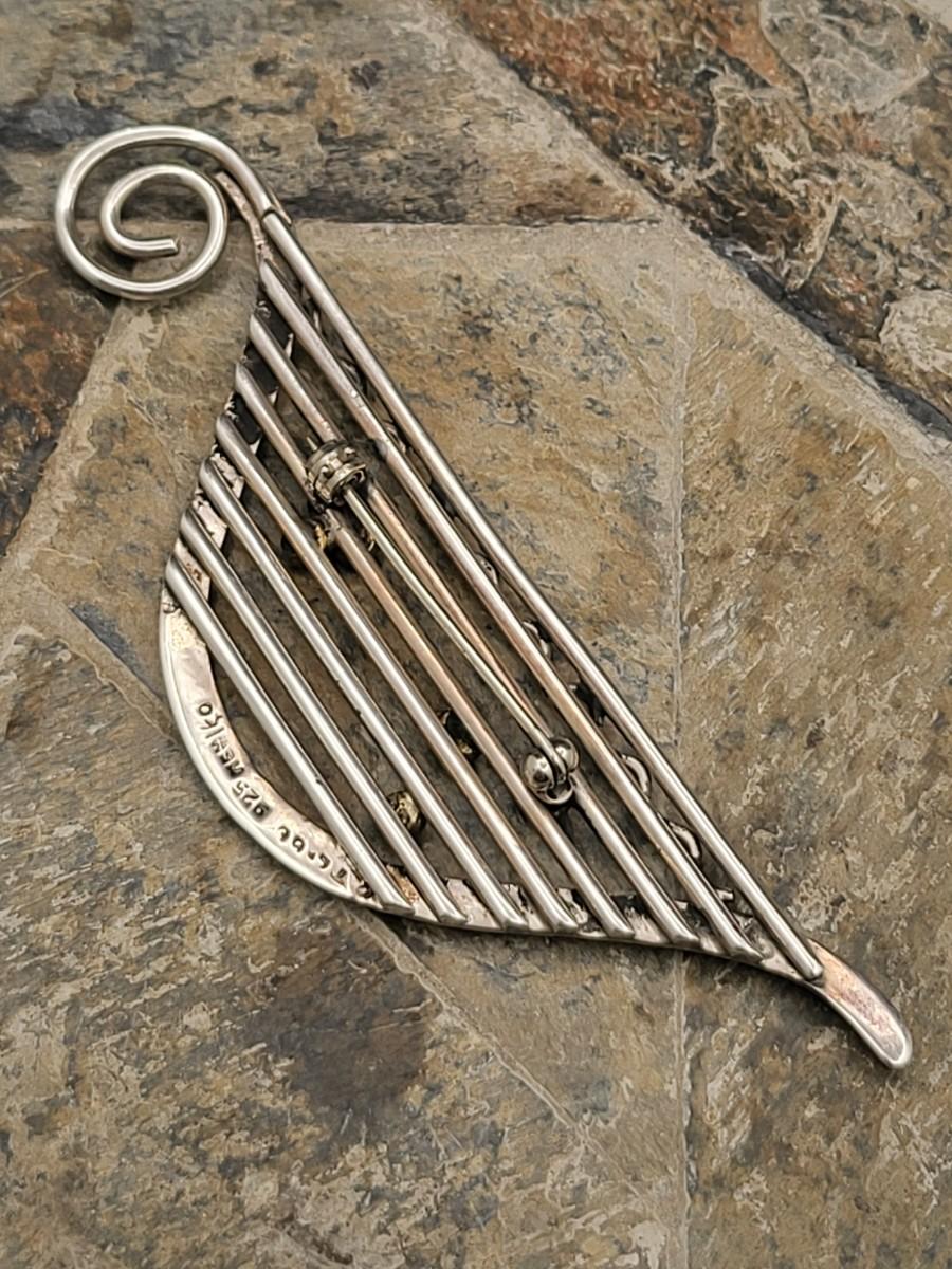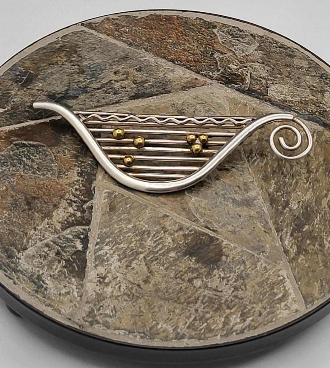 Modernist musical note design with gold or brass accents. Measures 3.75" x 1 25". Mexico 925. Weighs 19.2 grams.