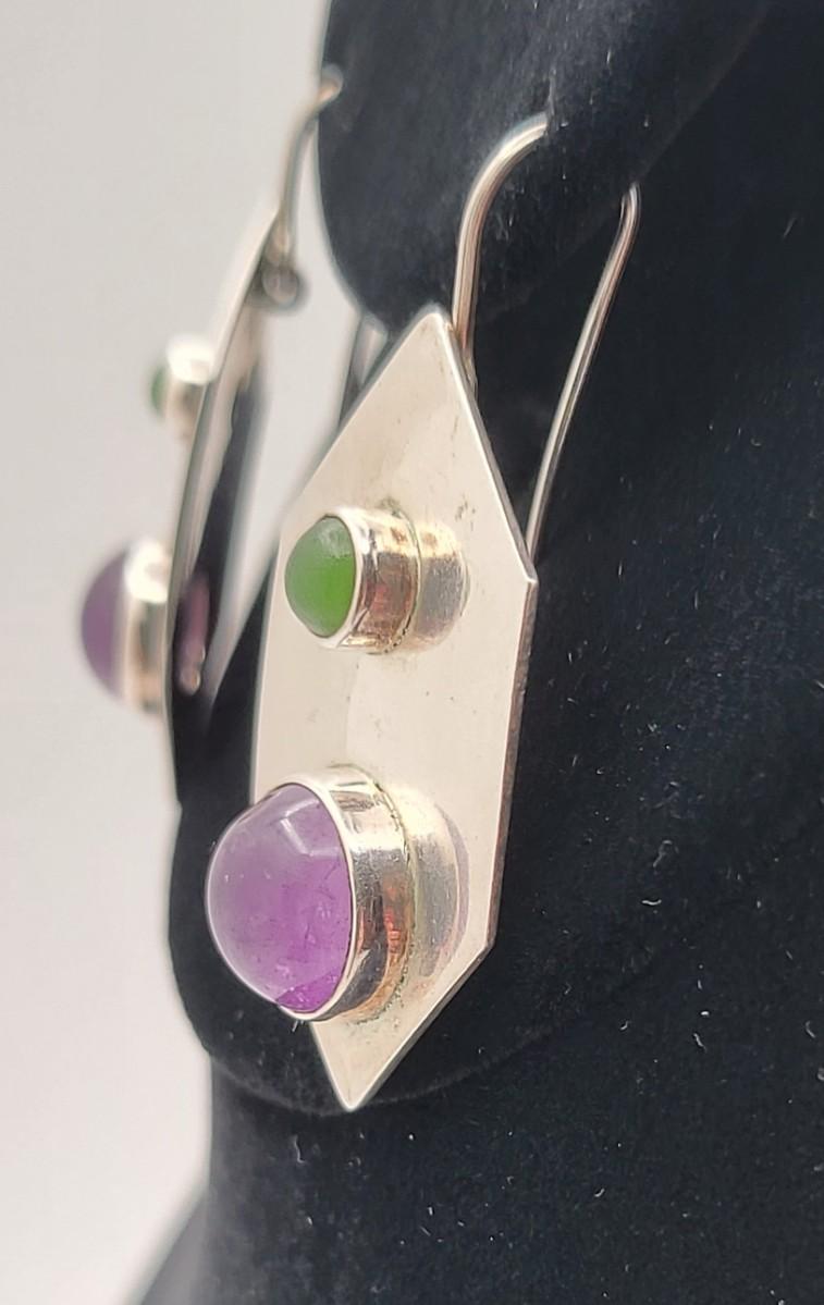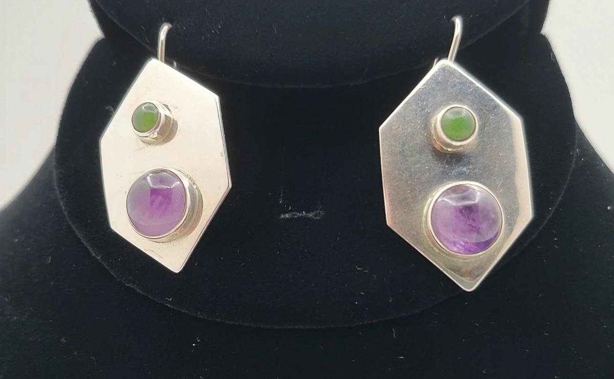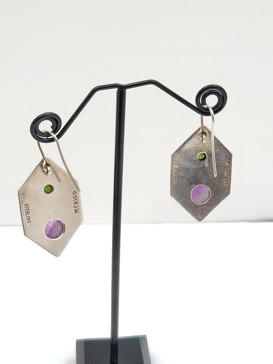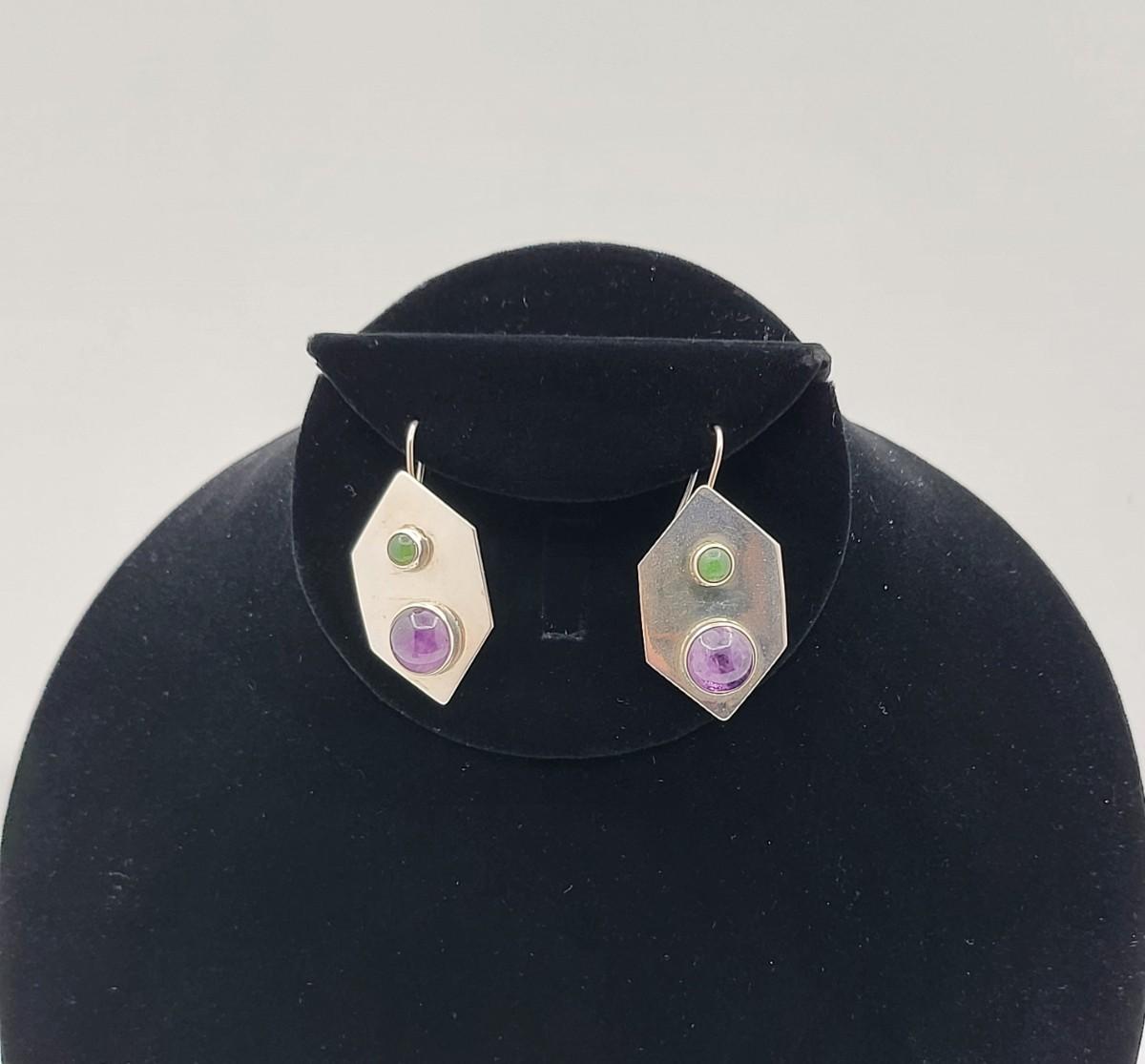 Green quartz stone & Amethyst. Measure 1.25" long x just under 1" wide. Made in Mexico. Weighs 13 grams.