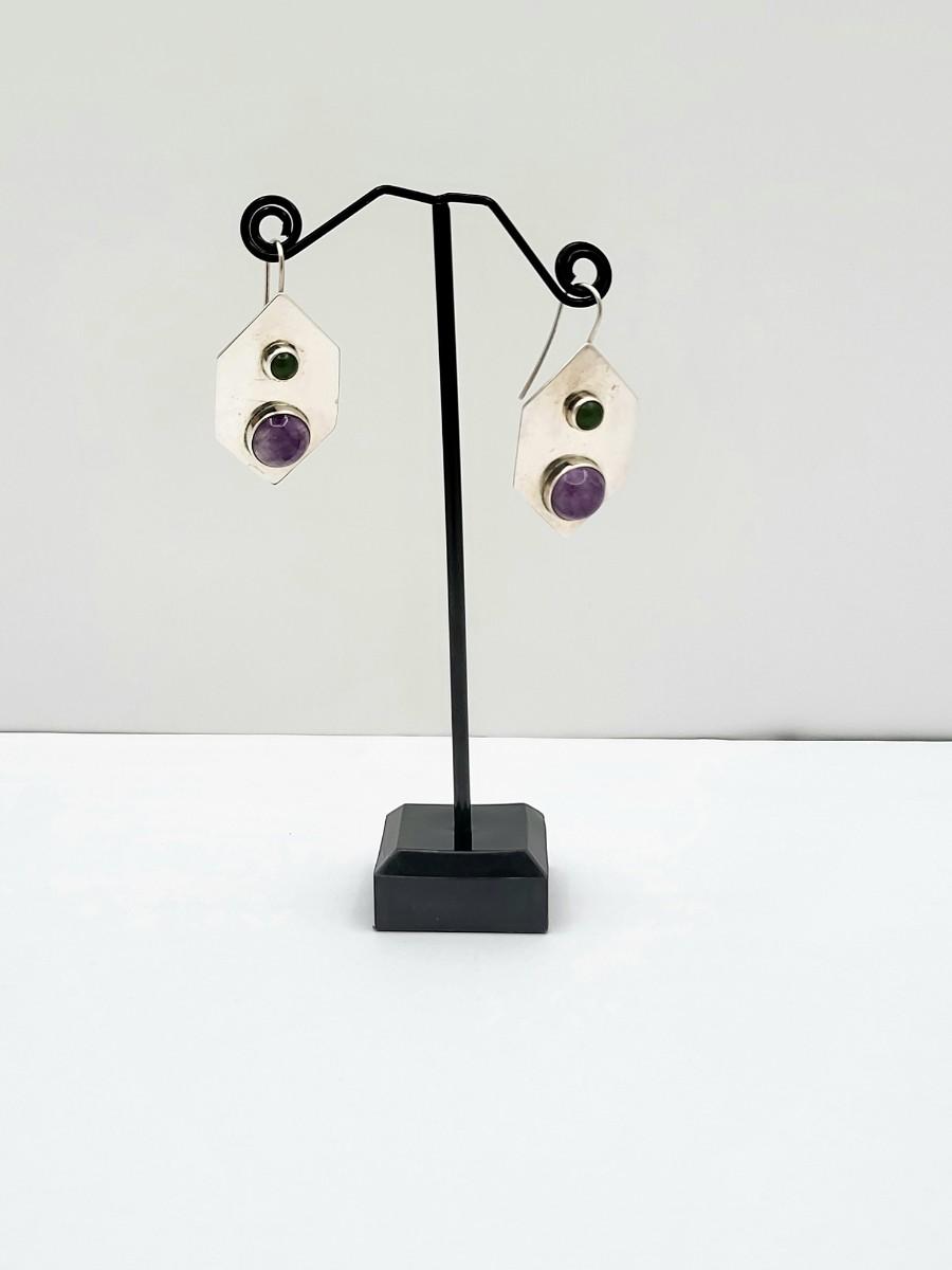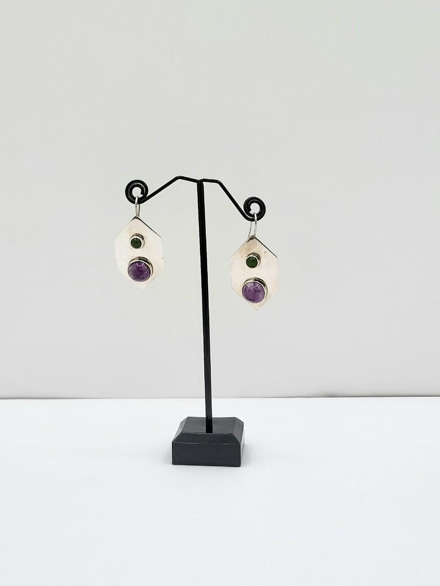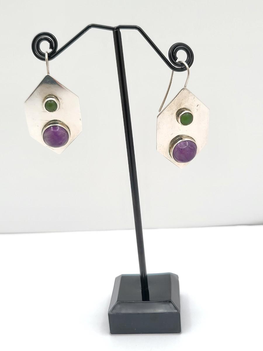 Green quartz stone & Amethyst. Measure 1.25" long x just under 1" wide. Made in Mexico. Weighs 13 grams.