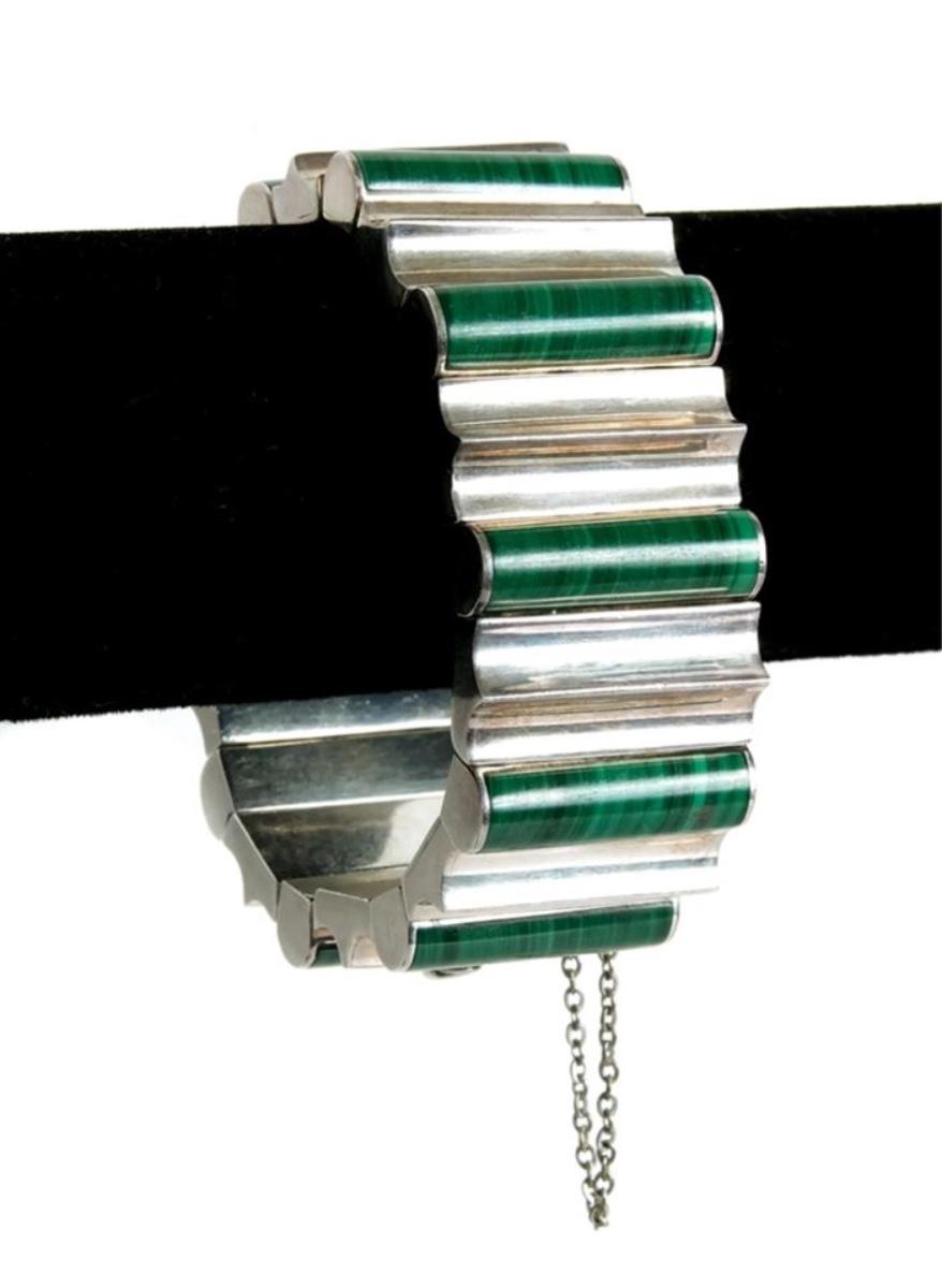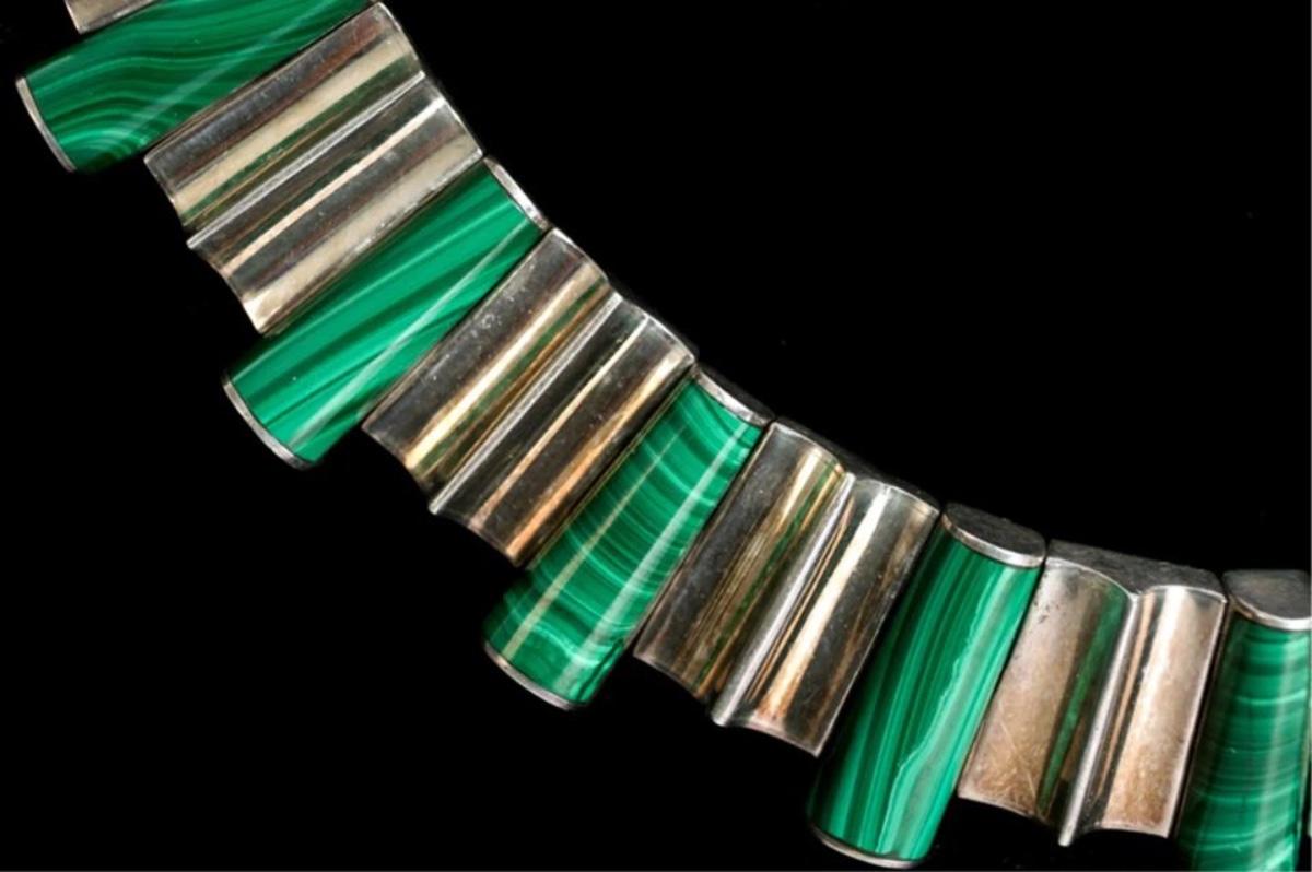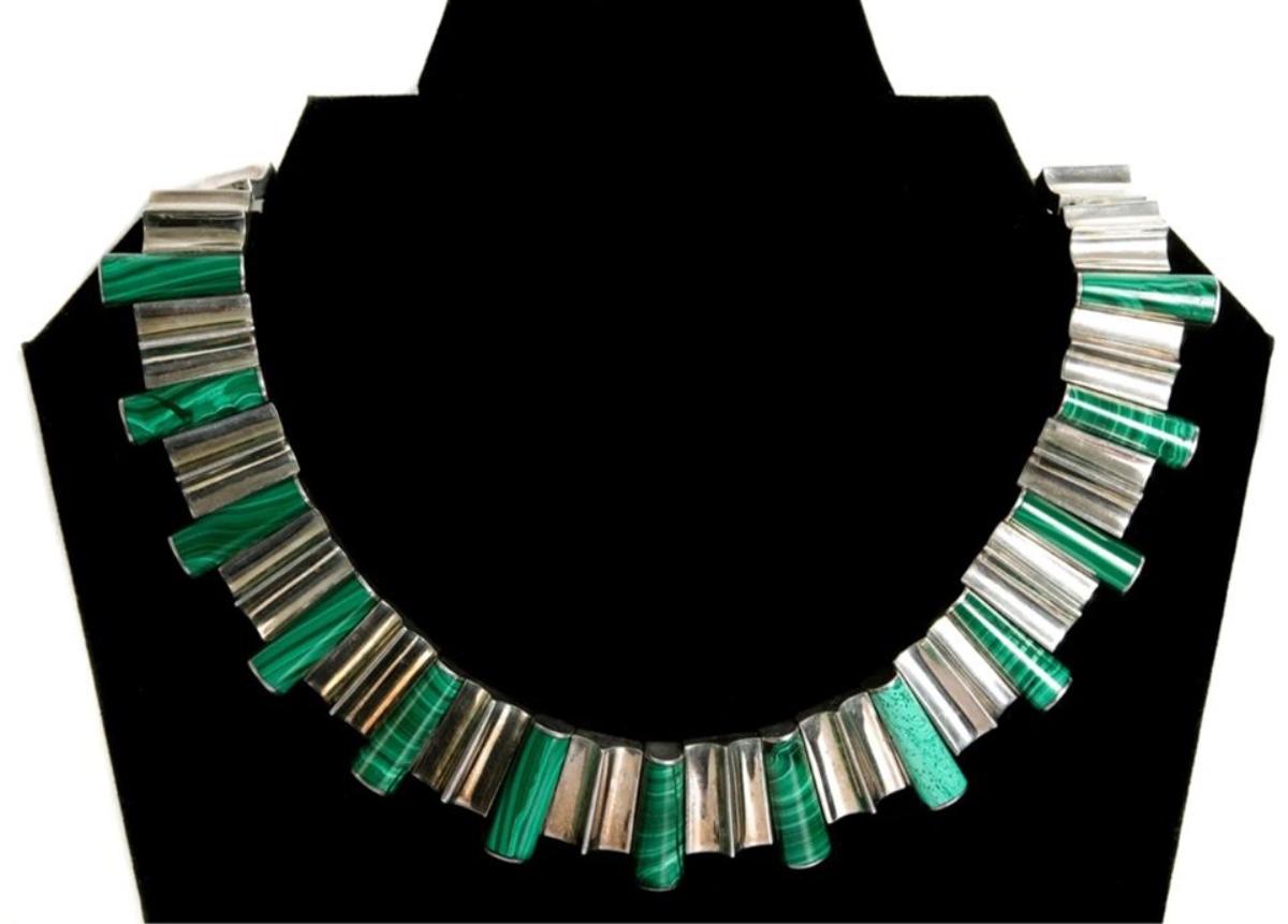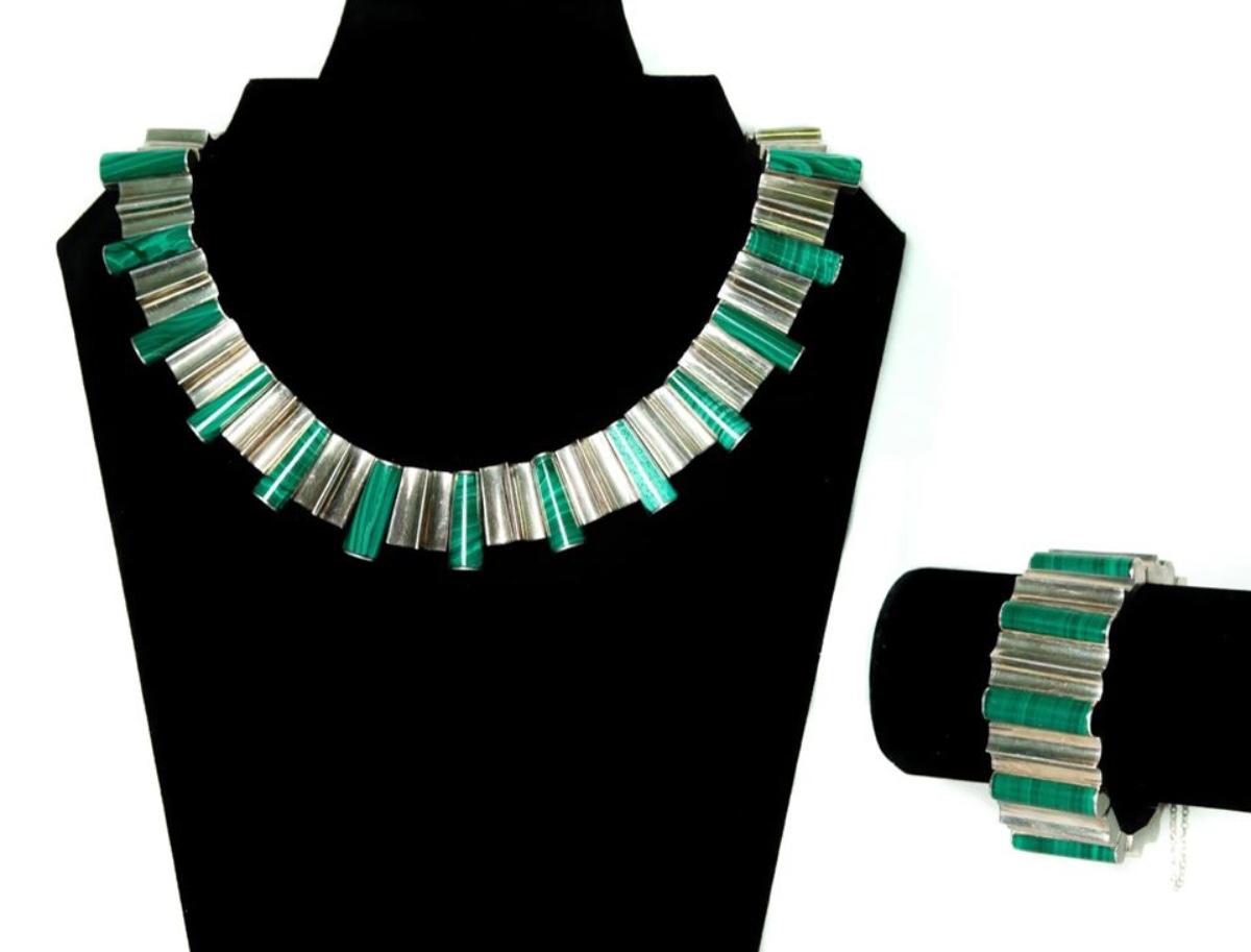Monteros Workshop (Taxco, Mexico), Modernist heavy 970 silver and malachite necklace with matching bracelet, the necklace having thirty nine individual bars, thirteen of which with malachite inlay rods and the bracelet having twenty individual bars, ten of which with malachite inlay rods. Both hallmarked MONTEROS/ M-970/TM100/ Mexico. Approx. circumference of necklace 15 in, width 1 in, weight 6.5 troy ounces. Approx. interior diameter of bracelet 2.5 in, width 1.12 in, weight 4.9 troy ounces.