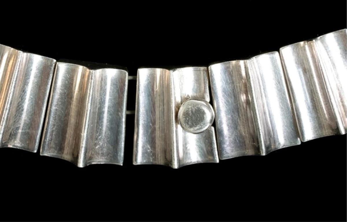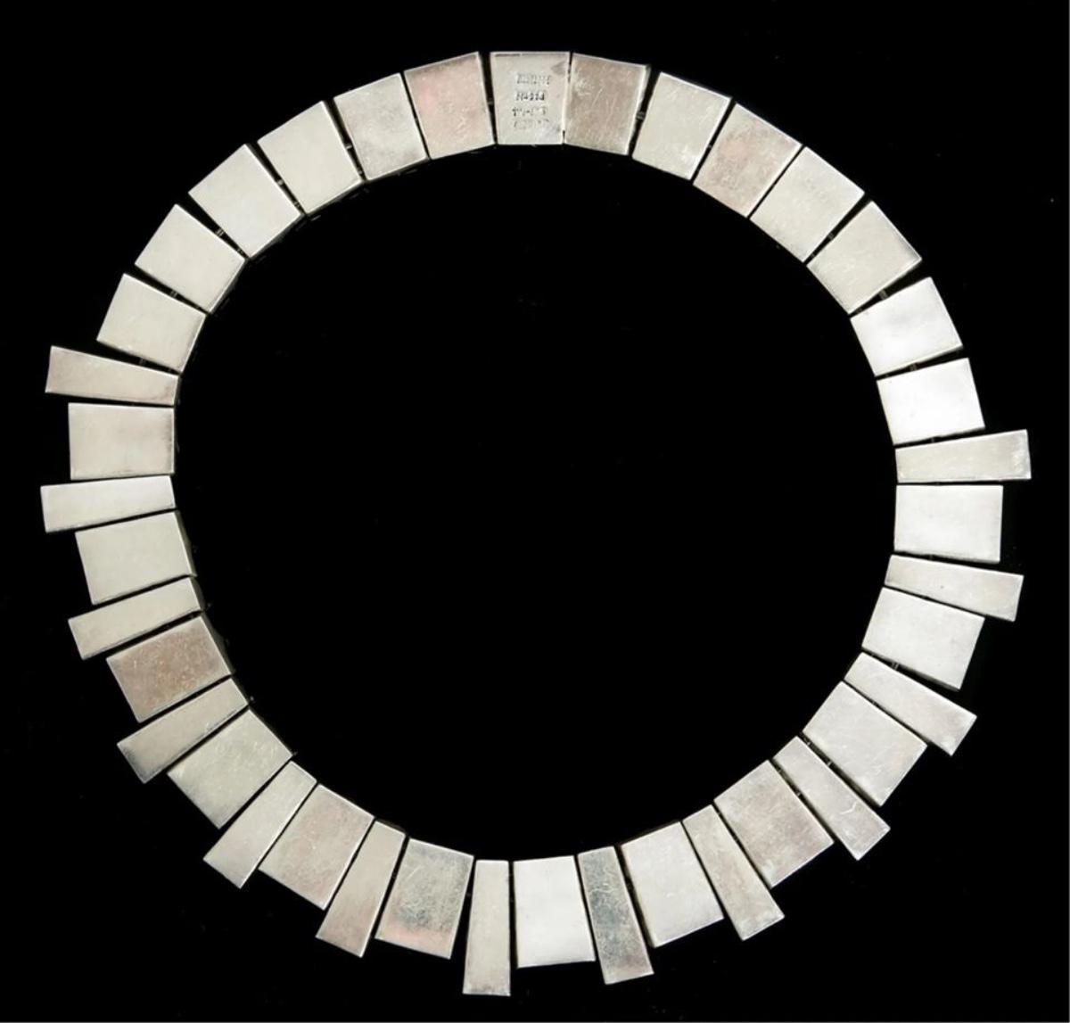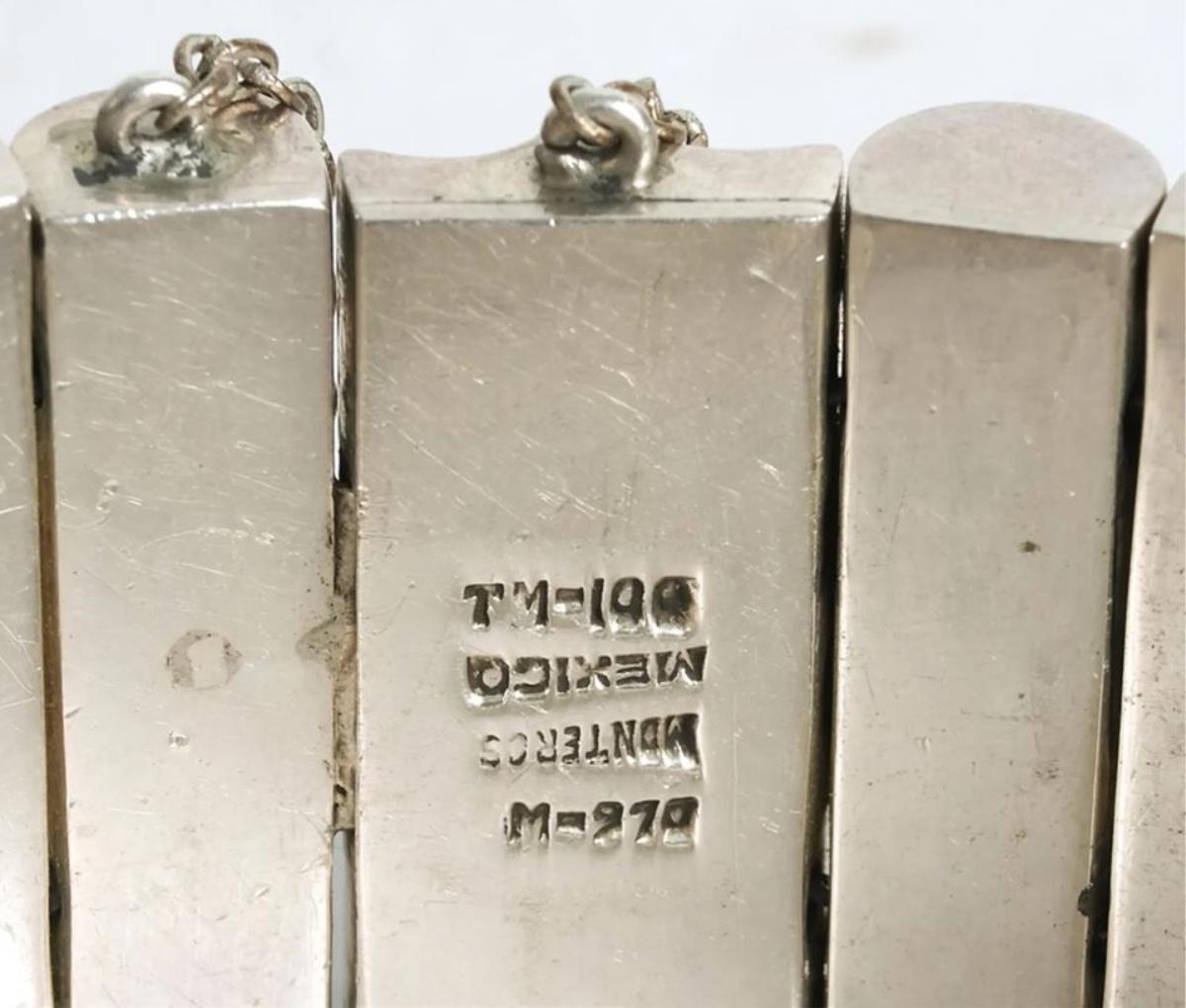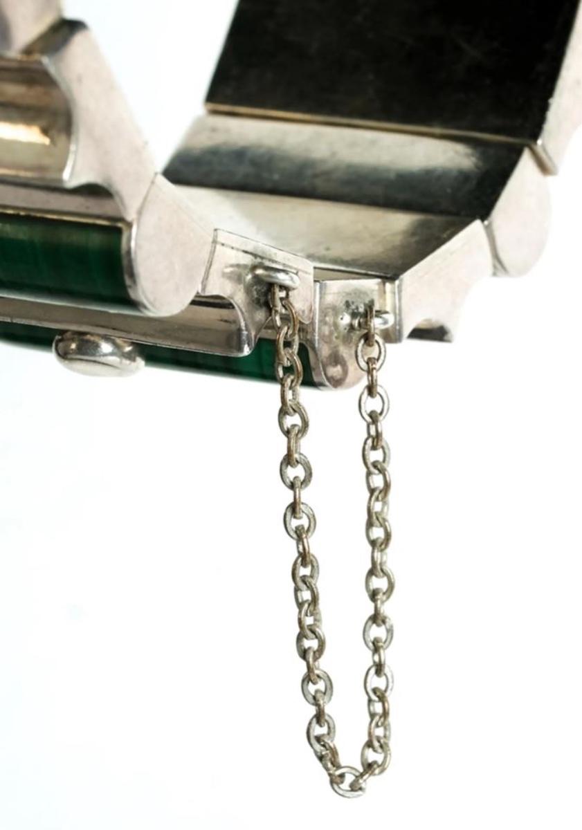 Monteros Workshop (Taxco, Mexico), Modernist heavy 970 silver and malachite necklace with matching bracelet, the necklace having thirty nine individual bars, thirteen of which with malachite inlay rods and the bracelet having twenty individual bars, ten of which with malachite inlay rods. Both hallmarked MONTEROS/ M-970/TM100/ Mexico. Approx. circumference of necklace 15 in, width 1 in, weight 6.5 troy ounces. Approx. interior diameter of bracelet 2.5 in, width 1.12 in, weight 4.9 troy ounces.