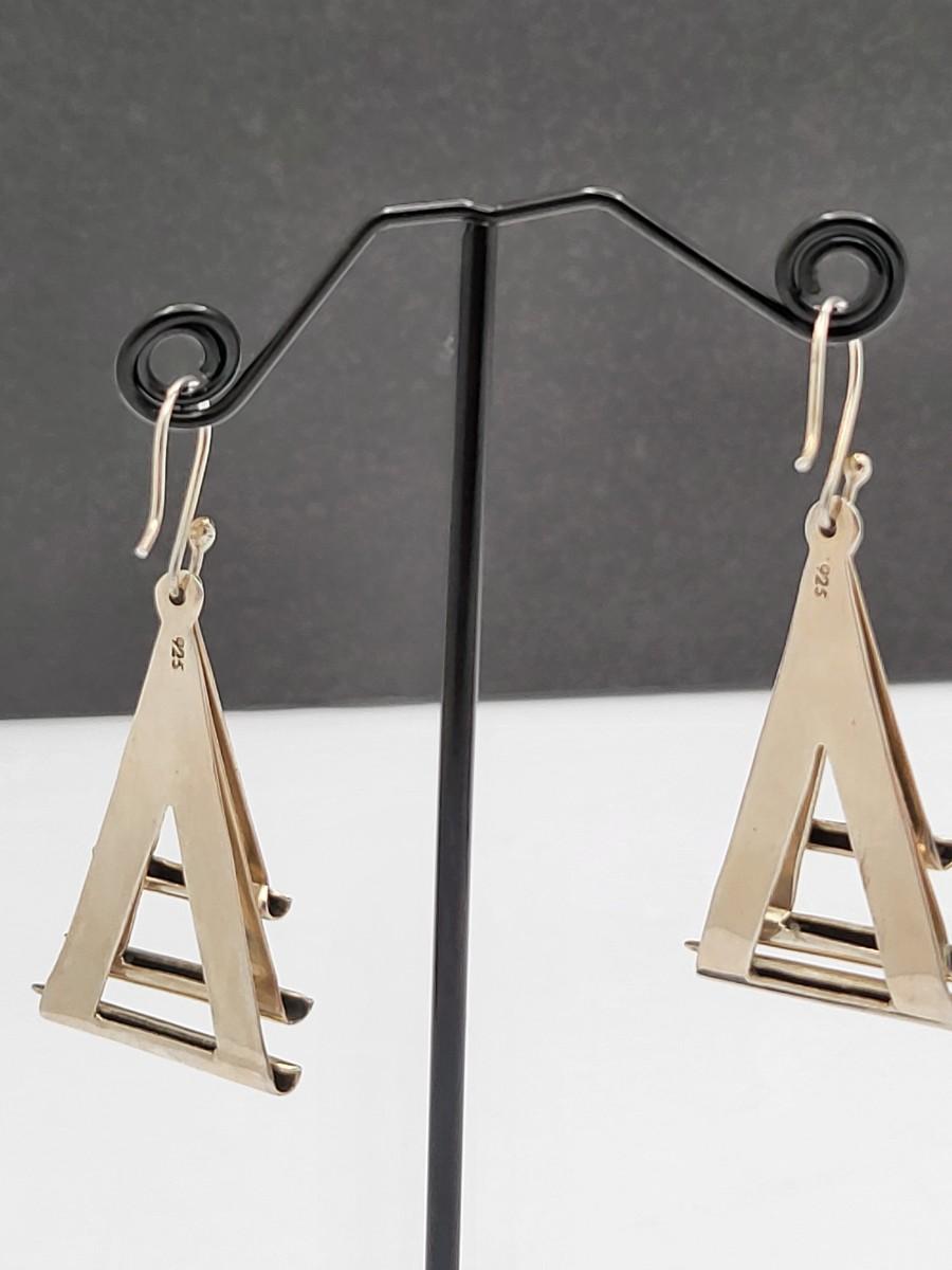 Modernist, artisan three triangle dangle pierced earrings, sterling silver. Measure 1.5" x 1". Both are stamped 925. Weighs 12.7 grams.