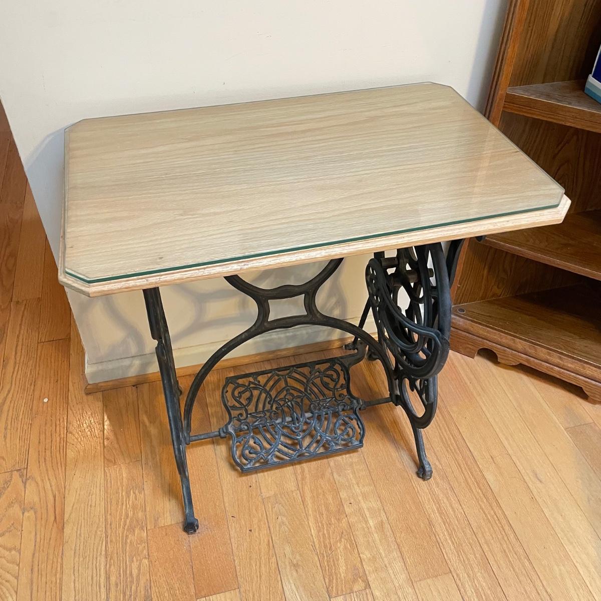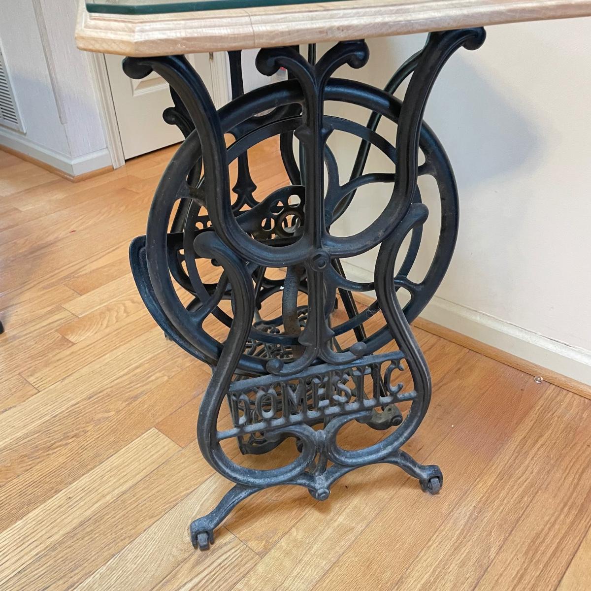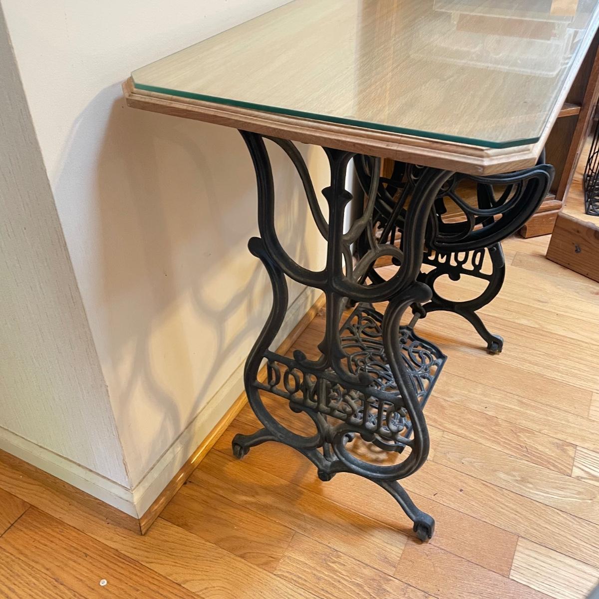 Cast iron Domestic sewing table base with light colored wood top and custom cut glass cover. Base has castors and could use a thorough dusting. The pedal still spins the wheel. Table top has some wear and a slight crack, most of the wear looks easily covered up or fixed completely by cleaning it. Full table measures 30” x 18.5” x 29”H. See images. Local pick up only. Winning bidder must bring assistance to help move and load this item due to its weight and/or size.