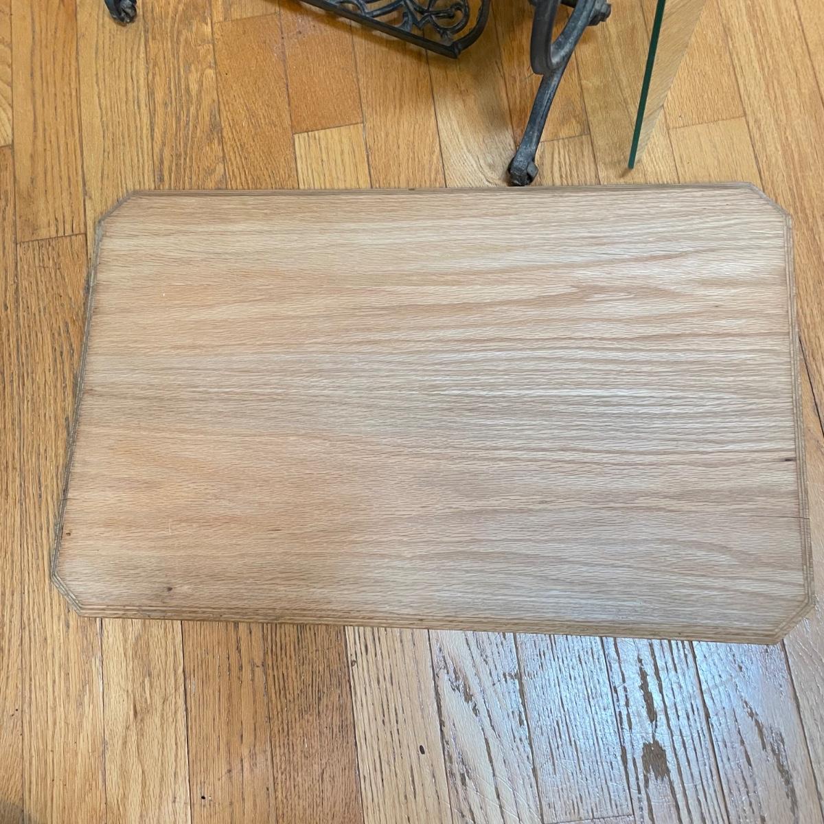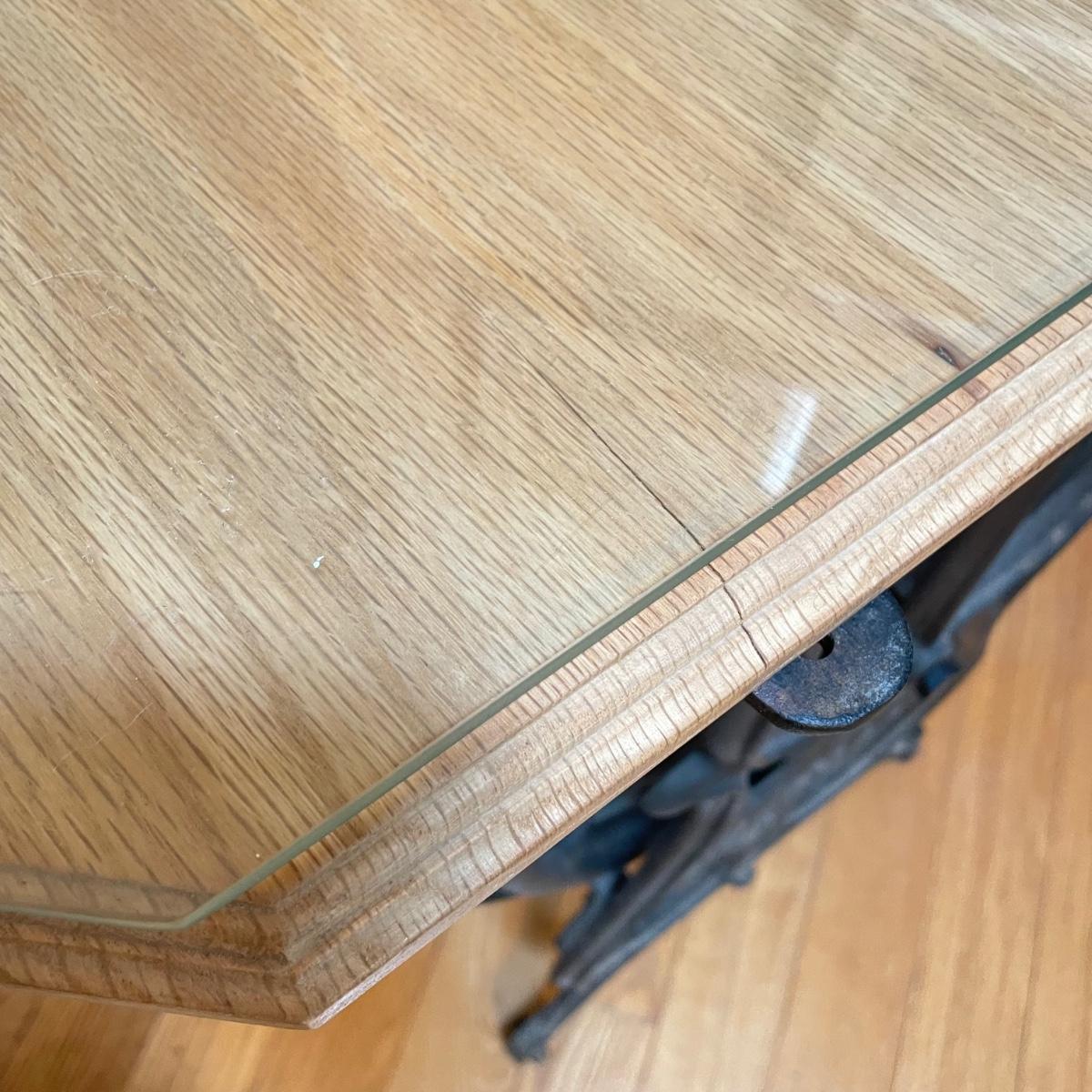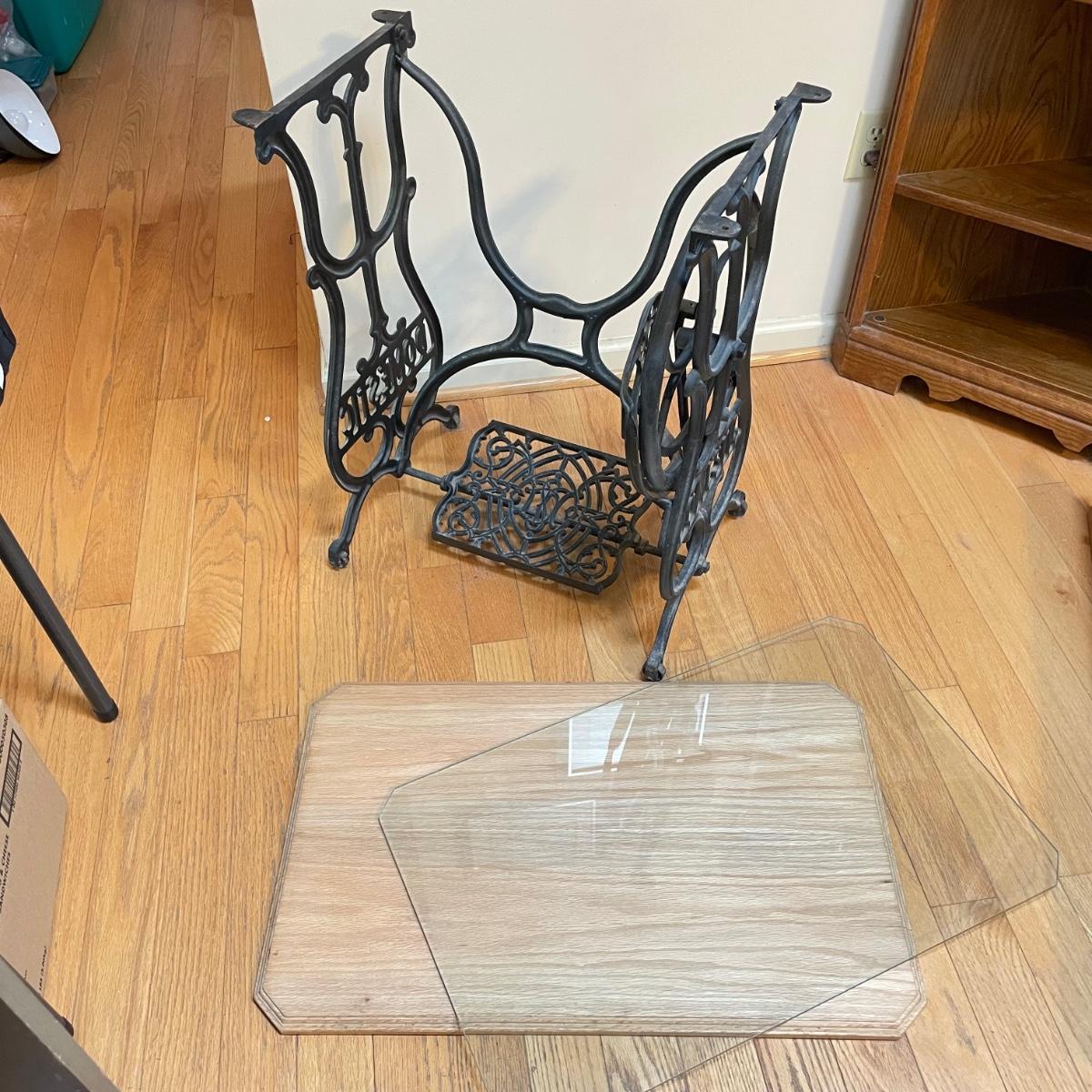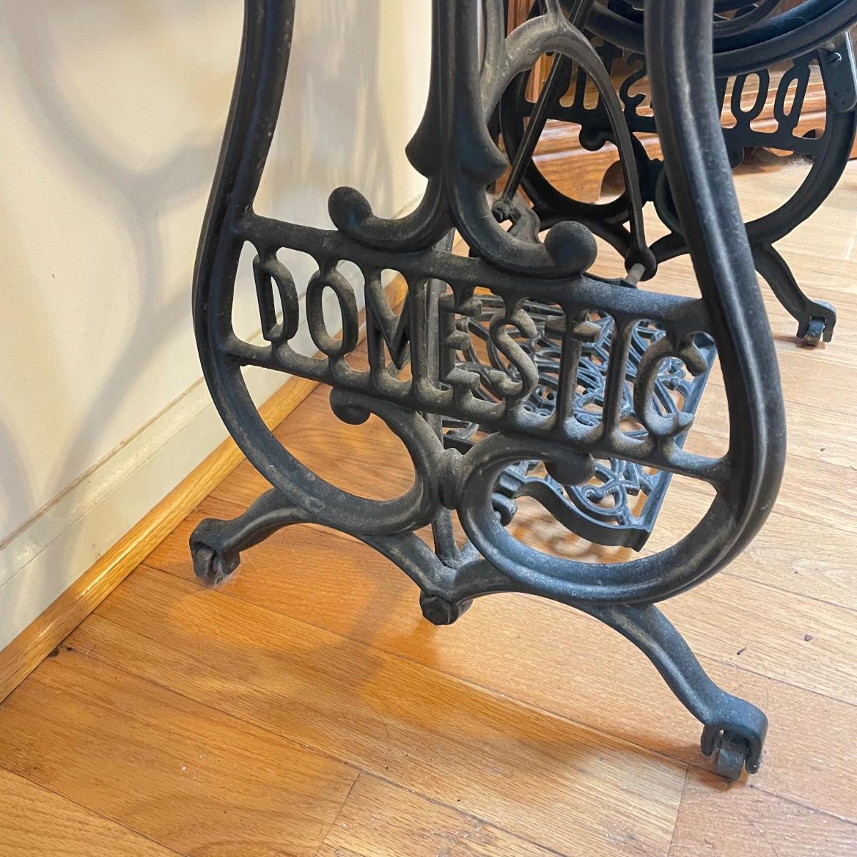 Cast iron Domestic sewing table base with light colored wood top and custom cut glass cover. Base has castors and could use a thorough dusting. The pedal still spins the wheel. Table top has some wear and a slight crack, most of the wear looks easily covered up or fixed completely by cleaning it. Full table measures 30” x 18.5” x 29”H. See images. Local pick up only. Winning bidder must bring assistance to help move and load this item due to its weight and/or size.