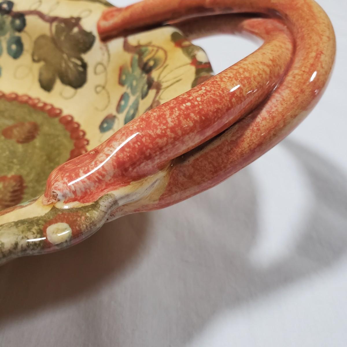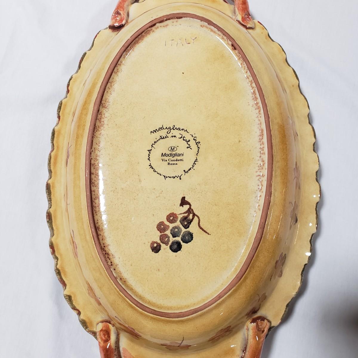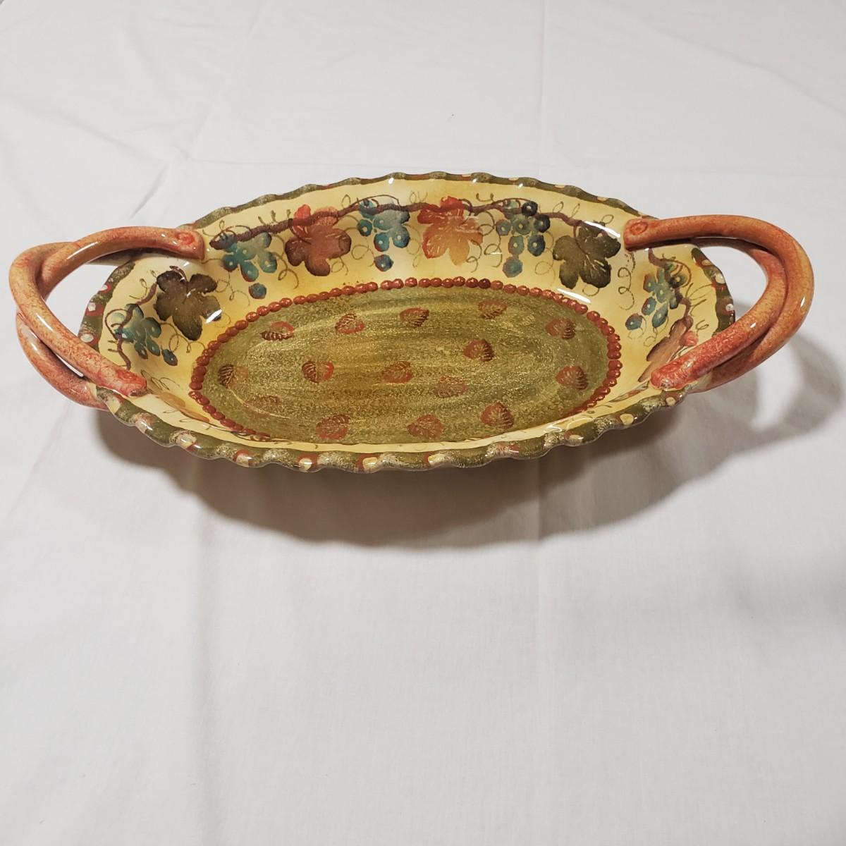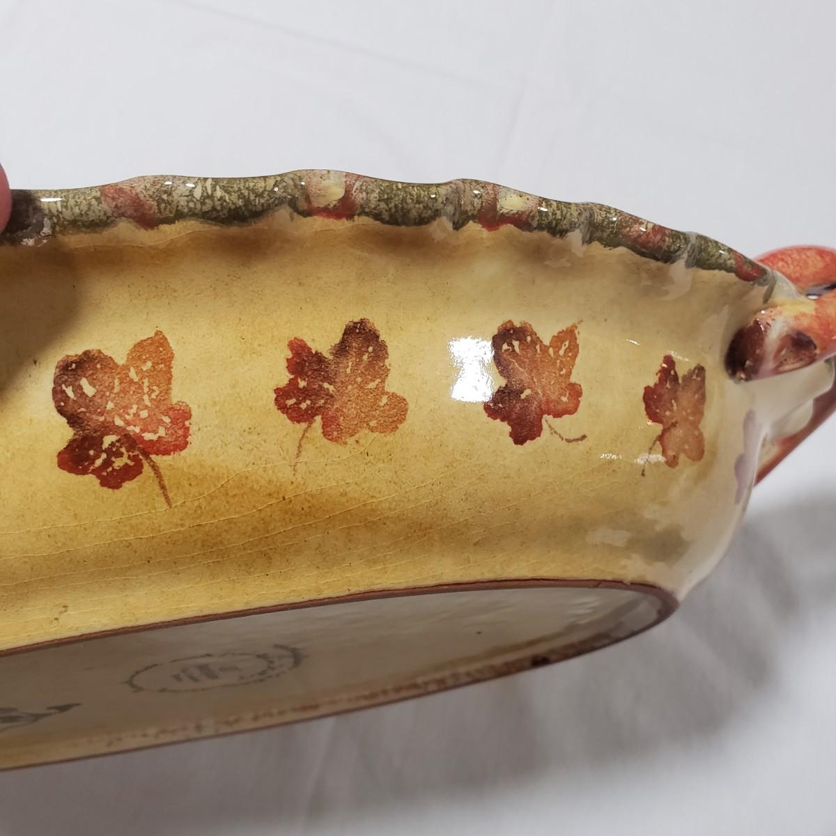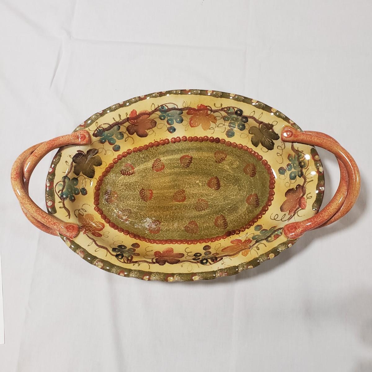 This serving platter with handles is made by Modigliani in Italy. The earthenware measures approximately 17" x 10" x 2"H. It is decorated with fall like colors of leaves and grapes.