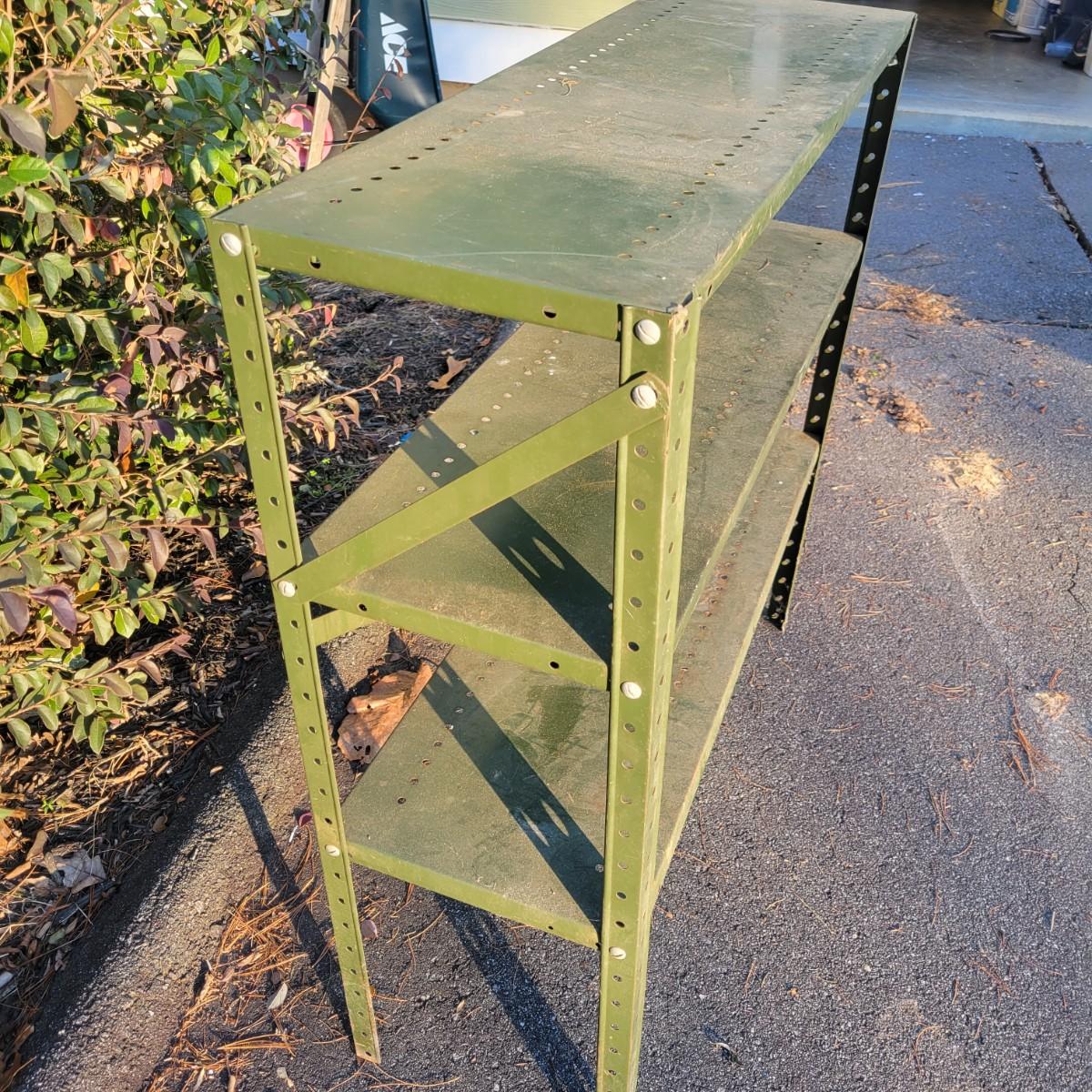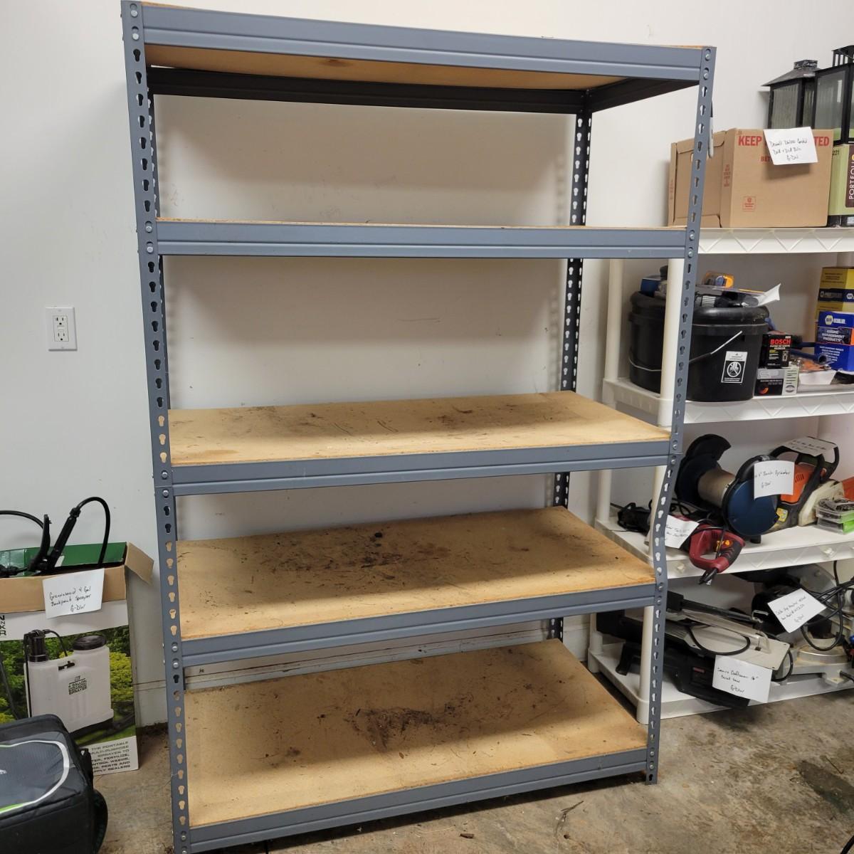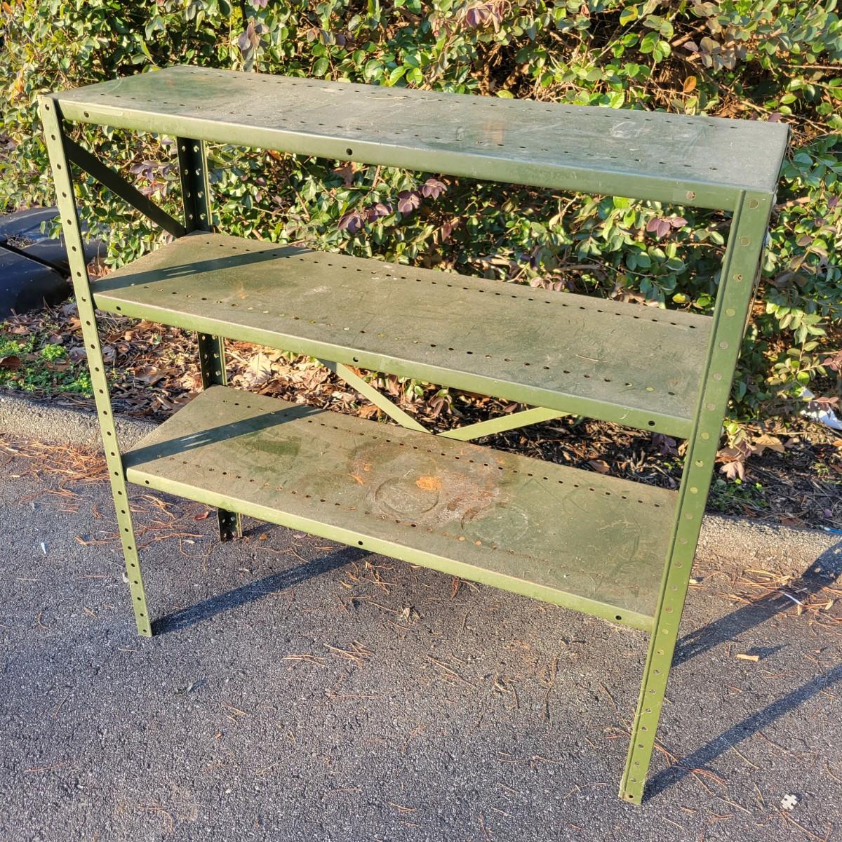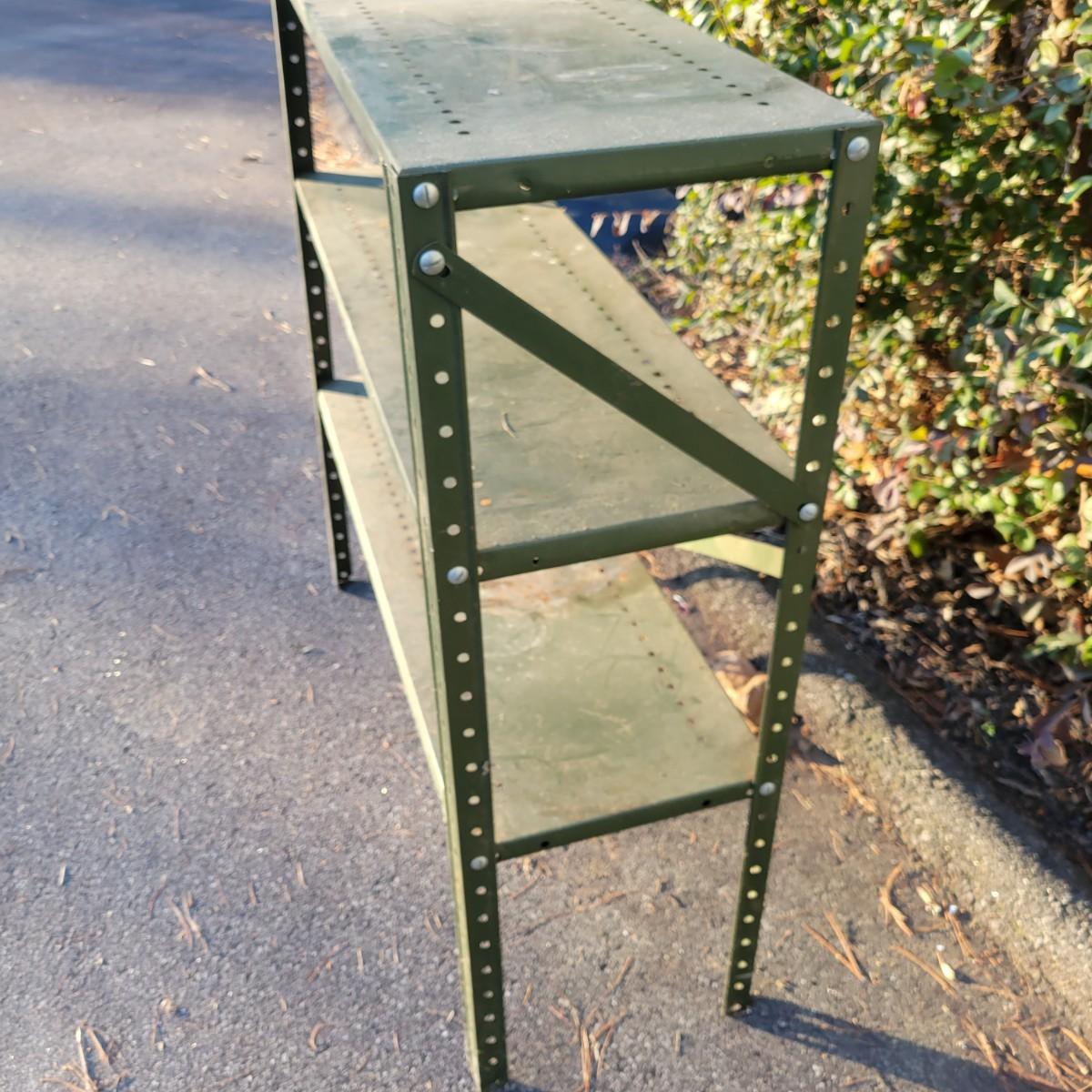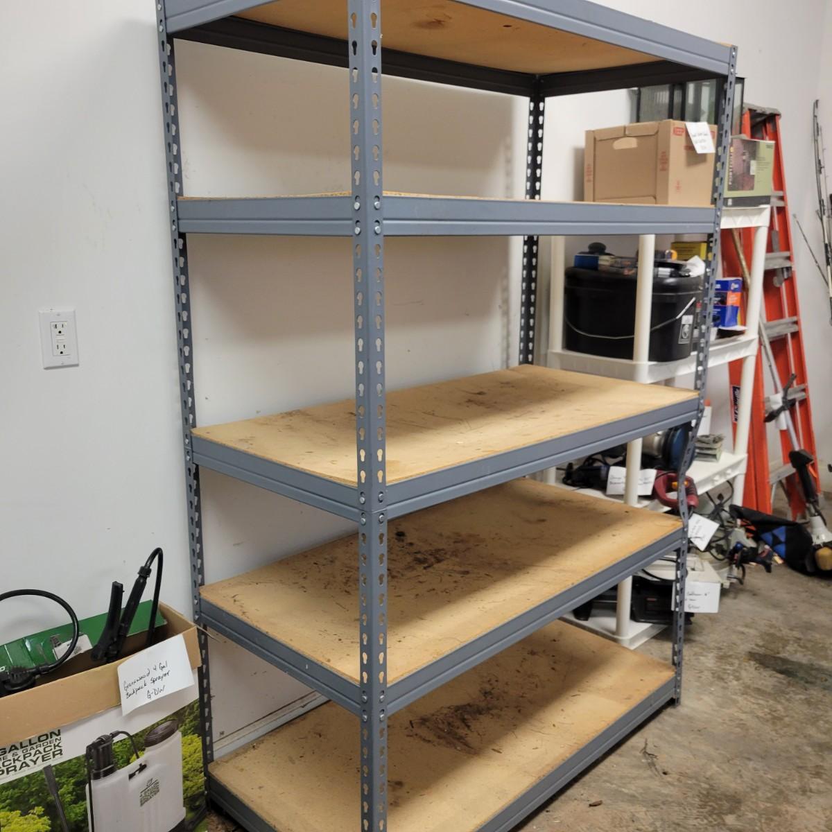 A modular metal and particle board shelving unit in fair condition. The particle board is warping notably, but could be easily replaced and the metal frame has a bent leg that could be potentially straightened out. Shelves are adjustable to different heights. Unit measures approximately 48.5" x 24.5" x 72". Lot also includes a smaller metal shelving unit in good condition with some rust. It measures approximately 36" x 12" x 37". Local pickup only. Winning bidder will need to bring assistance to move and load this item.