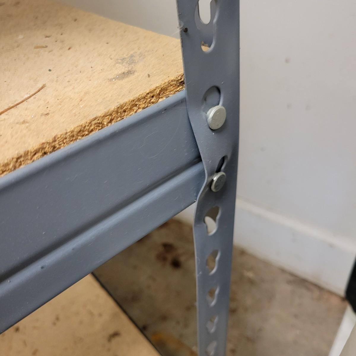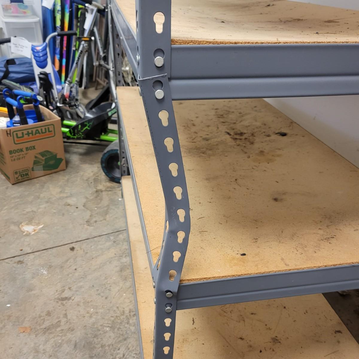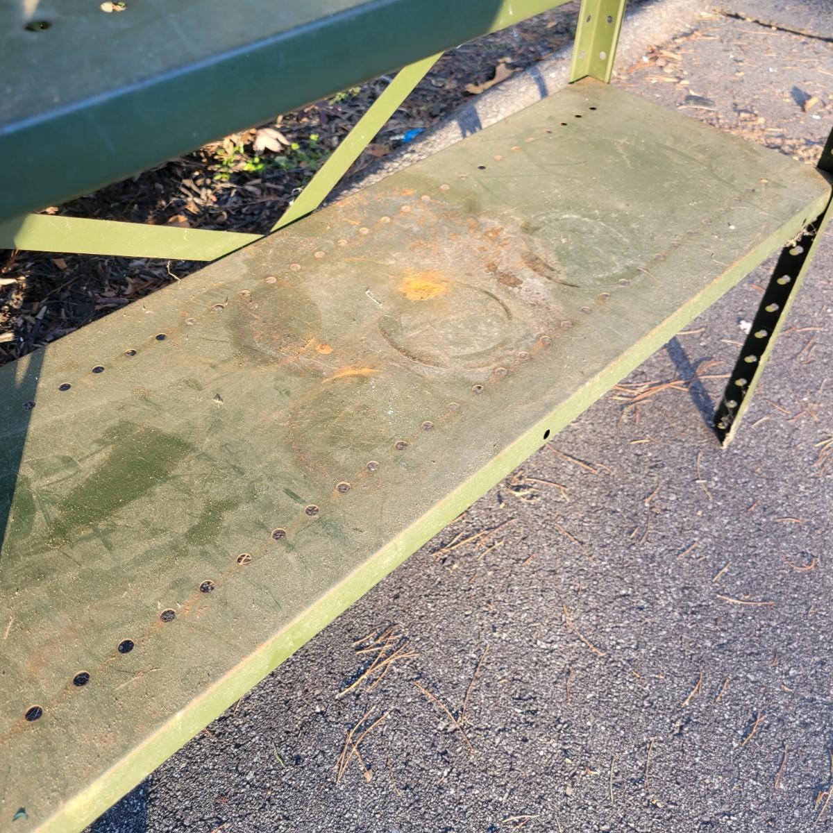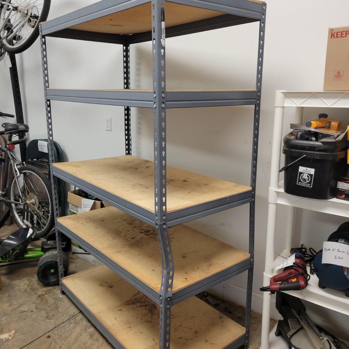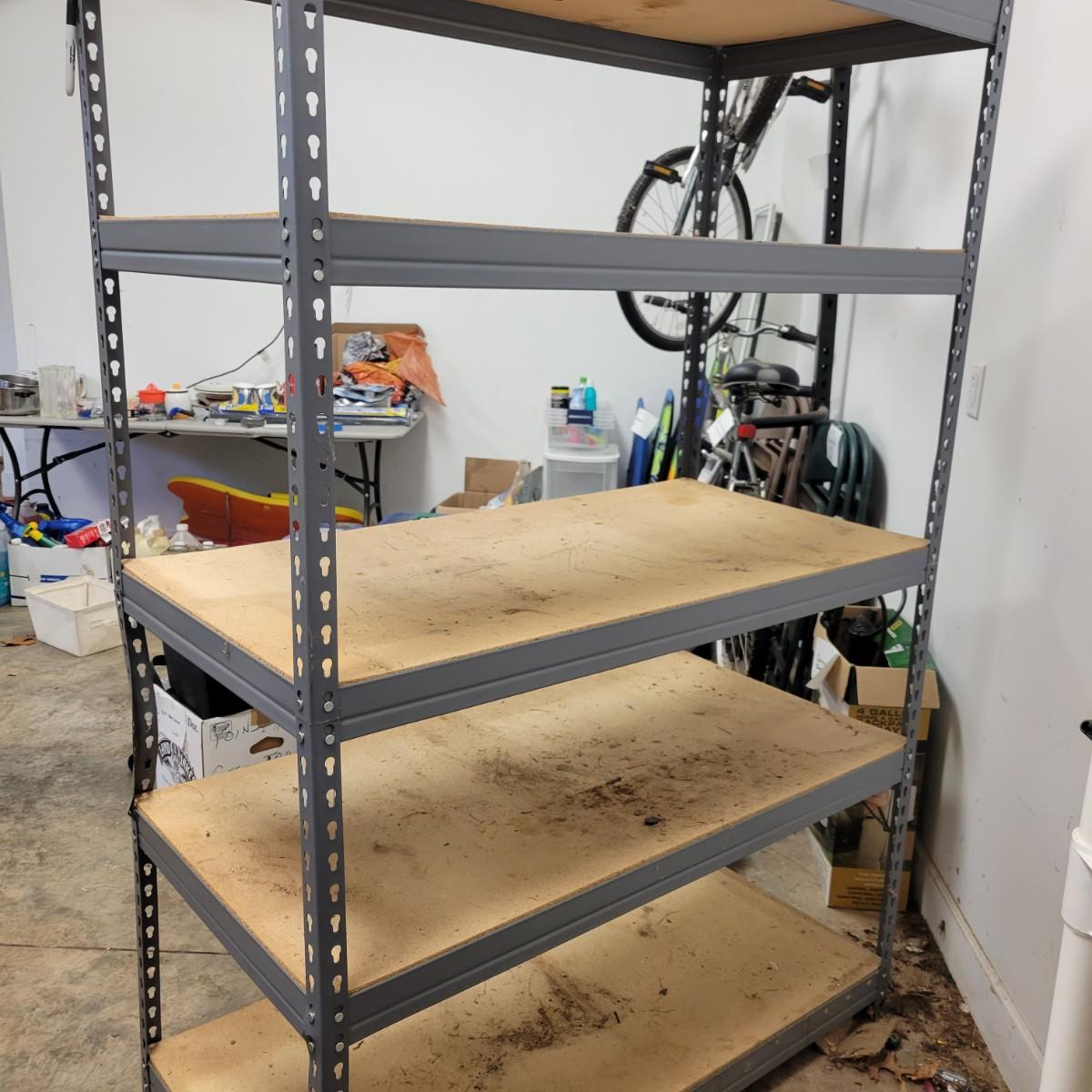 A modular metal and particle board shelving unit in fair condition. The particle board is warping notably, but could be easily replaced and the metal frame has a bent leg that could be potentially straightened out. Shelves are adjustable to different heights. Unit measures approximately 48.5" x 24.5" x 72". Lot also includes a smaller metal shelving unit in good condition with some rust. It measures approximately 36" x 12" x 37". Local pickup only. Winning bidder will need to bring assistance to move and load this item.