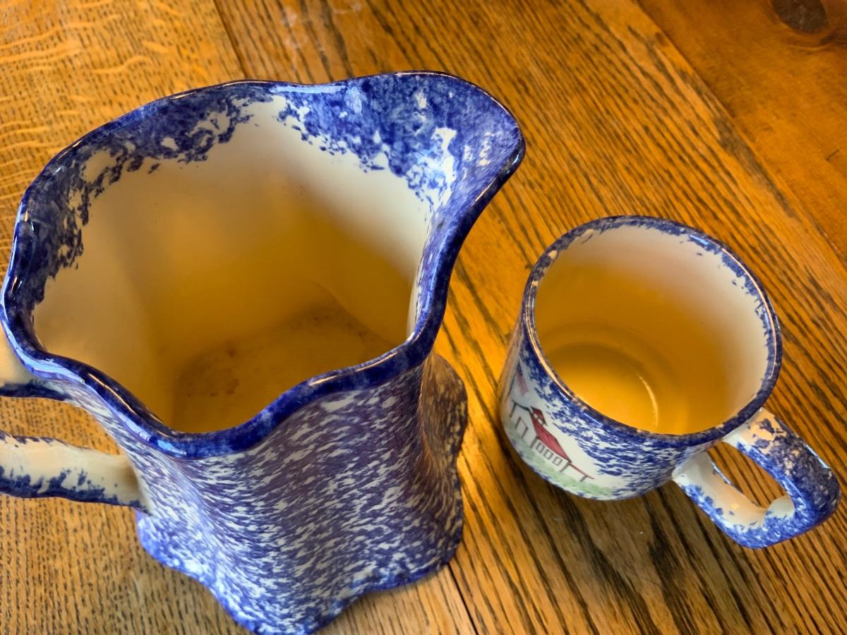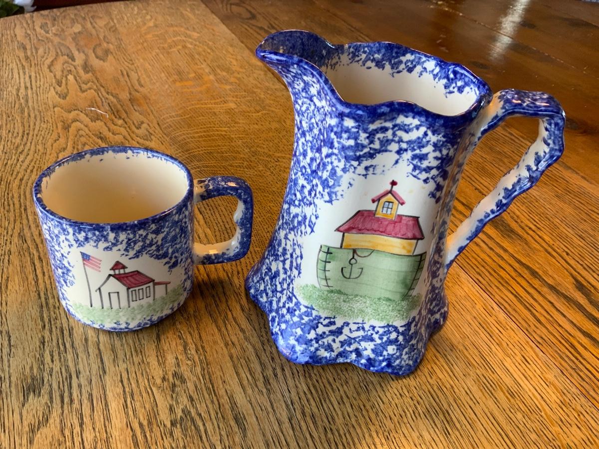 Molly Dallas Blue Spatterware RARE pattern Pitcher and patriotic cup. No chips.