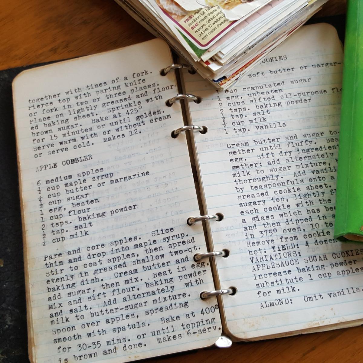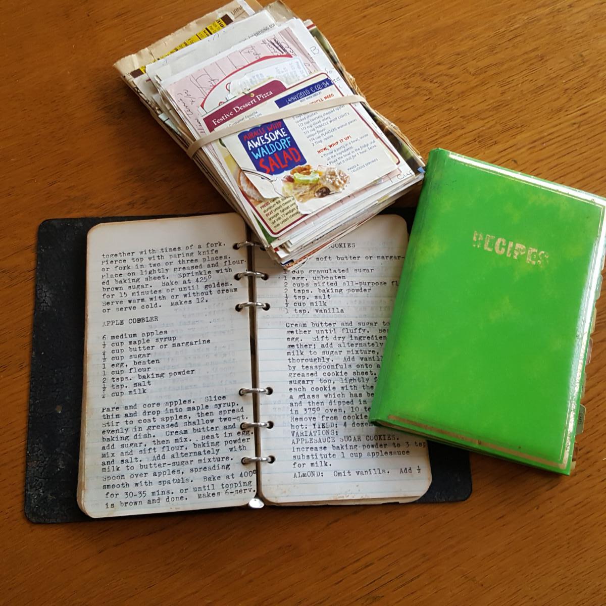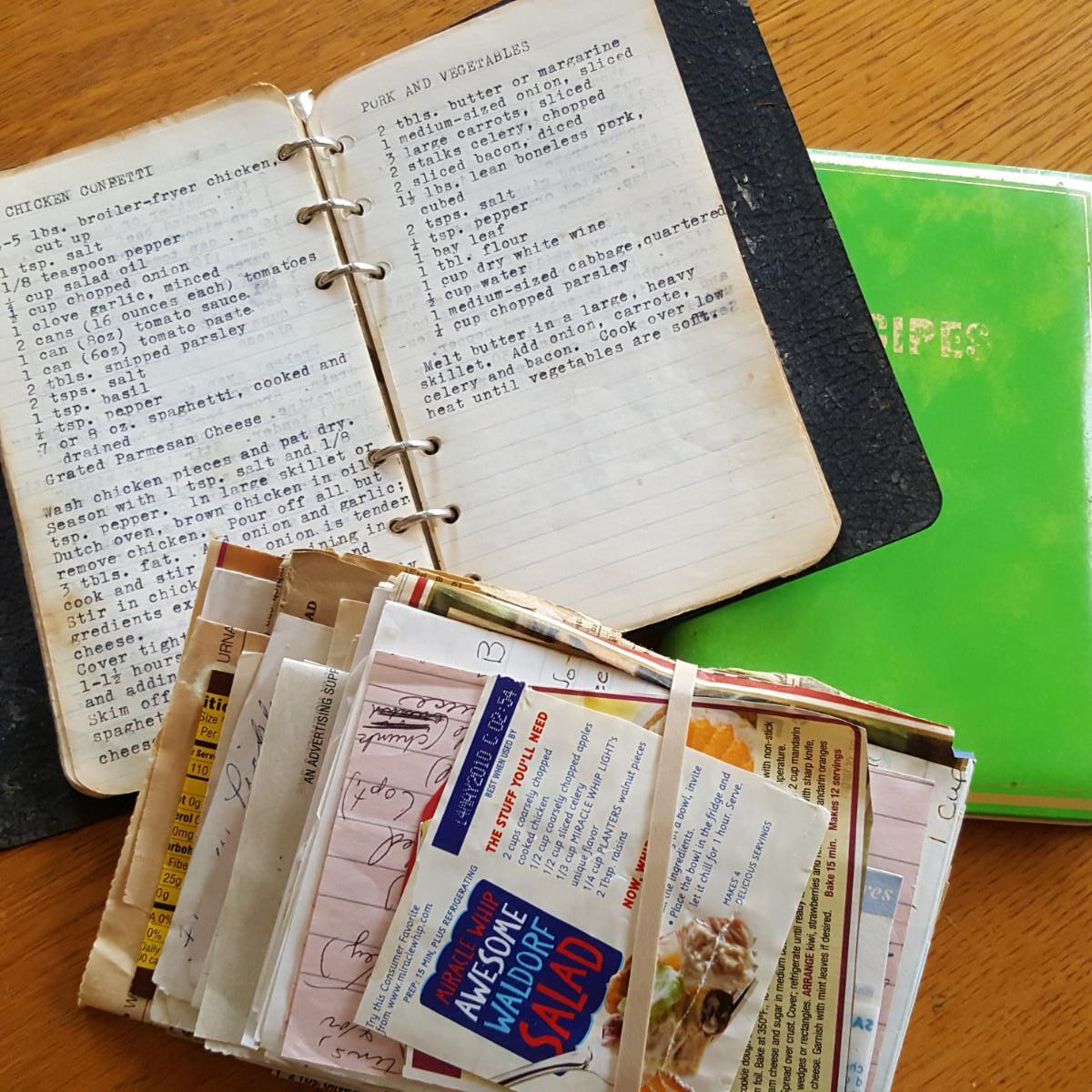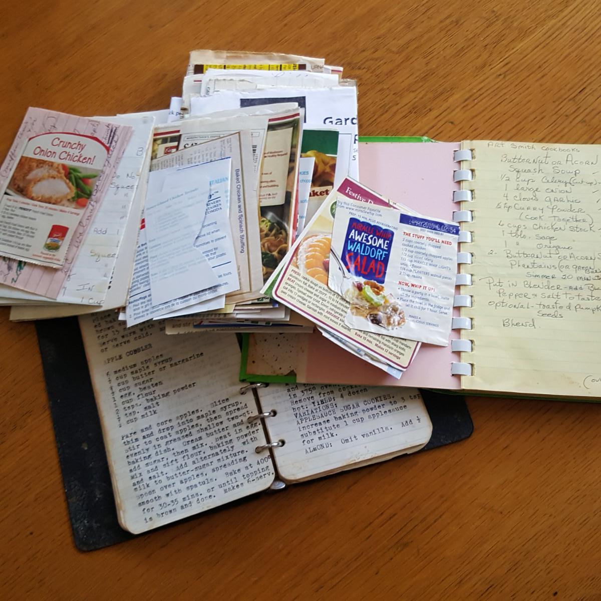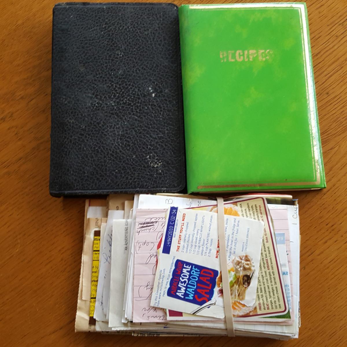 This auction lot is for a collection of Mom's Best Recipes. This lot came straight out of the kitchen drawer. One booklet is well typed and full of tasty offerings, the other is handwritten and then there is an inch-thick stack of recipes clipped from cans, bottles and boxes. What's for dinner?