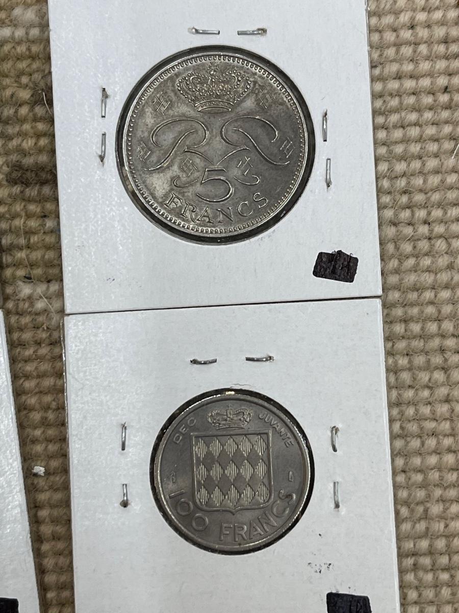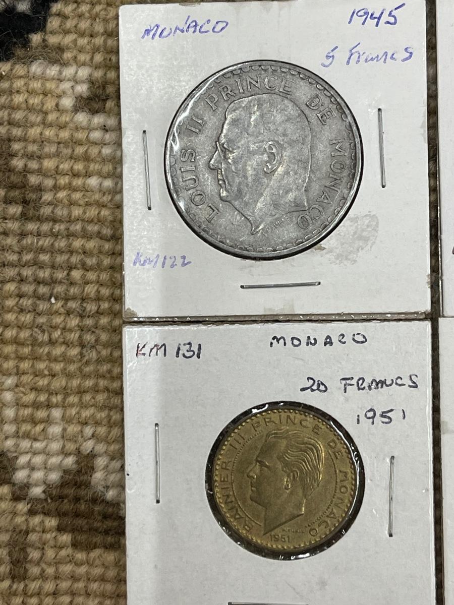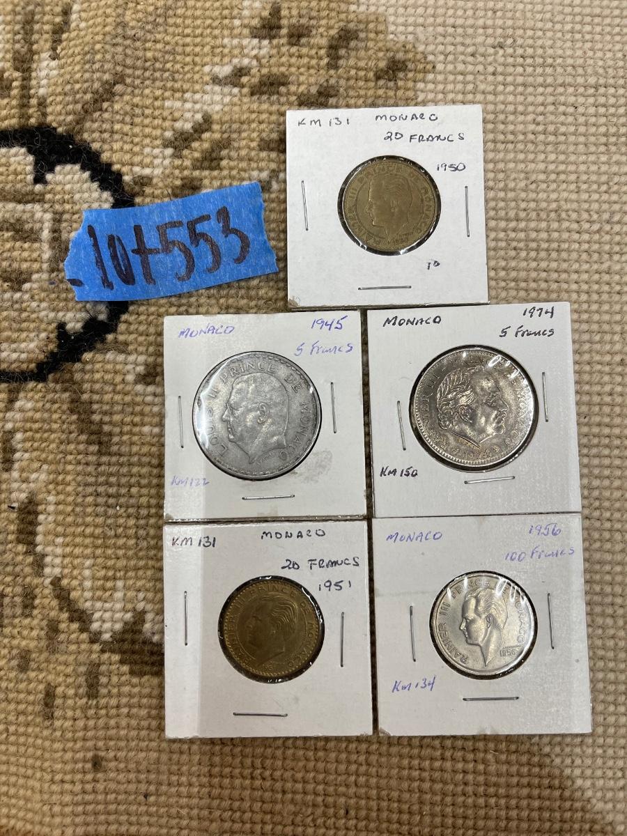 (5) vintage Monaco coins - 1950 20 francs, 1945 5 francs, 1974 5 francs, 1951 20 francs, 1956 100 francs.