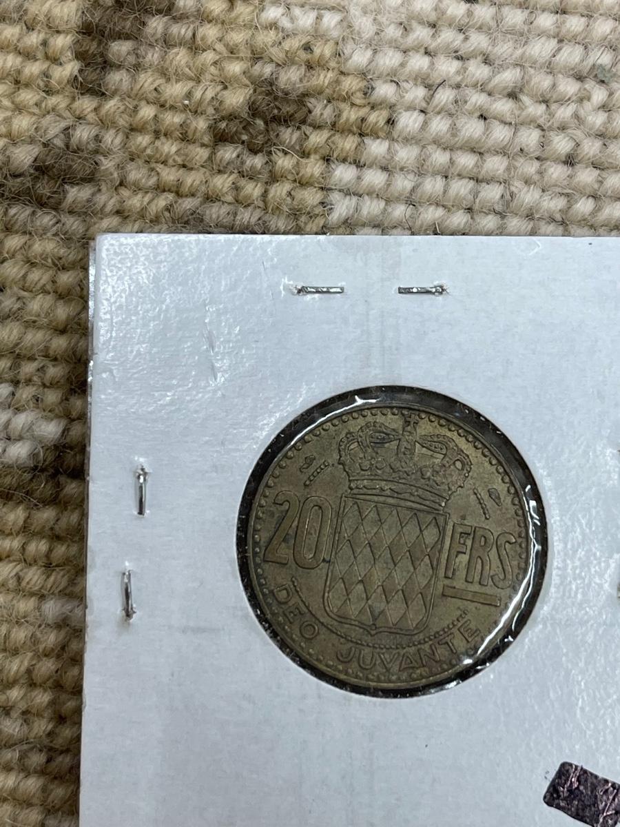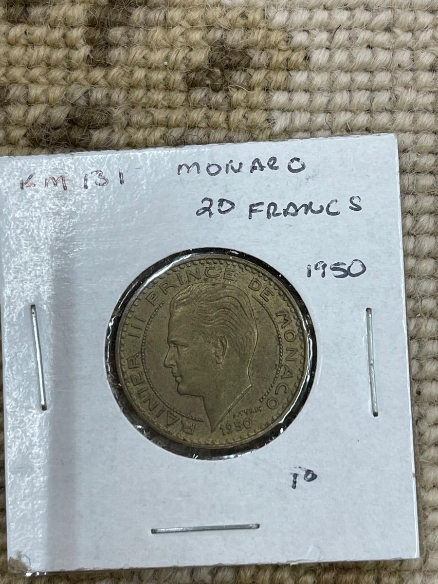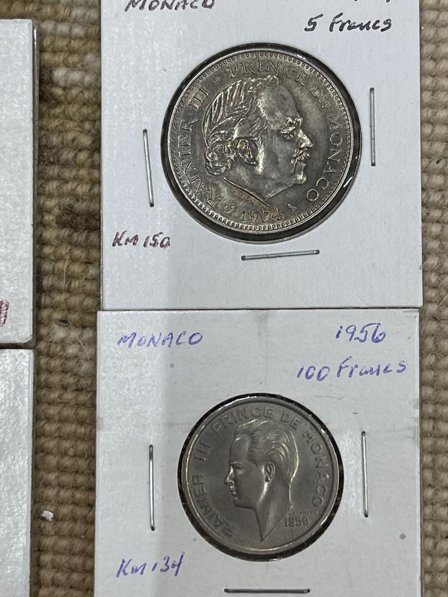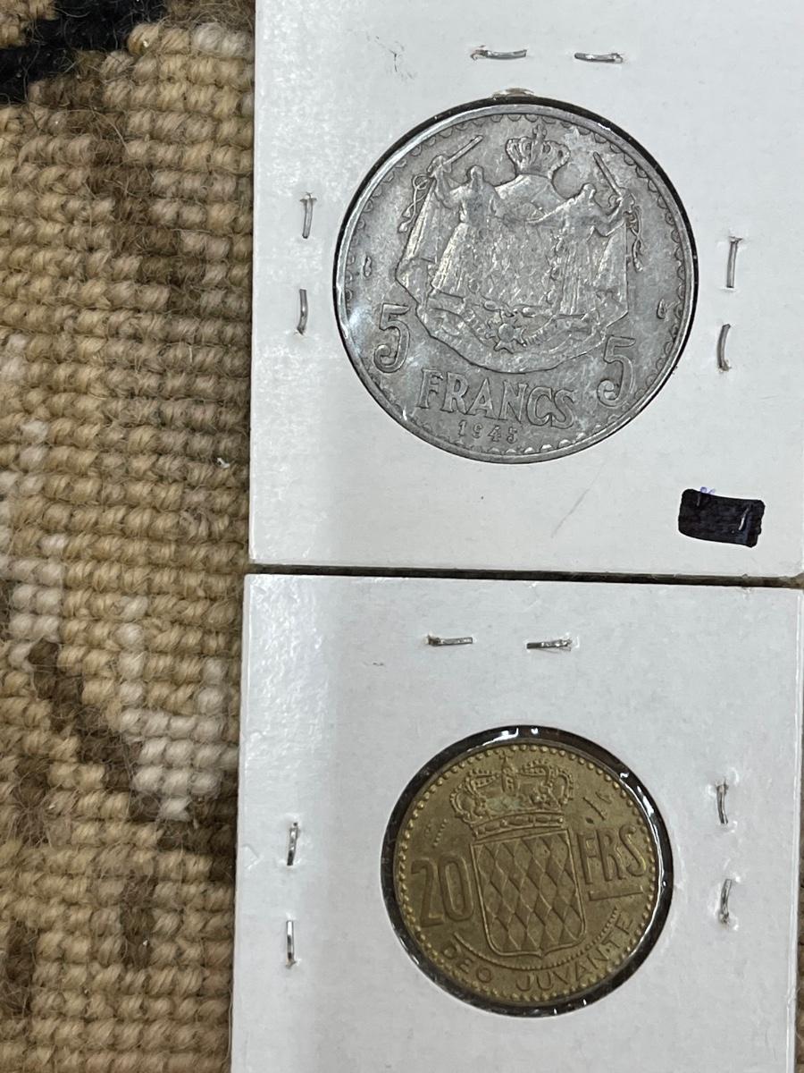 (5) vintage Monaco coins - 1950 20 francs, 1945 5 francs, 1974 5 francs, 1951 20 francs, 1956 100 francs.