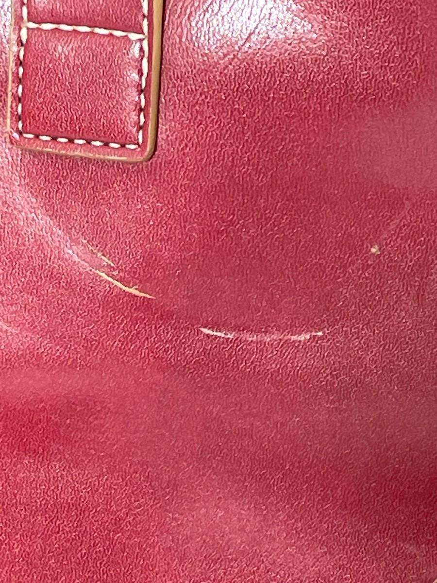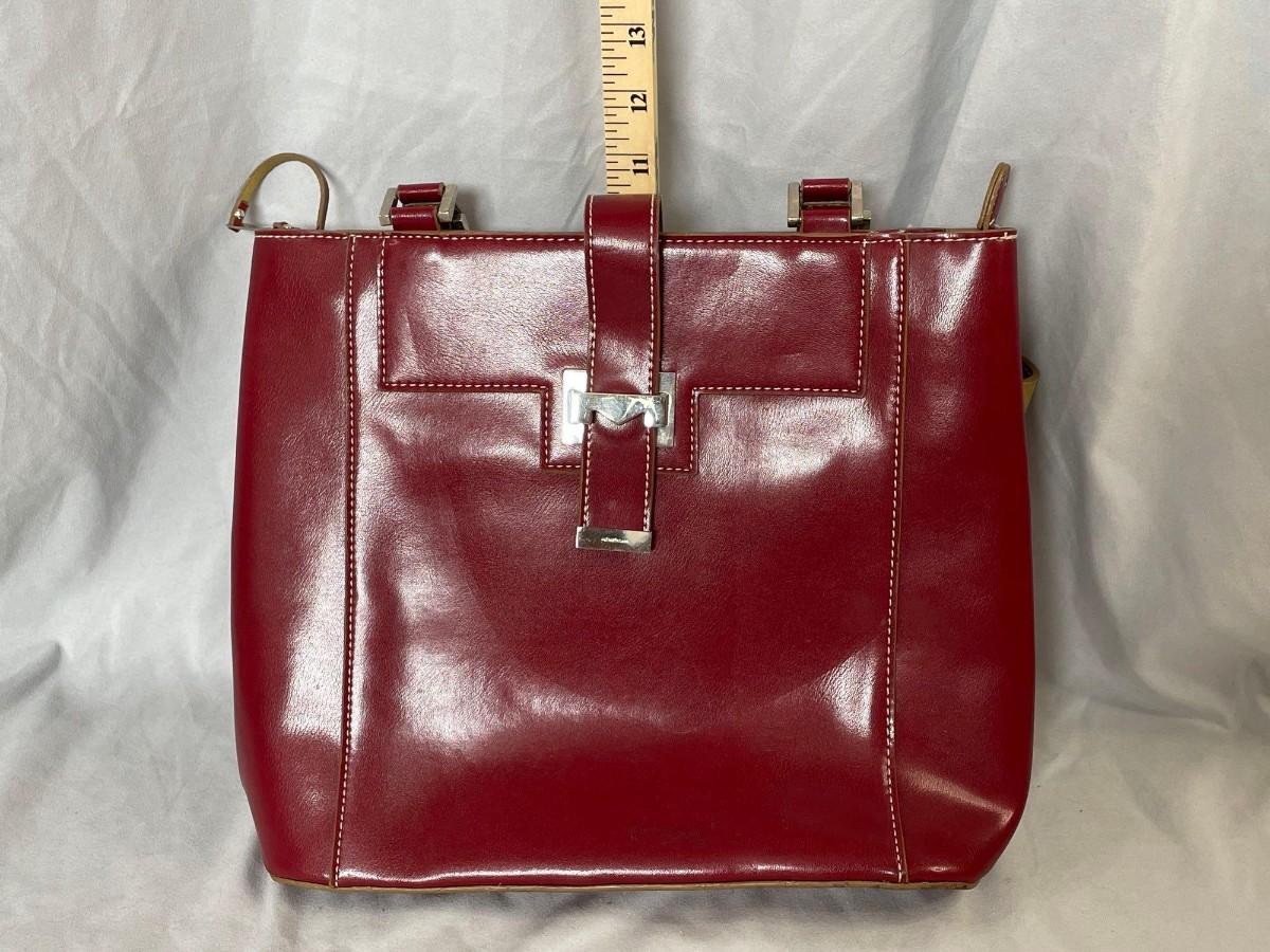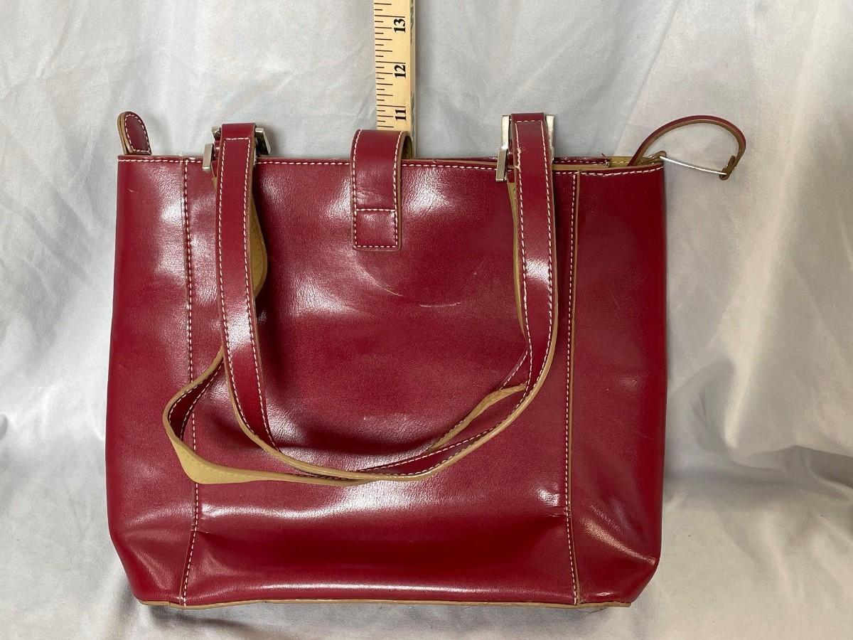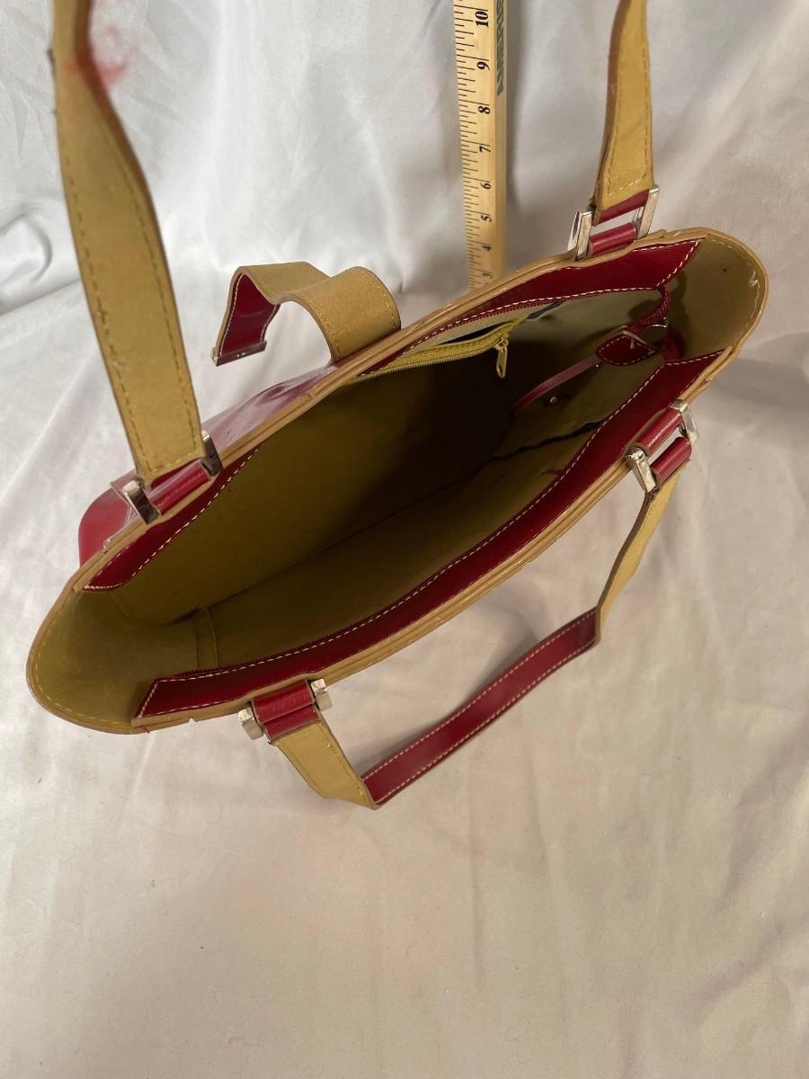 This purse is made of simulated leather, but has the look and feel of real leather. It is in like new condition and a chili pepper red color.<br />