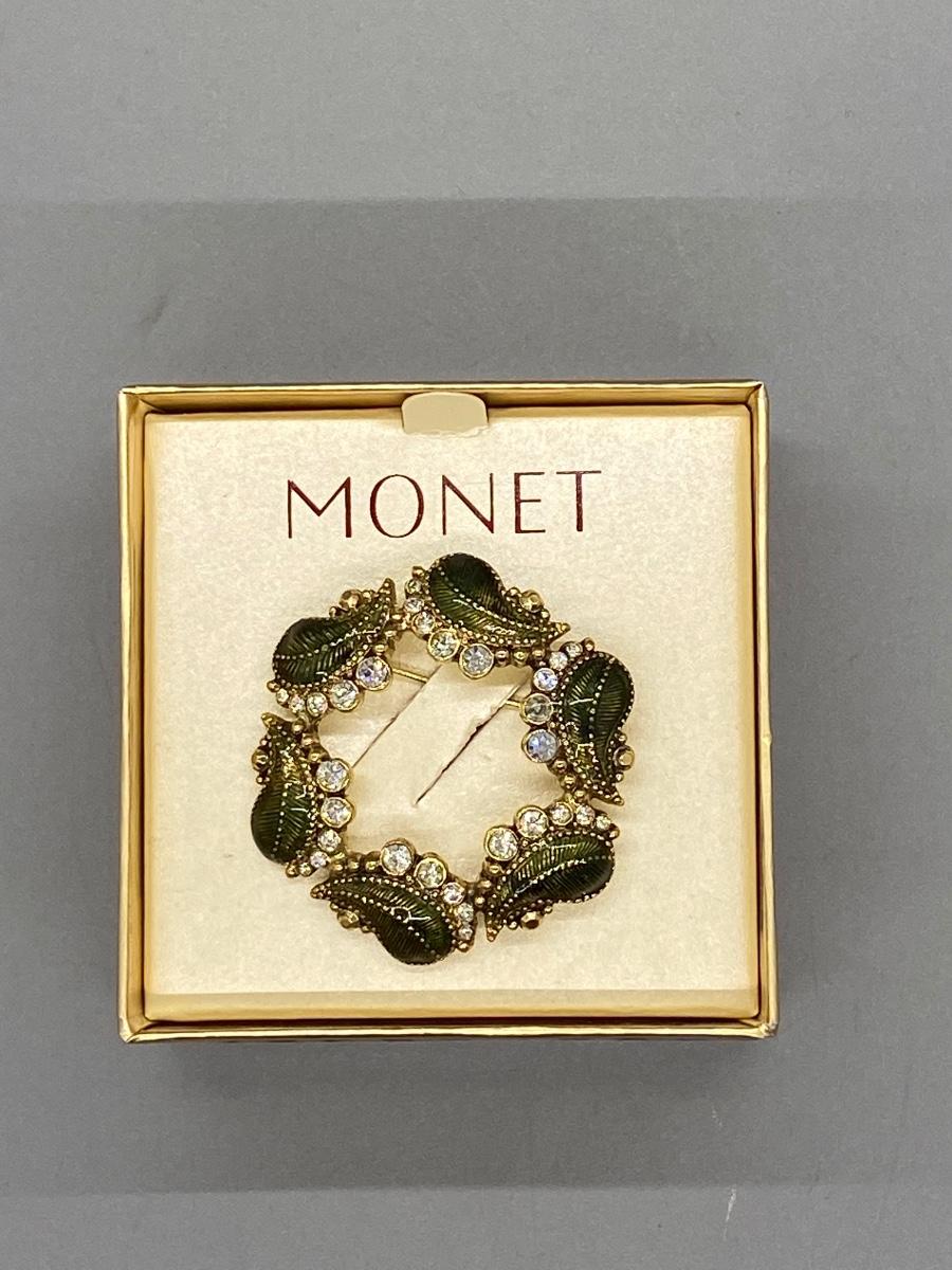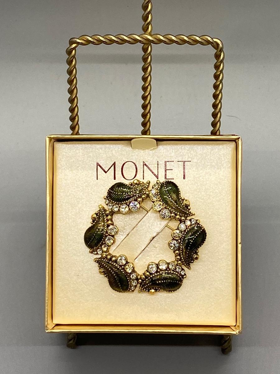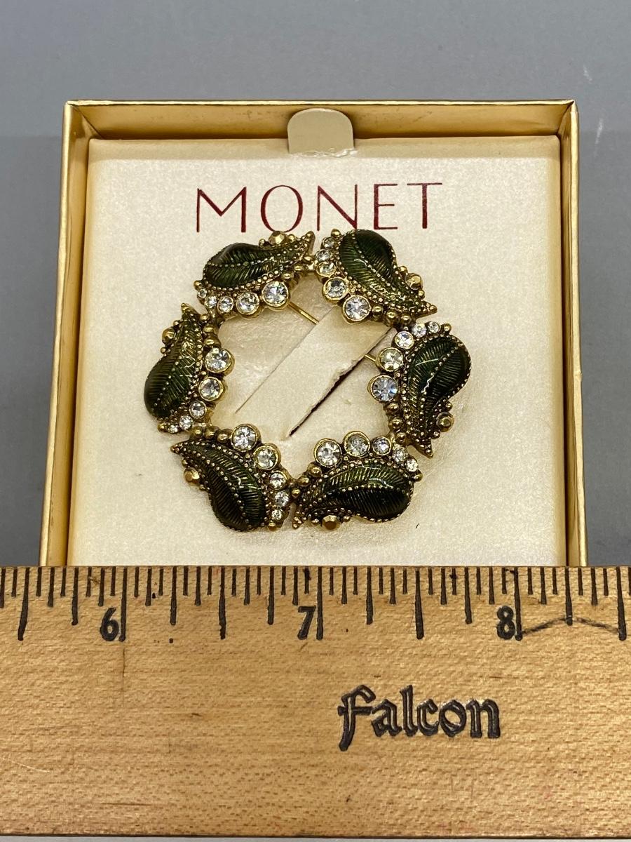 Monet wreath costume jewelry pin. Gold tone metal with rhinestone accent and green enamel leaves. In original box.