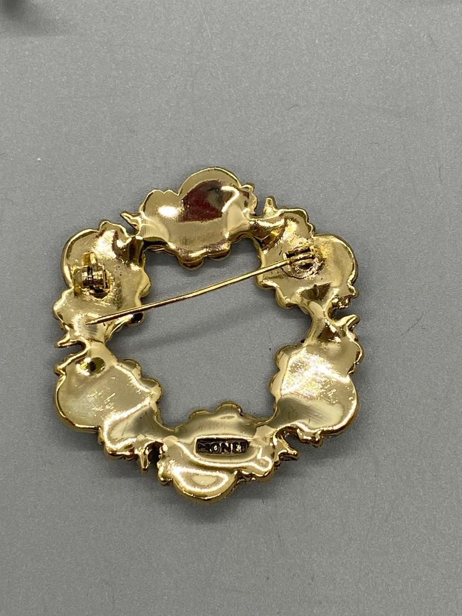 Monet Gold Tone Green Enamel & Rhinestone Wreath Brooch Pin Costume Fashion Jewelry