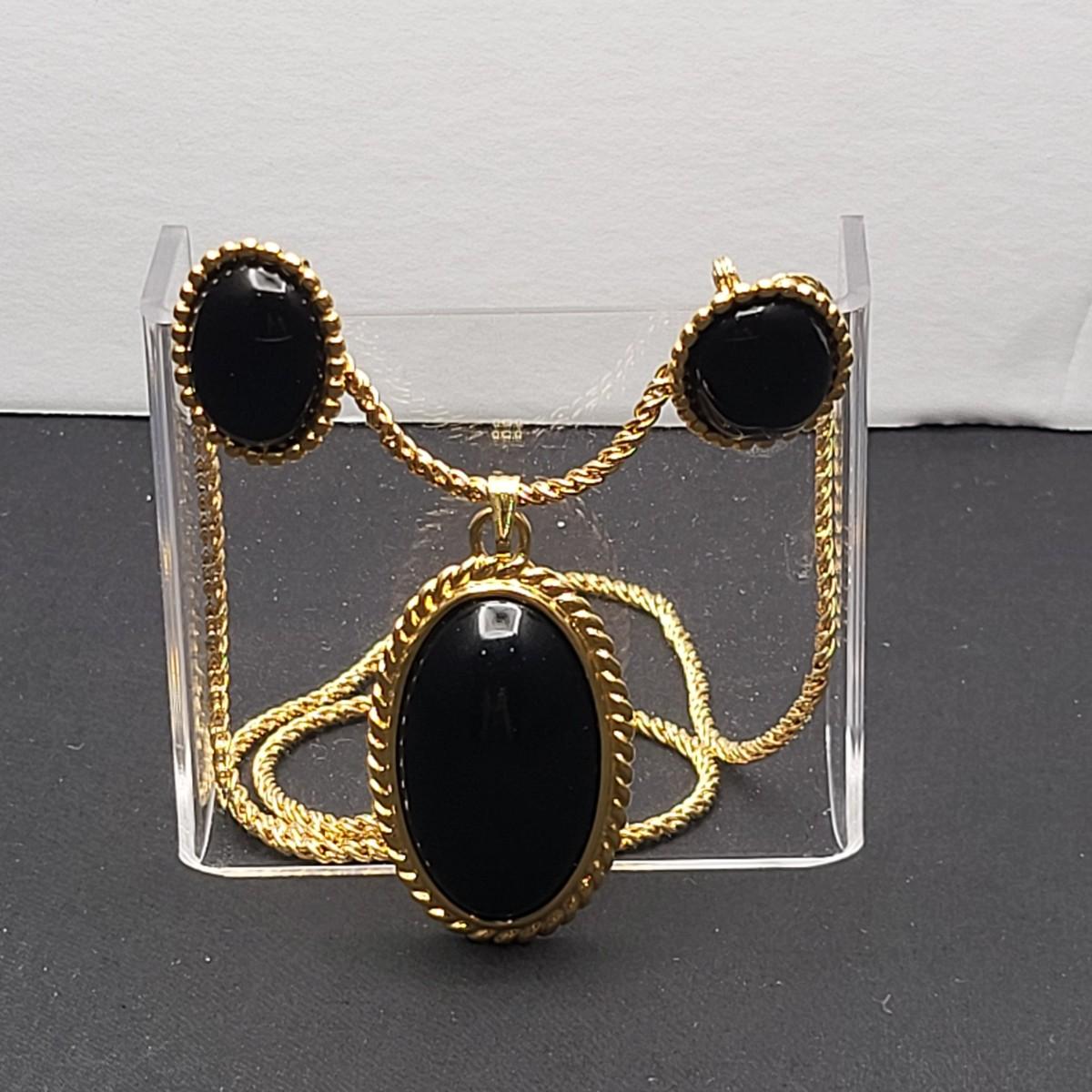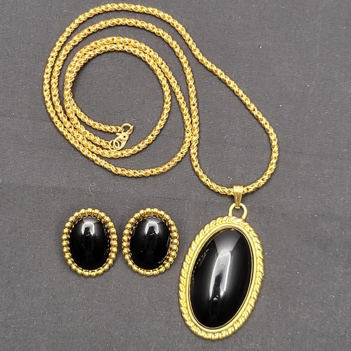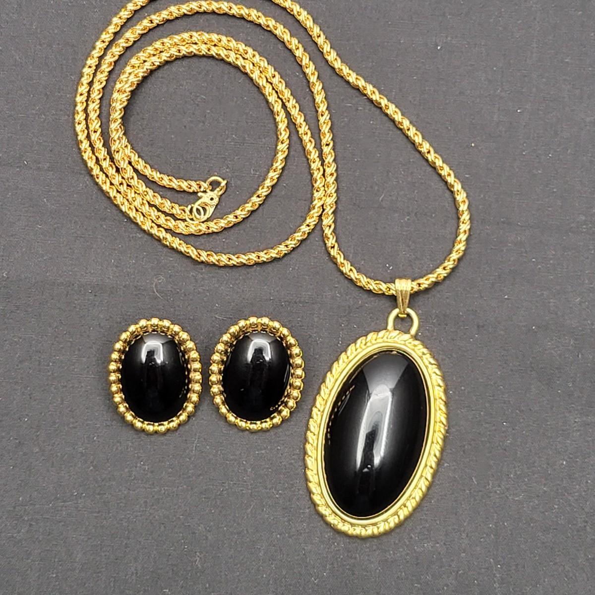 Gold tone and oval black thermoset inserts necklace and clip earring set by designer Monet. The unique twist chain is 27" long.